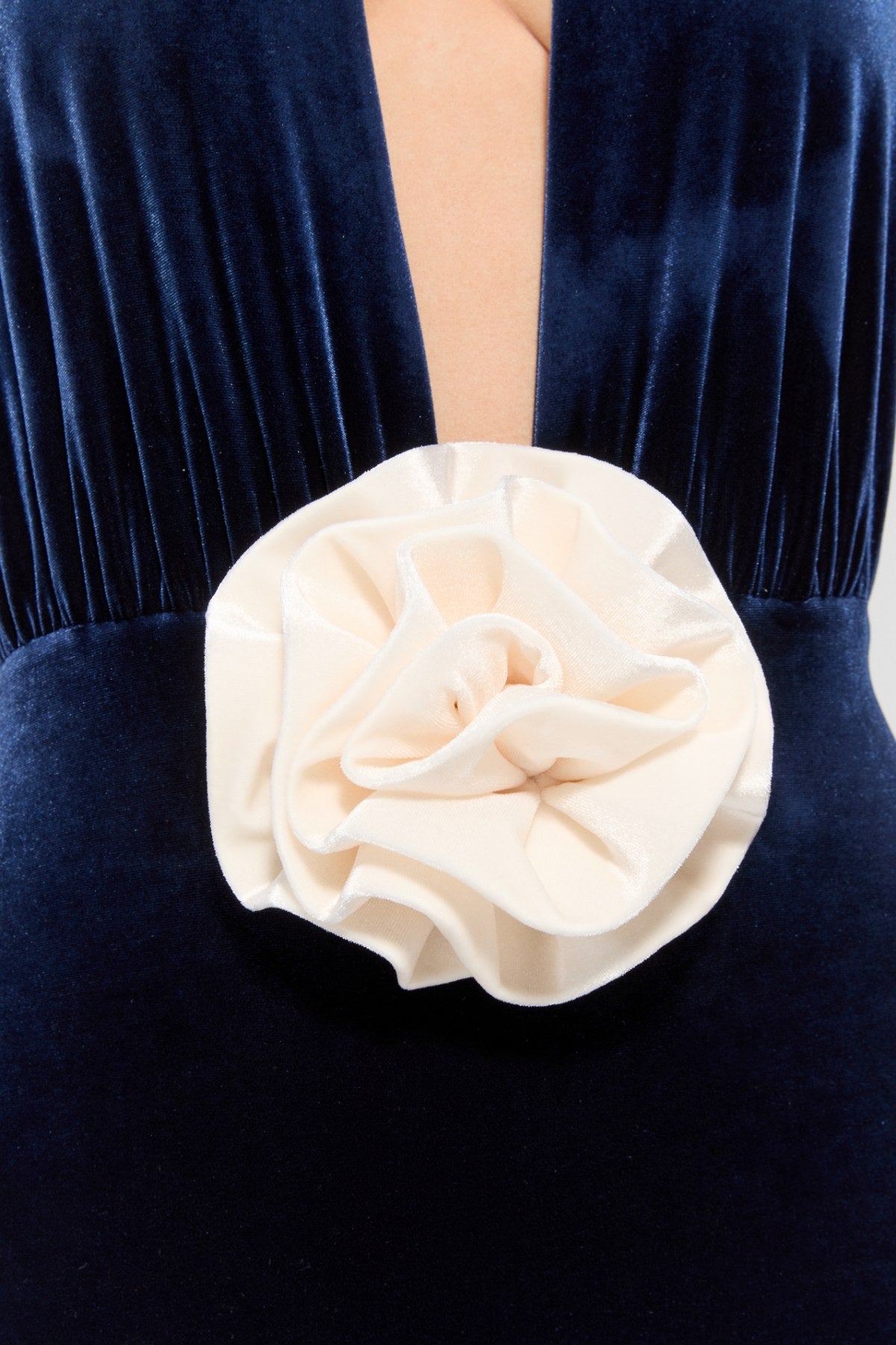 Derin V yaka tasarımı ve sırt dekoltesi ile şıklığı ve zarafeti bir araya getirirken, bel kısmında yer alan büyük çiçek detayı, elbiseye feminen bir dokunuş katıyor.