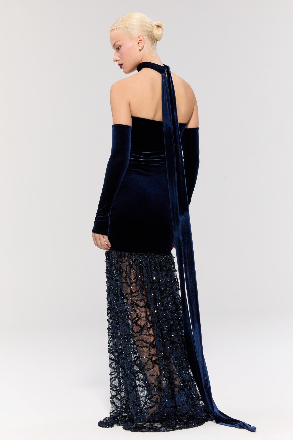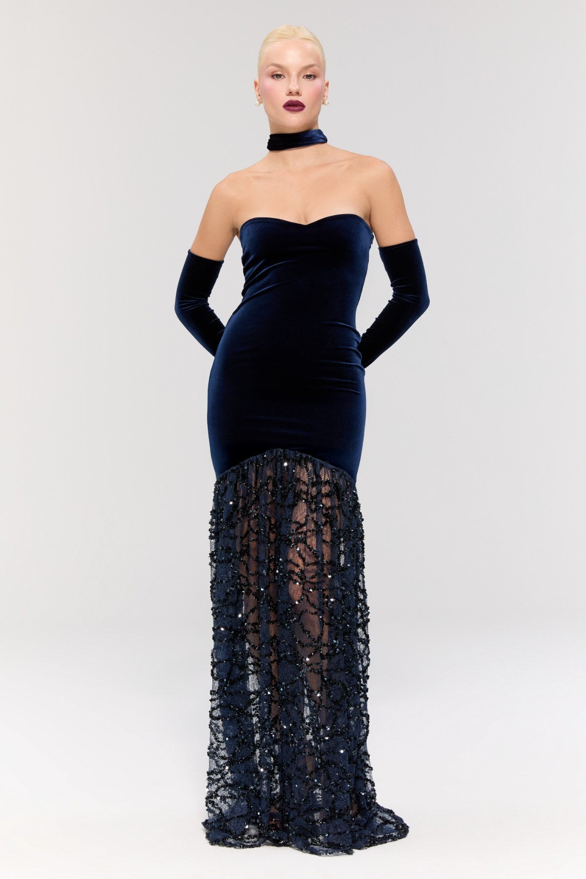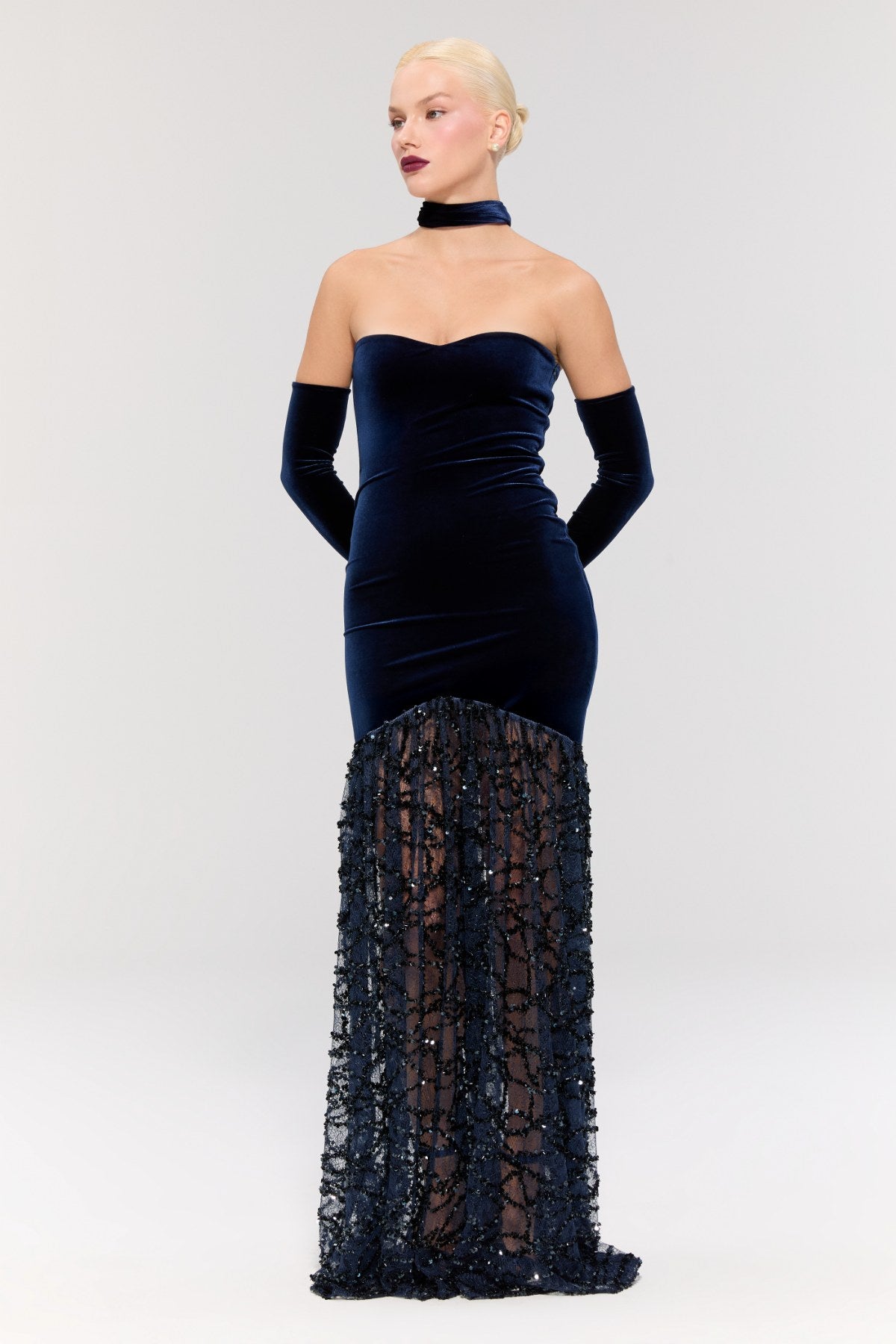 Straplez yaka kesimi omuzları zarifçe vurgularken, kadife uzun eldivenler tasarımı tamamlayarak şıklığı artırır.