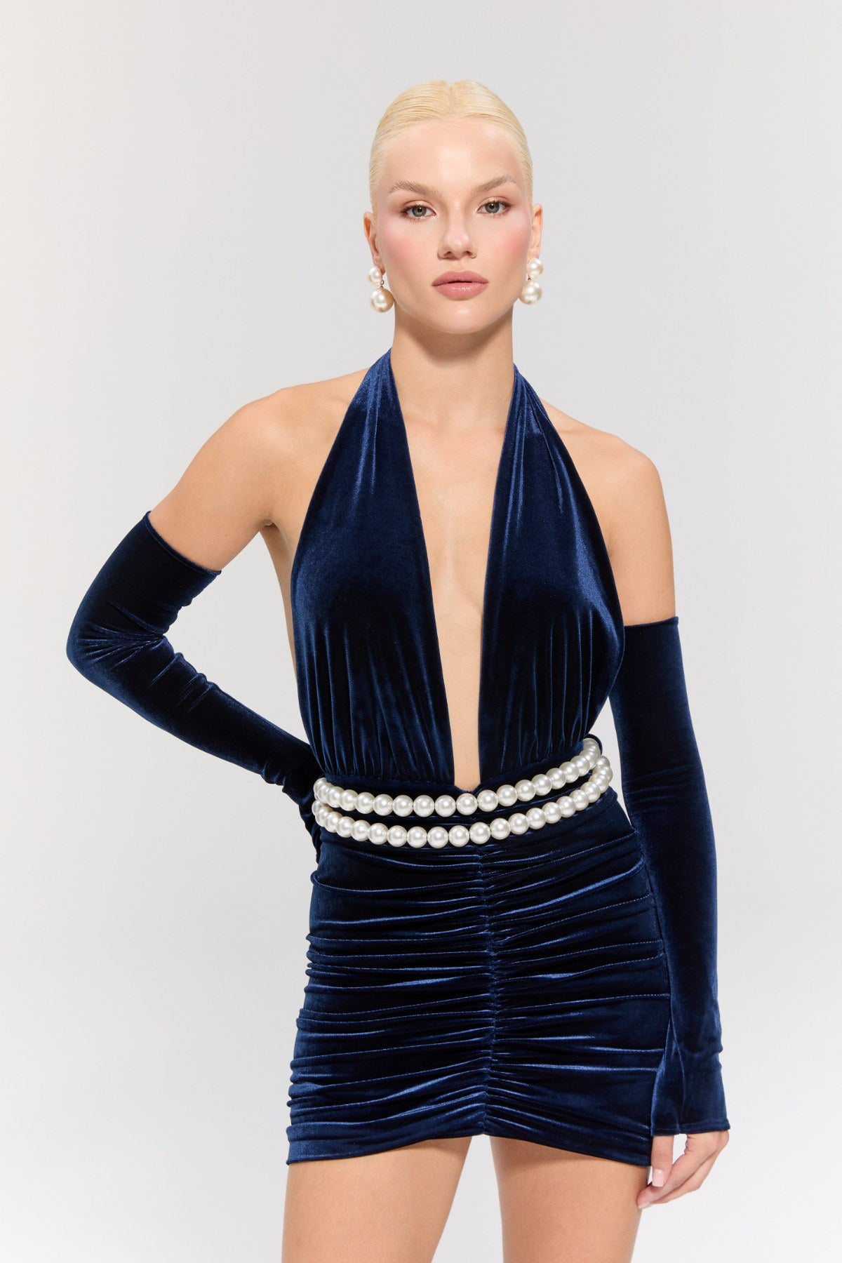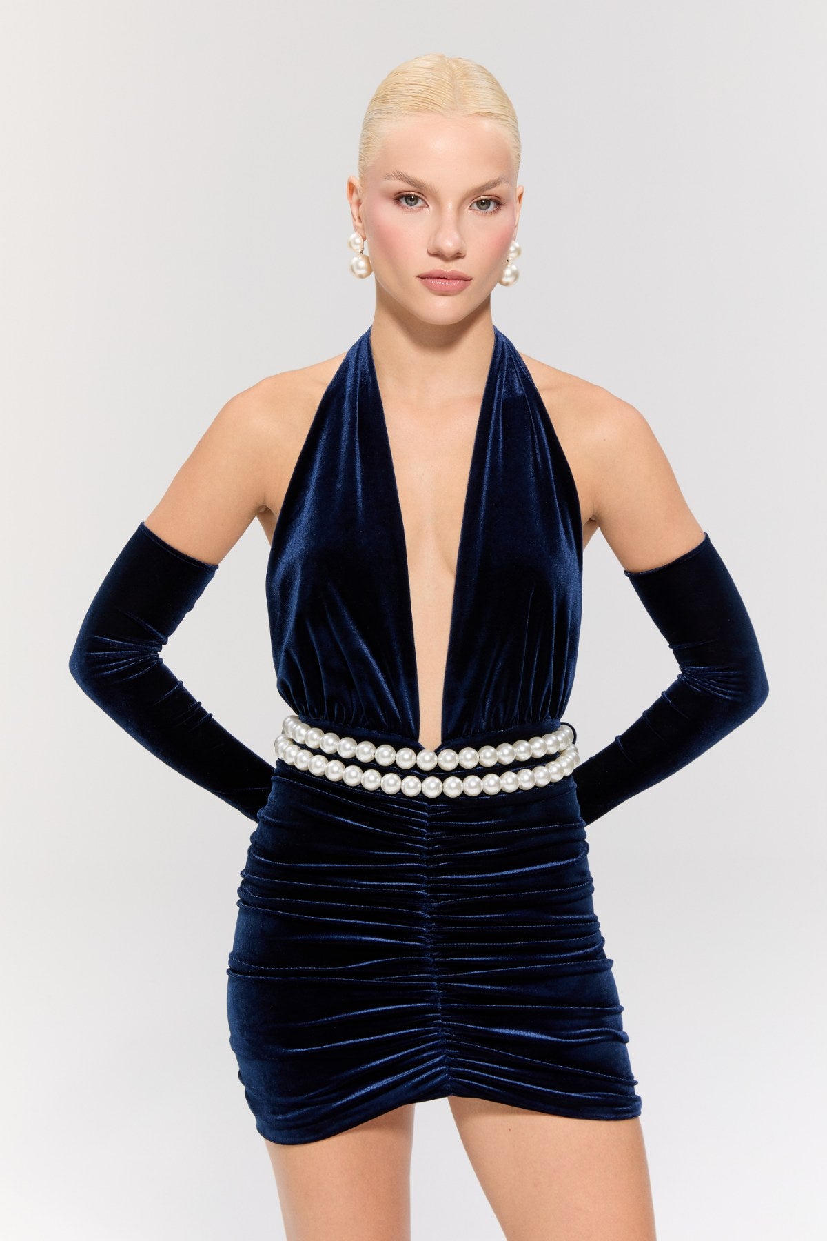 Kadife dokusu şıklık katarken, beldeki inci kemer zarif bir dokunuş sağlar.