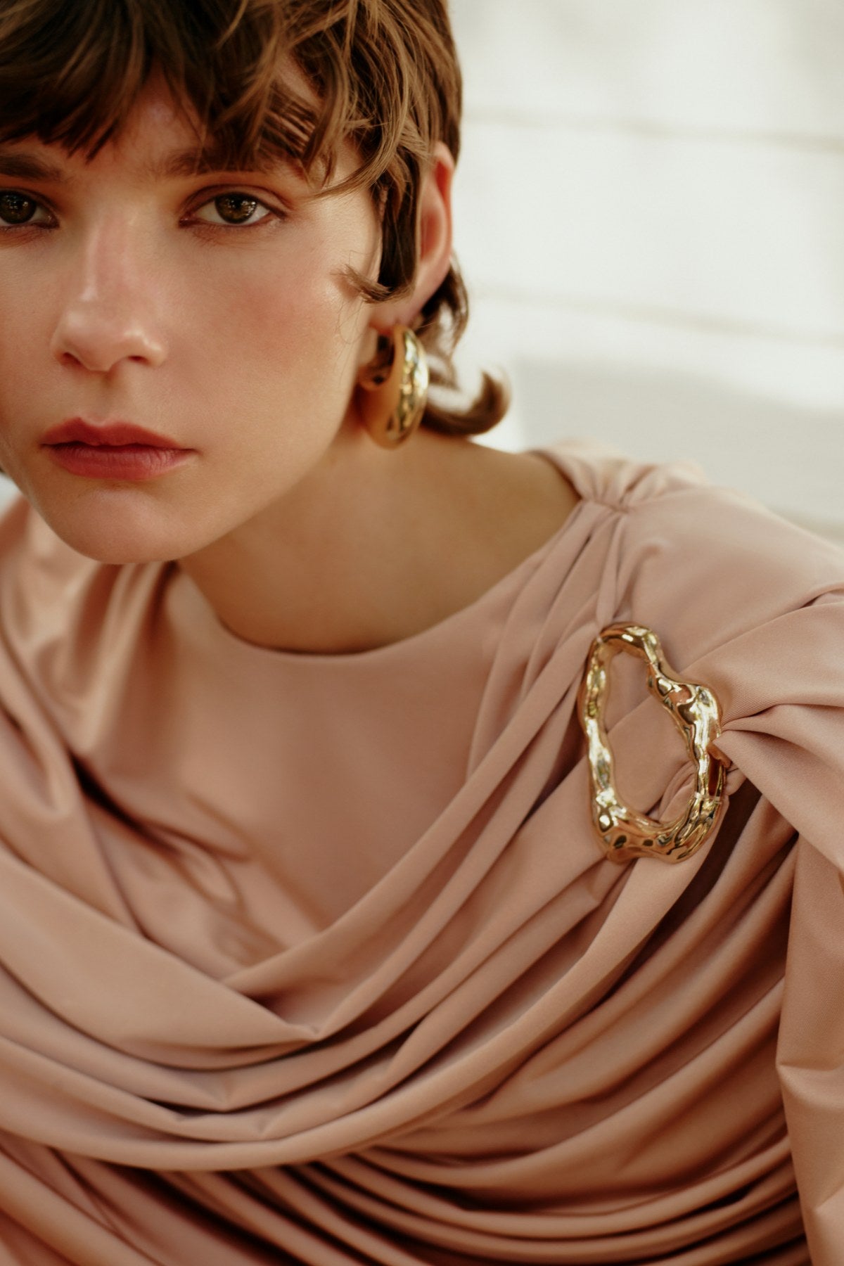 Teknik DetaylarModel: Drapeli mini elbiseKalıp: Vücuda oturan mini siluet, dramatik drape detaylıMateryal: MerchuryAstarlıdır.Detaylar:Omuzdan dökülen dramatik drape efektleriVücuda oturan, büzgülü mini kesimRahat ve esnek kumaş yapısıGizli arka fermuar kapamaUzunluk: MiniRenk: Soft nude / BEJ