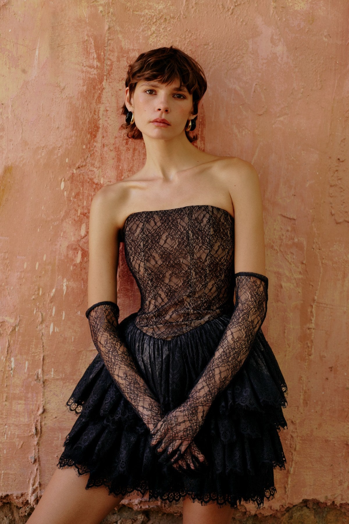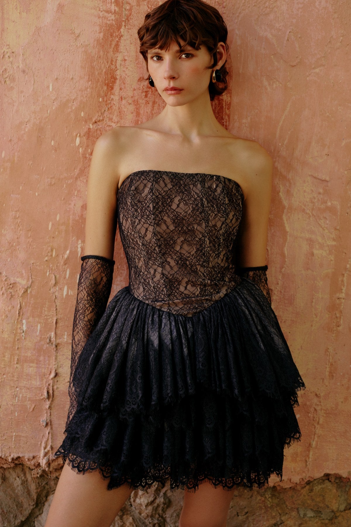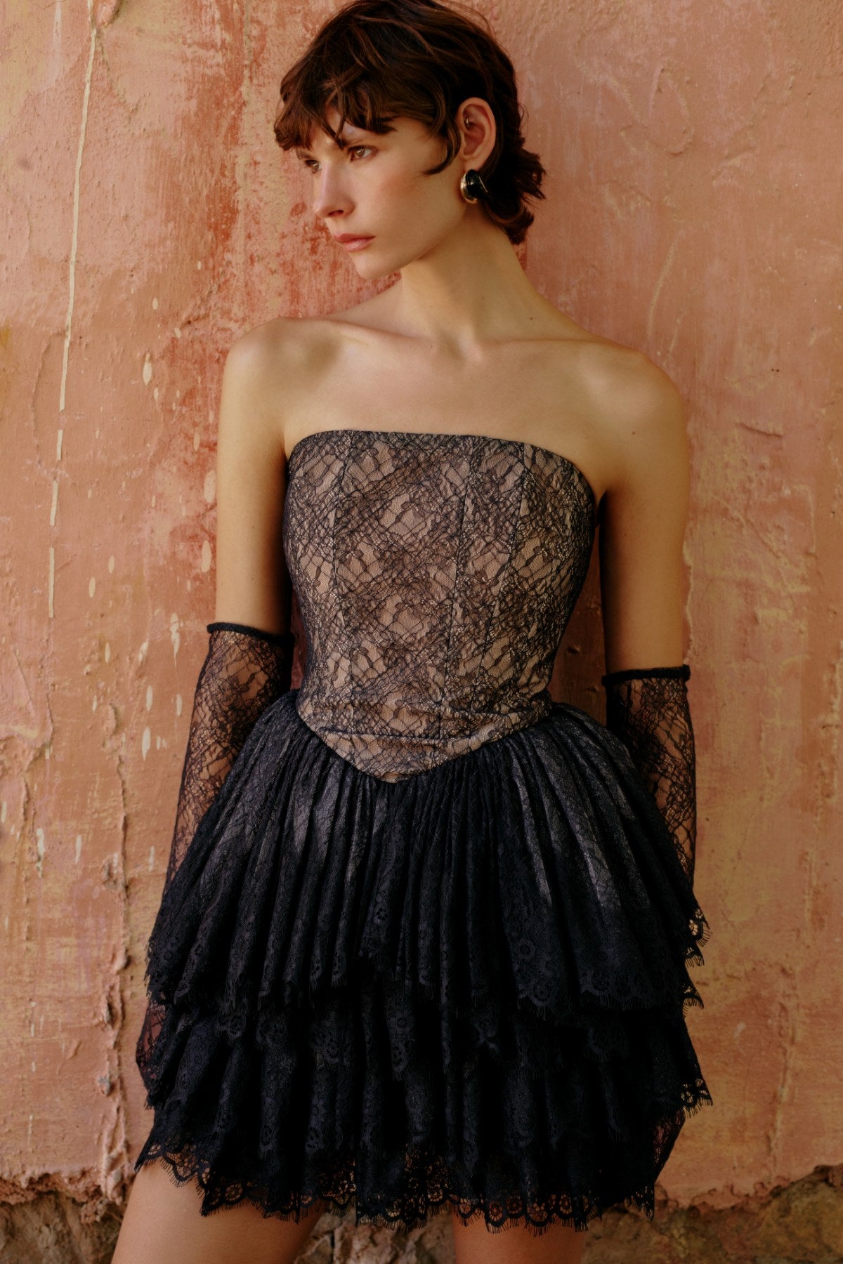 Teknik DetaylarModel: Straplez dantel üst + katlı mini fransız dantel etekKalıp: Fit straplez gövde, hacimli mini etekMateryal: Fransız dantelAstarlama: Nude tonlu astarDetaylar:Straplez düz gövde Fransız dantel kaplamalı Kat kat hacimli mini dantel etek Gizli arka fermuar kapamaUzunluk: MiniRenk: Siyah