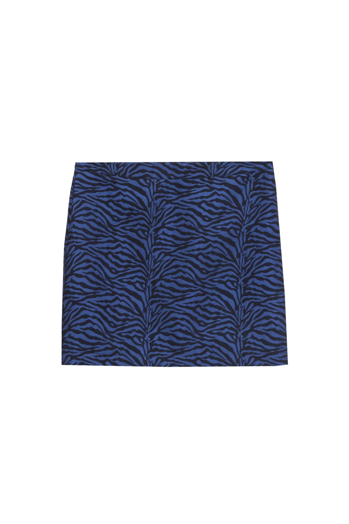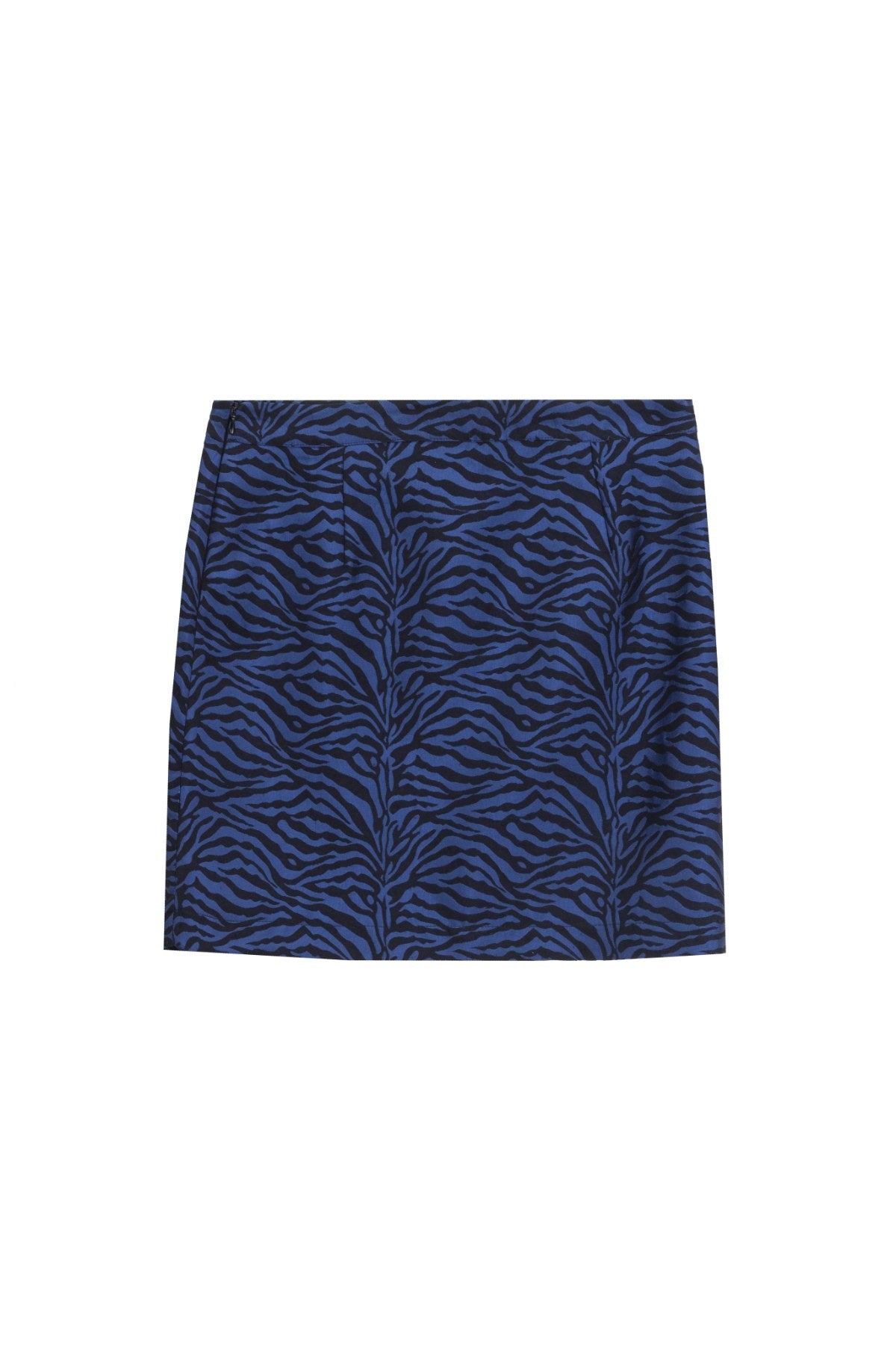Mavi tonlarında, kısa boy ve kloş kesime sahip, uçuşan yapısıyla enerjik bir etek modelidir. Üretim yeri: Türkiye.