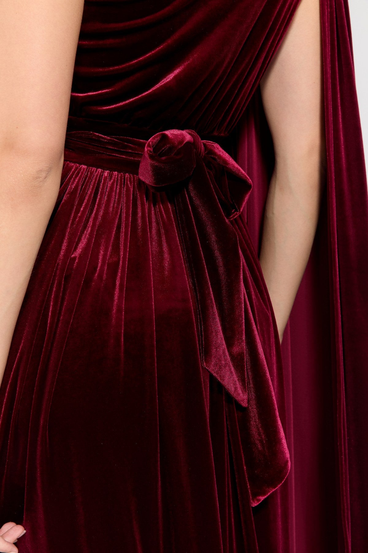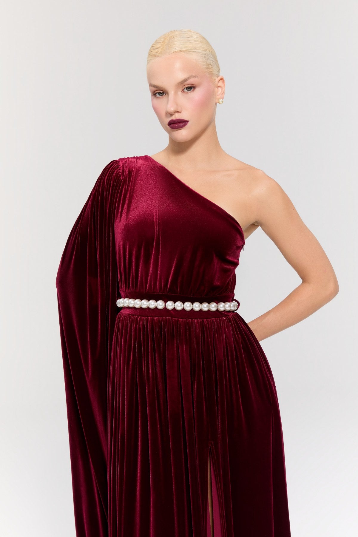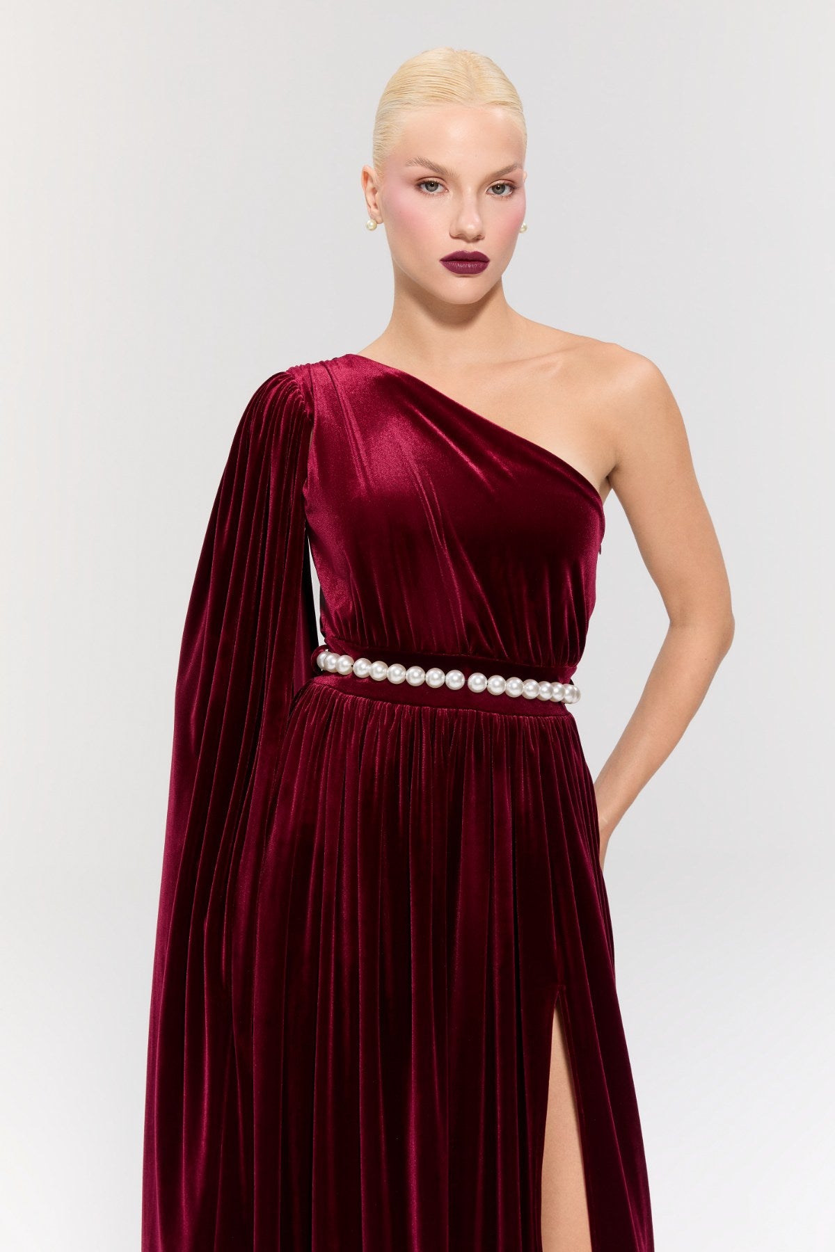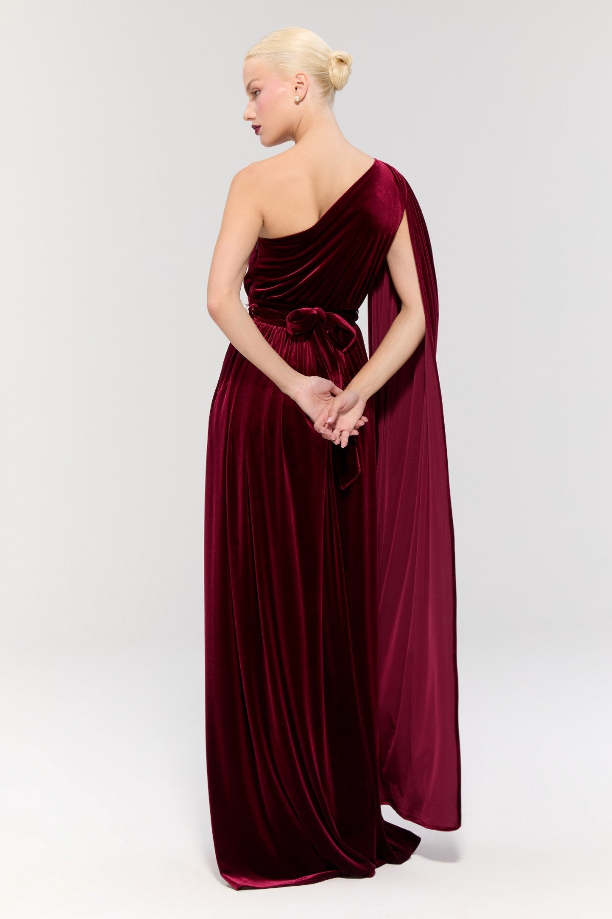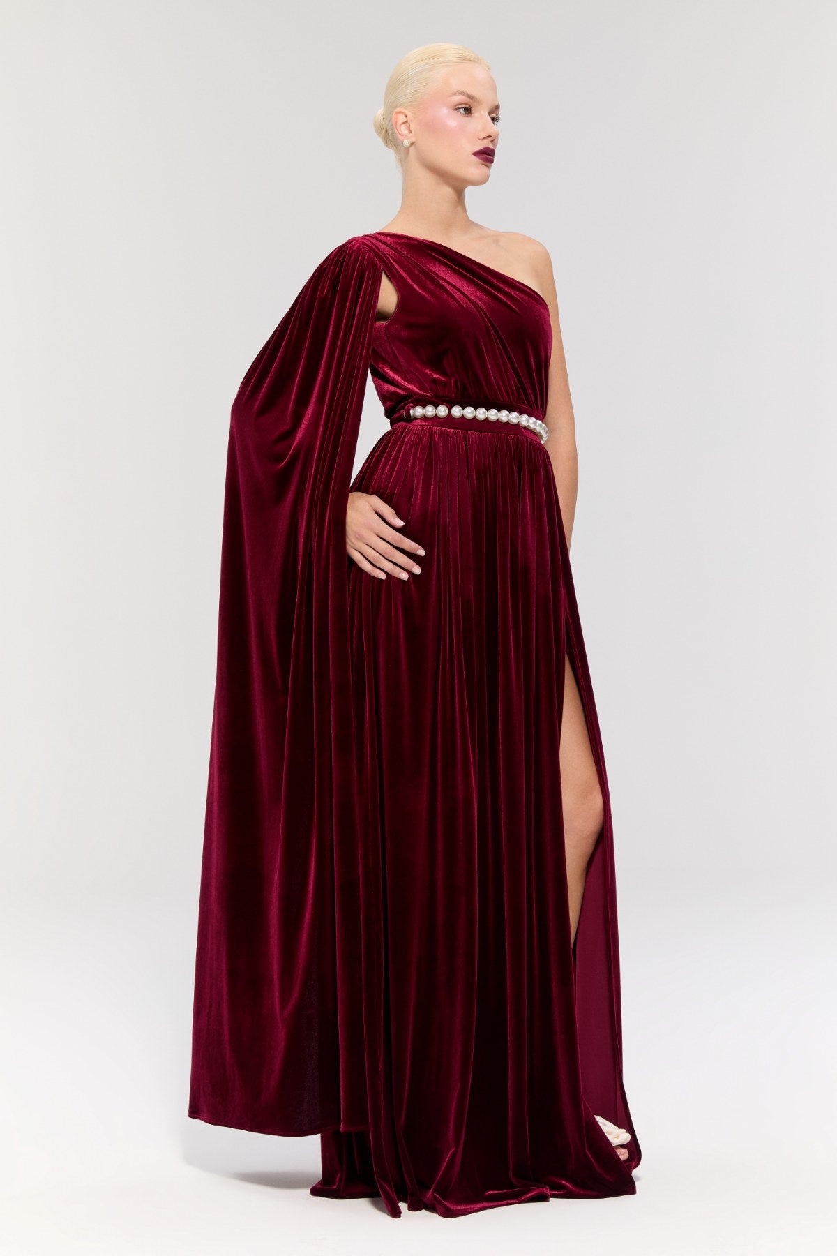 Elbise, bordo kadife kumaşı ve tek omuzdan dökülen uzun pelerini ile sofistike ve zarif bir silüet sunar.