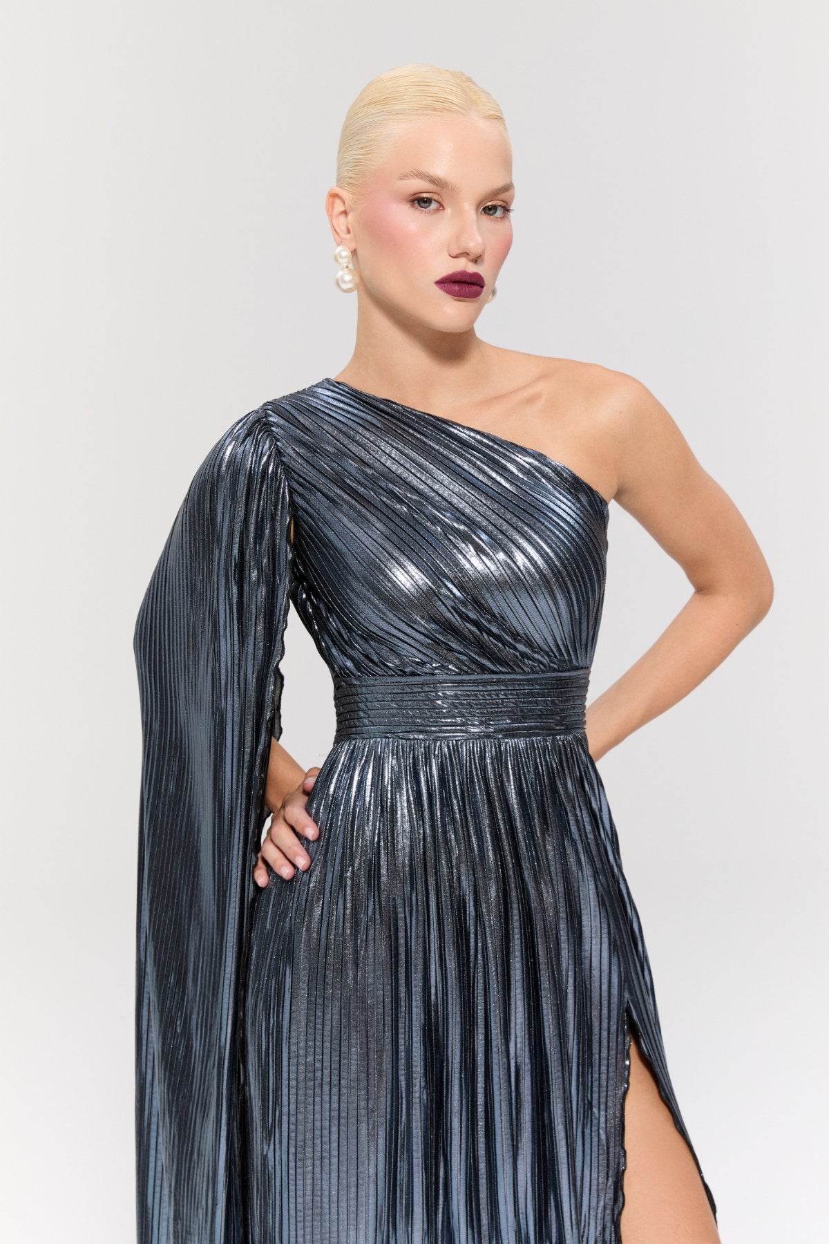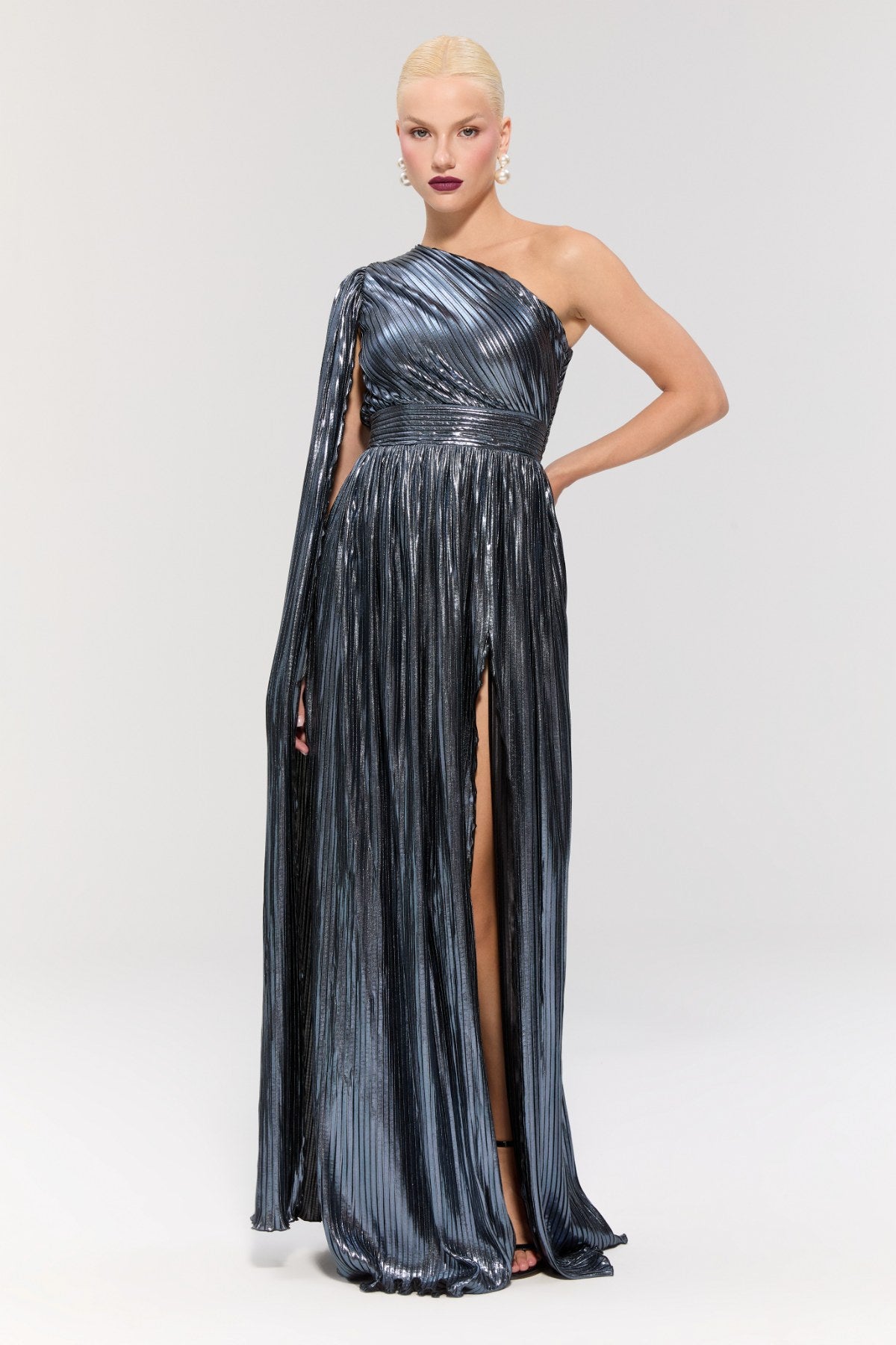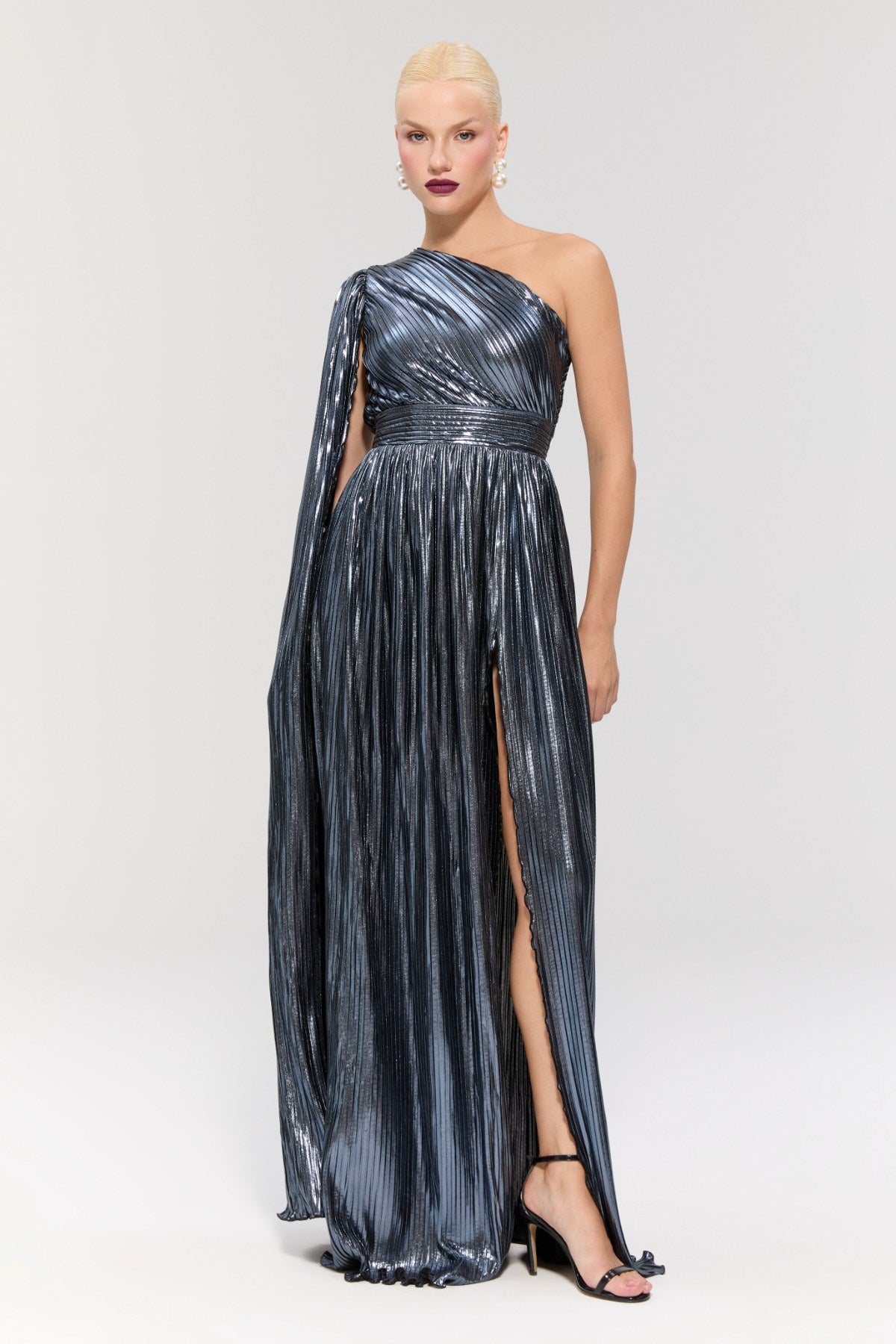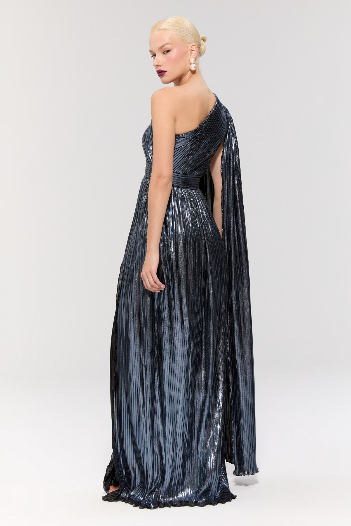 Elbise, iki omuzdan dökülen uzun pelerinleri ve lacivert kadife kumaşıyla zarif ve sofistike bir görünüm sunar.