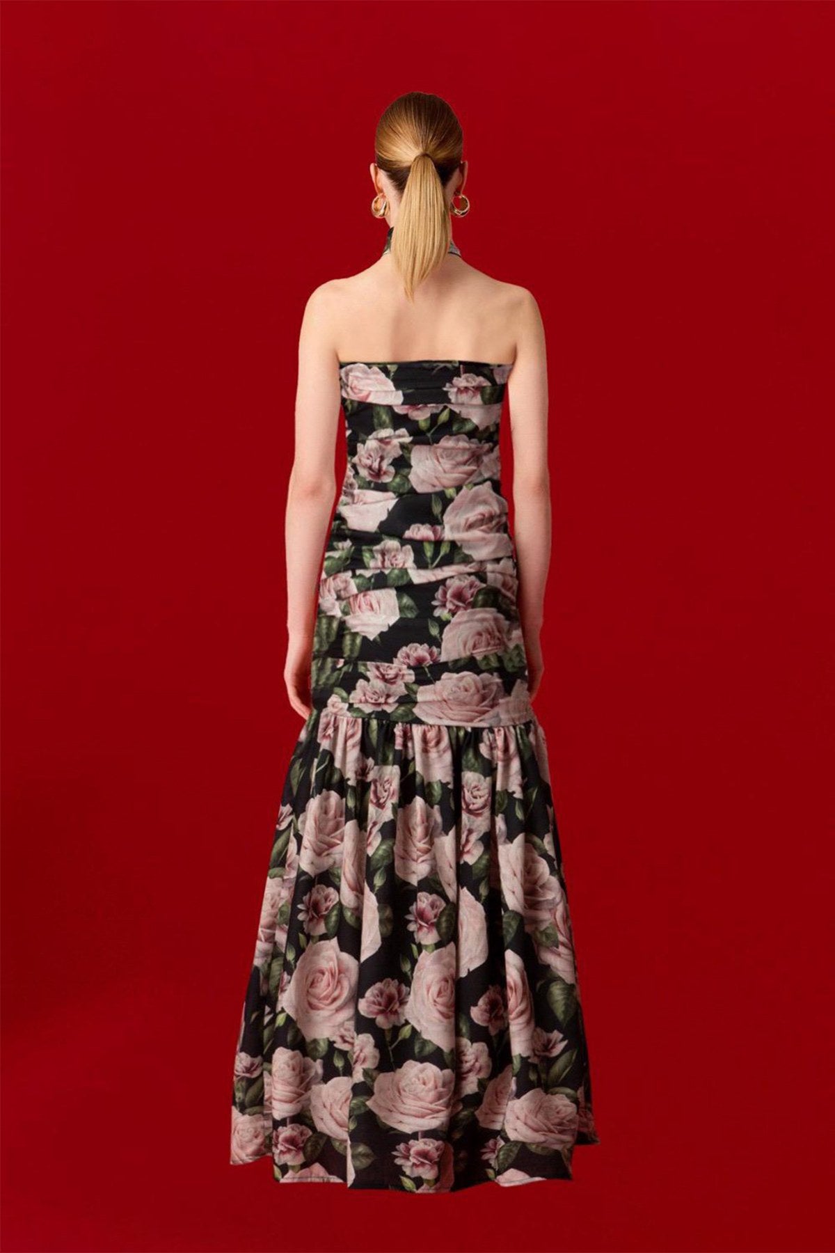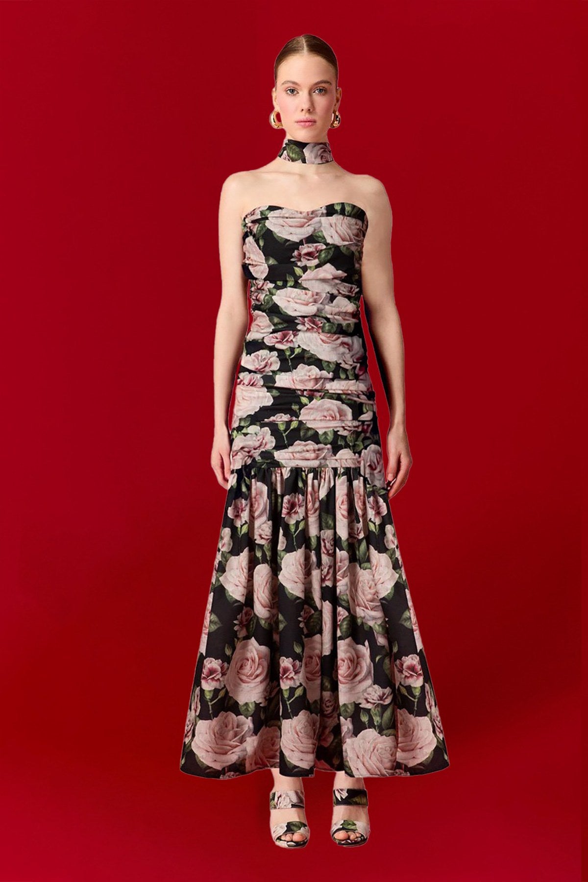 Göğüs kısmında büzgü detayları bulunan straplez kesimi, feminen ve şık bir görünüm sunar. Belden aşağıya doğru genişleyen midi etek, hareket özgürlüğü ve zarafet katıyor.