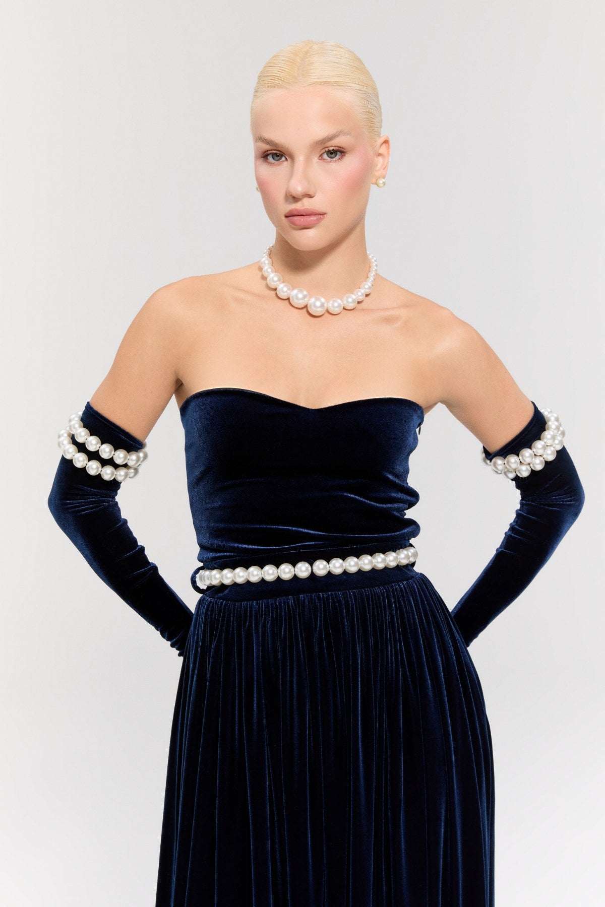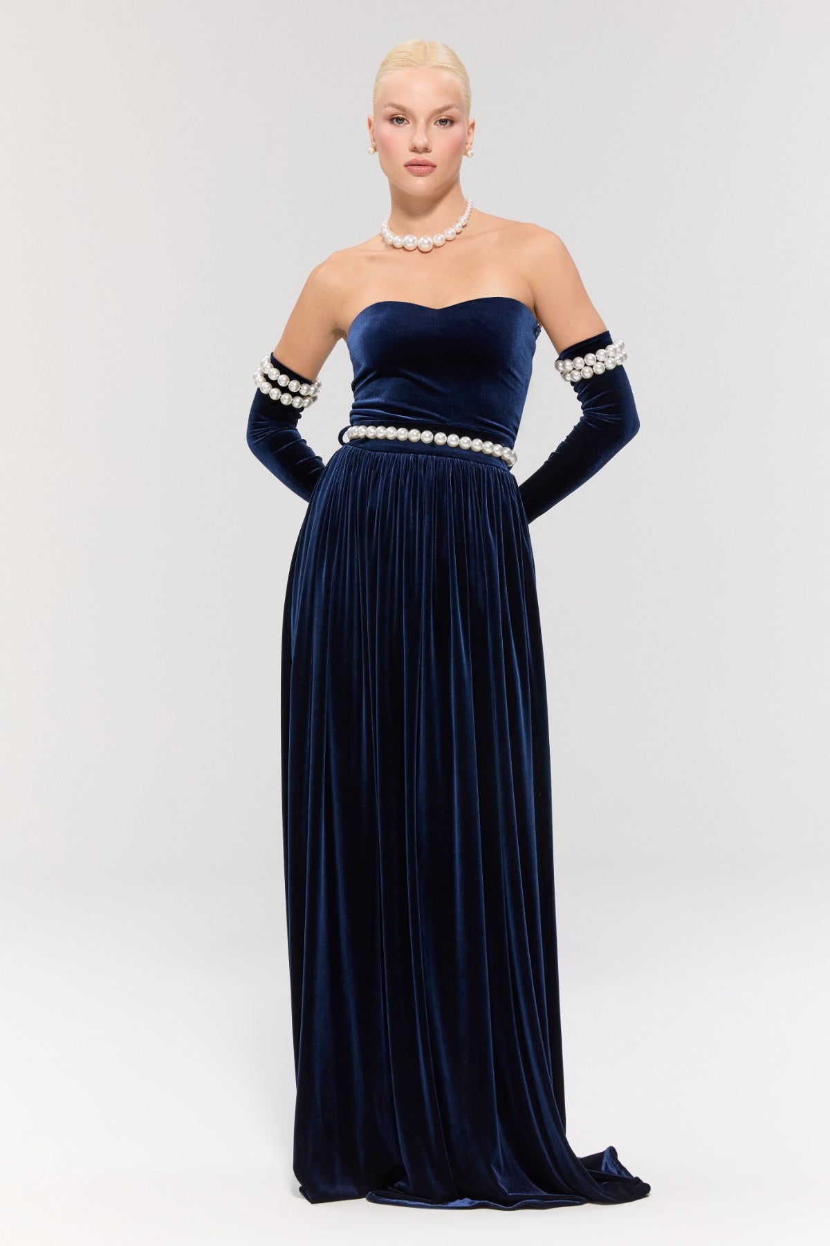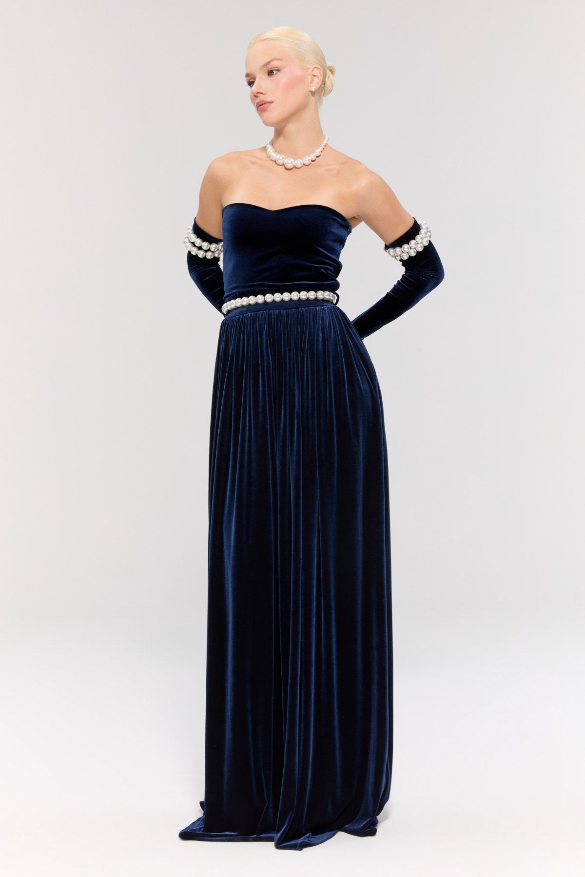 Eldivenler ve inci kemer elbiseye dahildir.