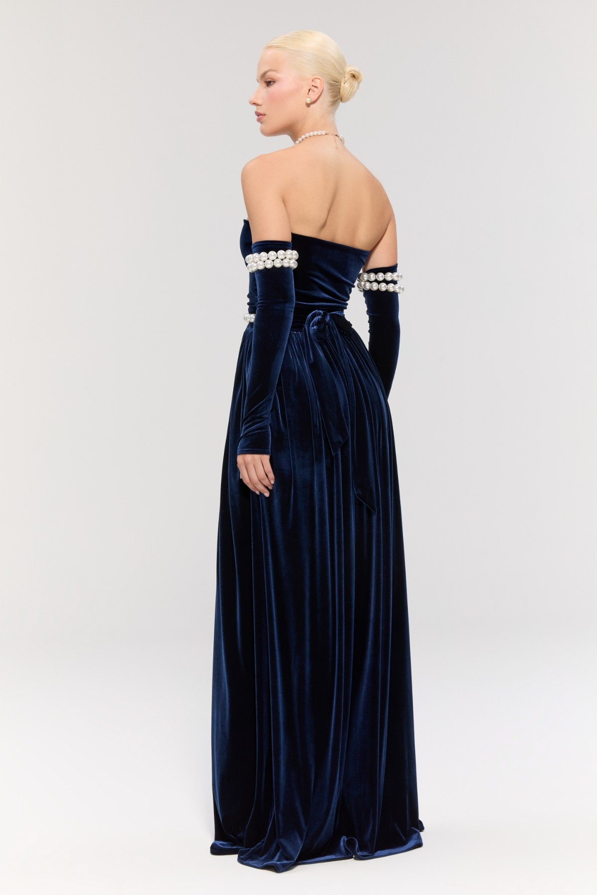 Elbise, uzun lacivert kadife modeli ile zarif ve sofistike bir silüet sunar.