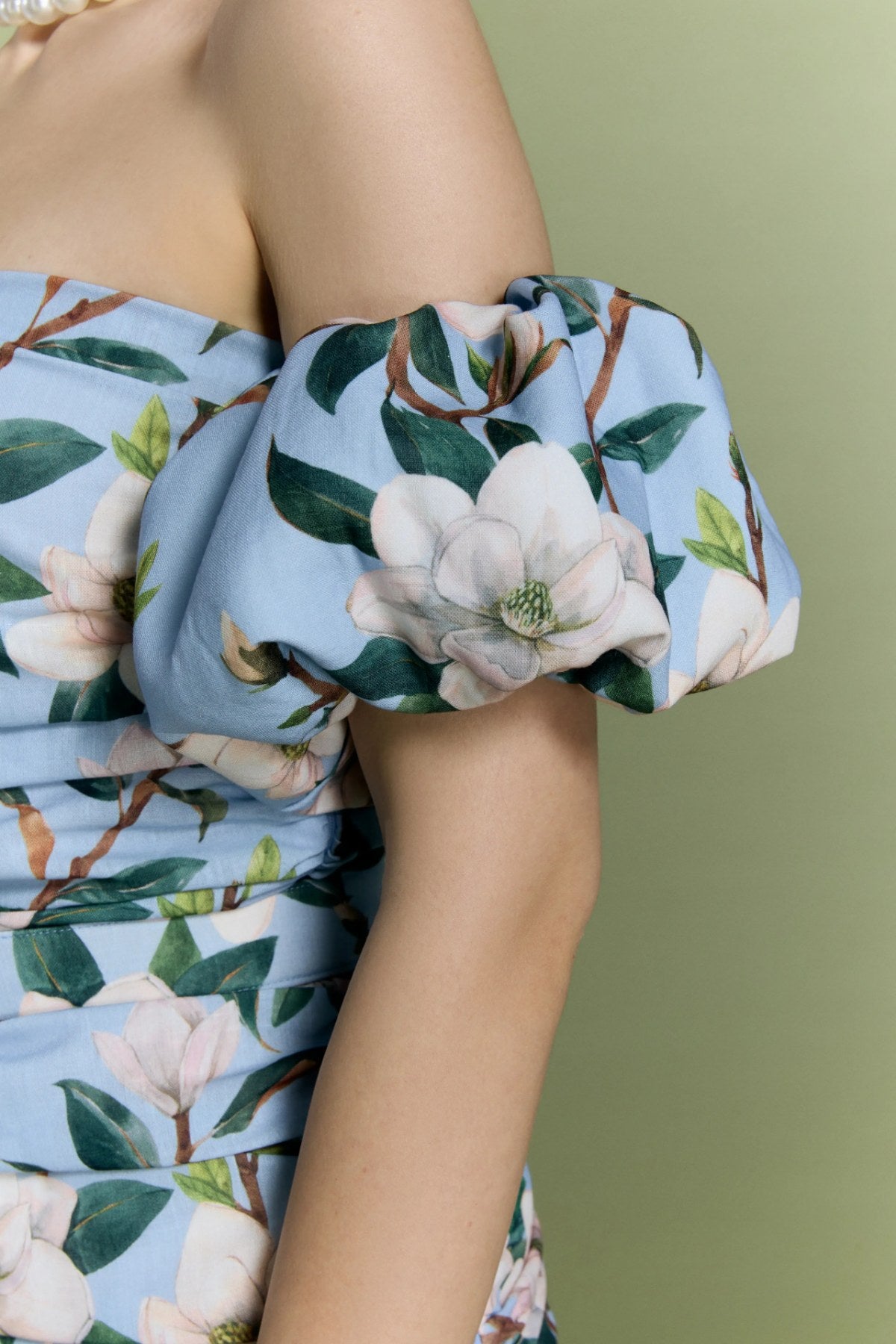 Mavi zemin üzerine beyaz, pembe ve yeşil çiçek desenleriyle zarif bir görünüm sunuyor.