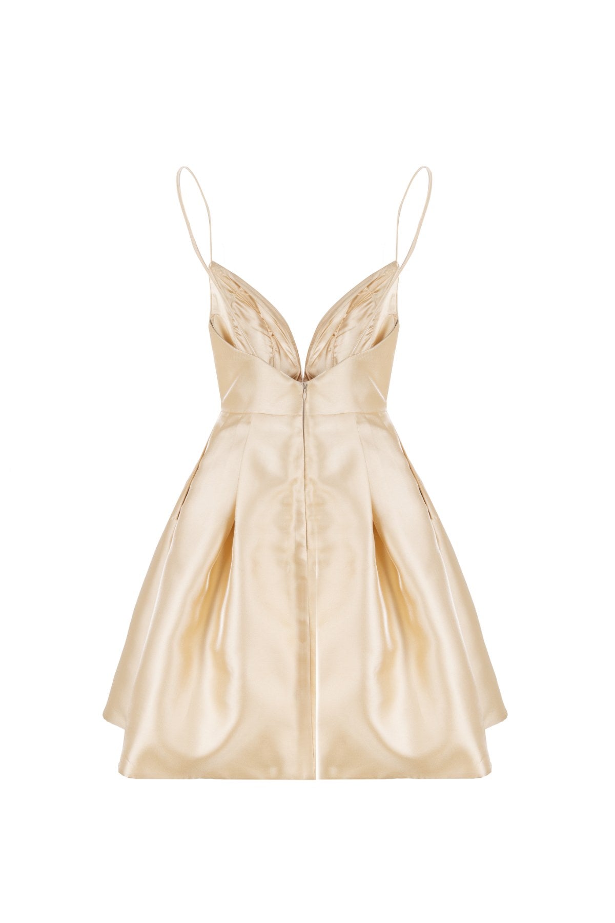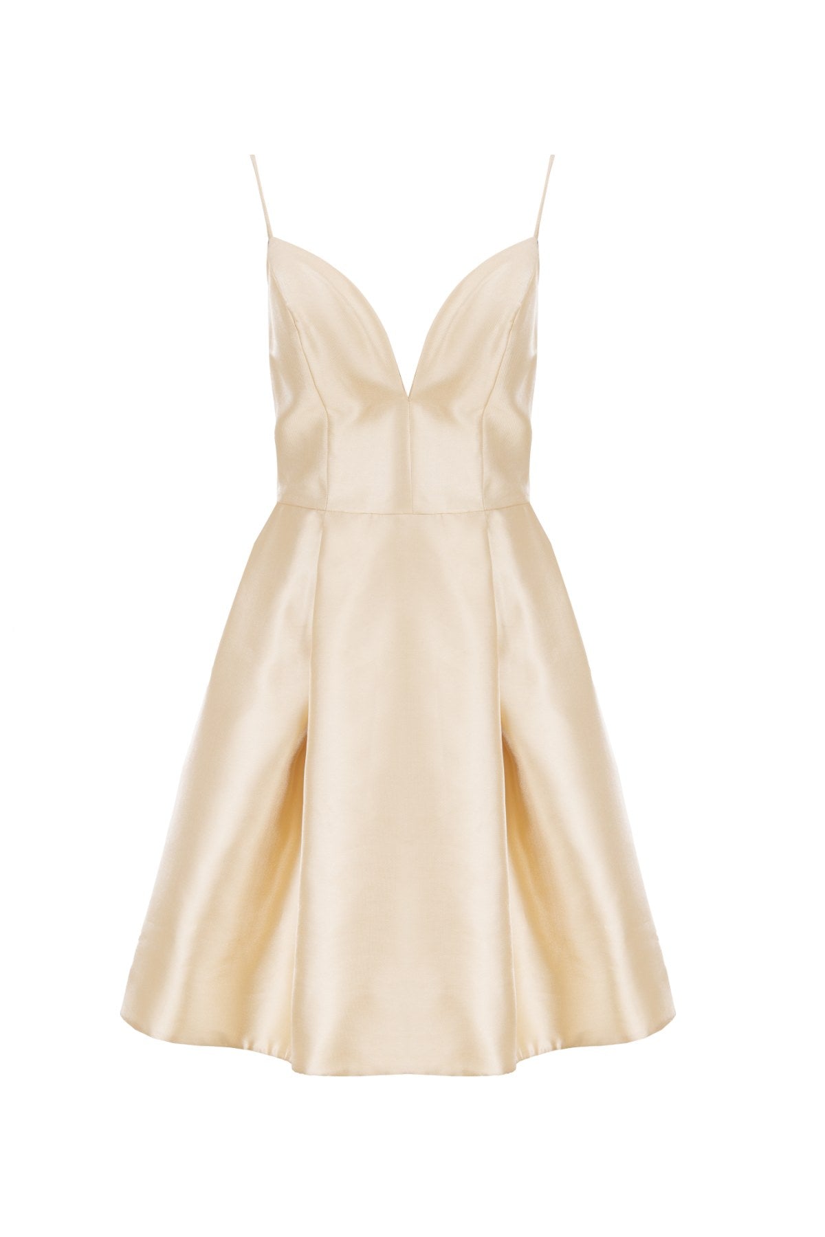 Gold tonlarında, ince askılı, dökümlü formda ve bacak yırtmaç detaylı, hafif parlak dokulu uzun bir elbisedir. Üretim yeri: Türkiye.