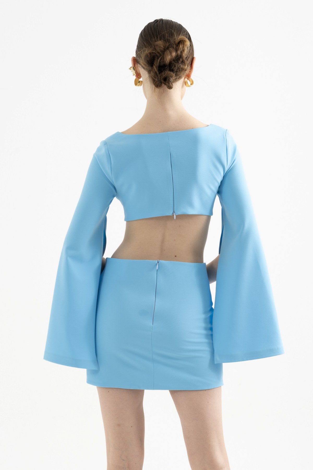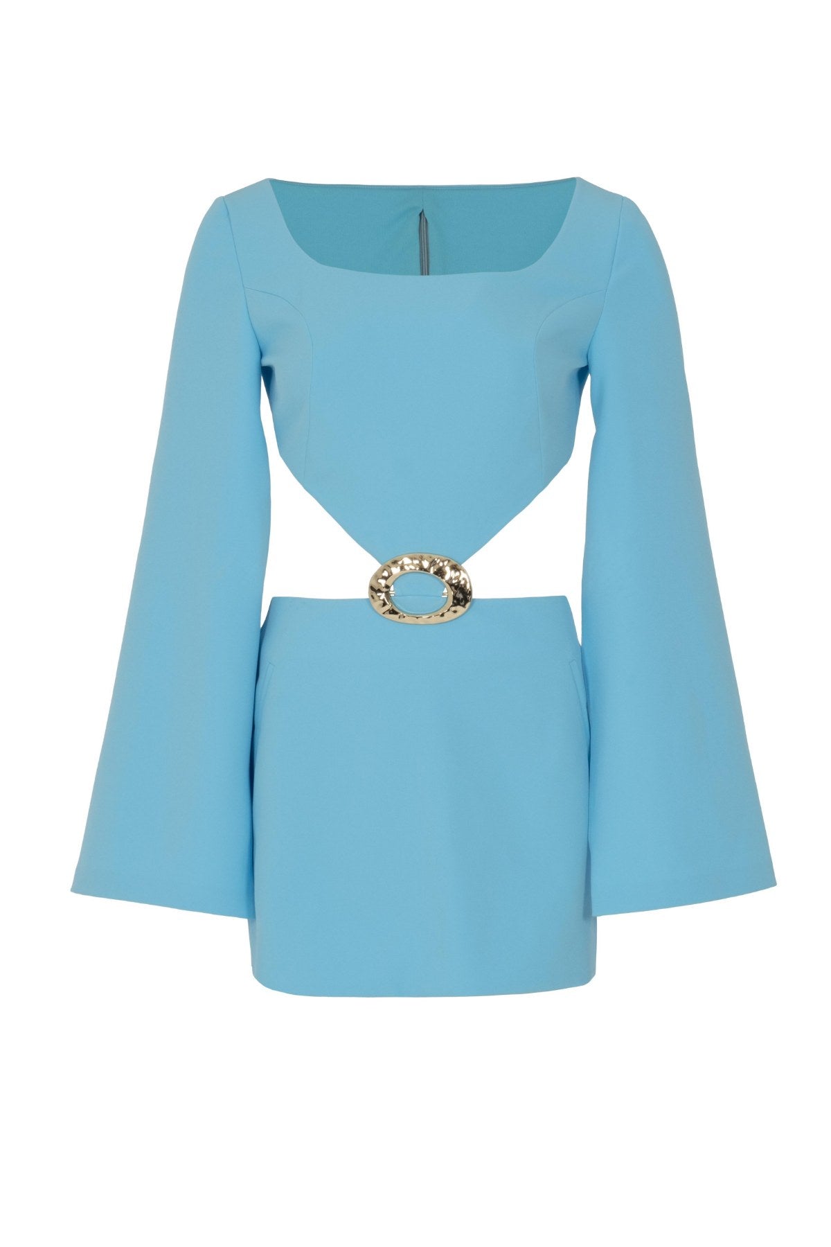 Kare yaka uzun kollu altın aksesuar detaylı mini elbise