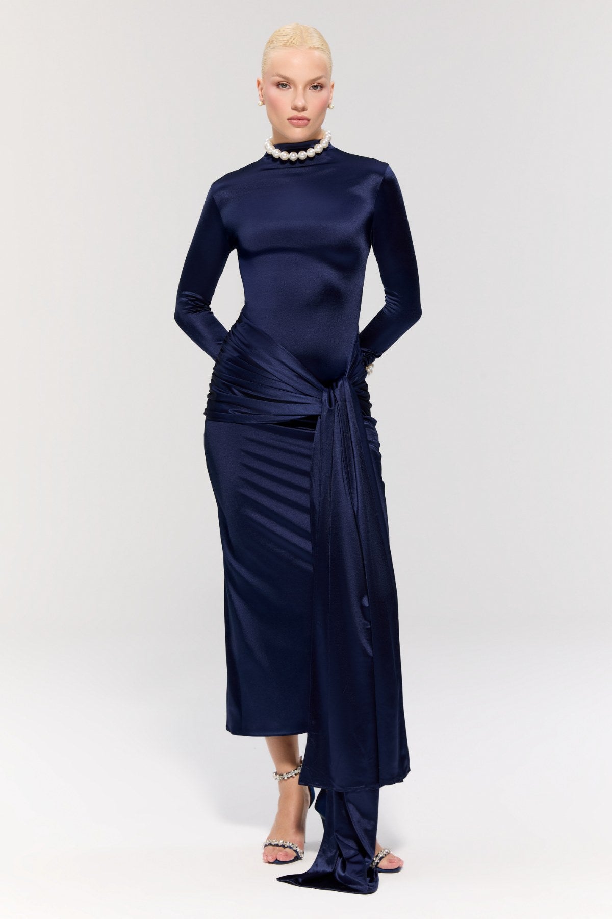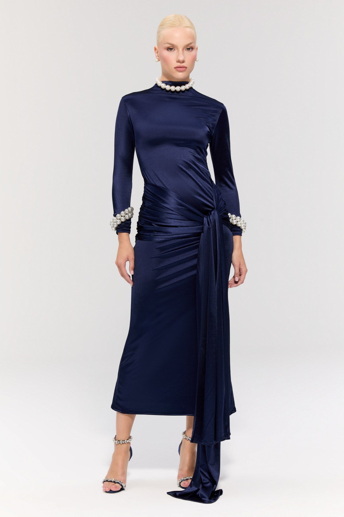 Elbise, lacivert parlak kumaşıyla göz alıcı bir şıklık sunar.