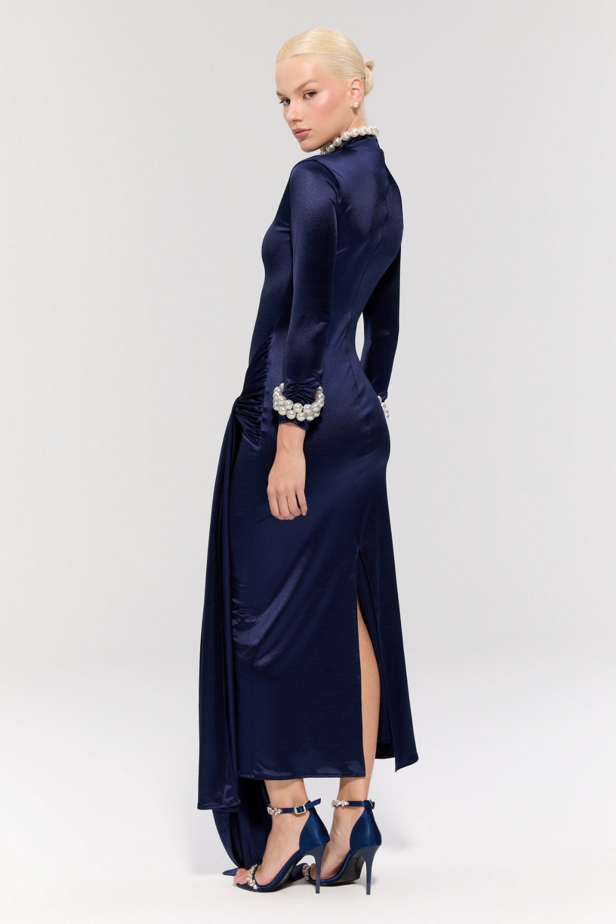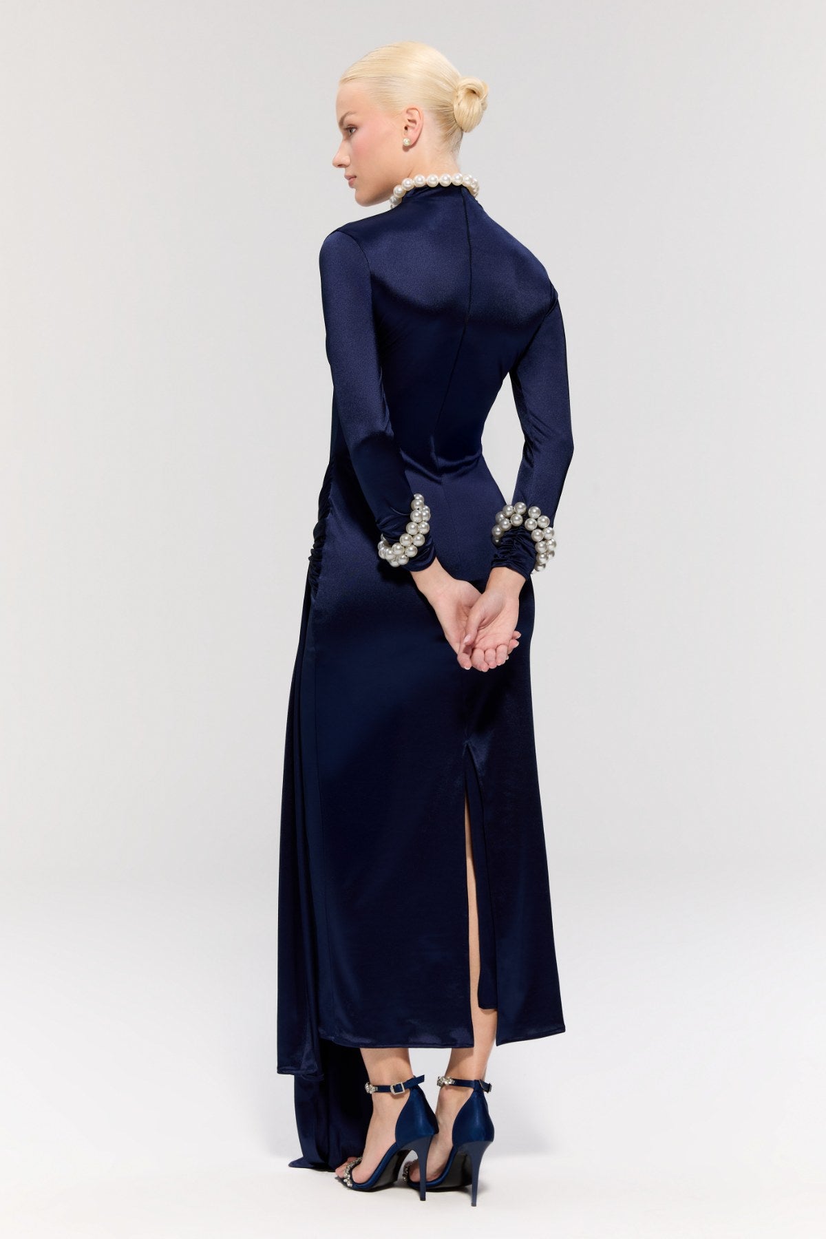 Uzun kollu tasarımı zarif bir silüet oluştururken, kollar ve yaka kısmındaki inci detayları tasarıma sofistike ve feminen bir dokunuş katar.