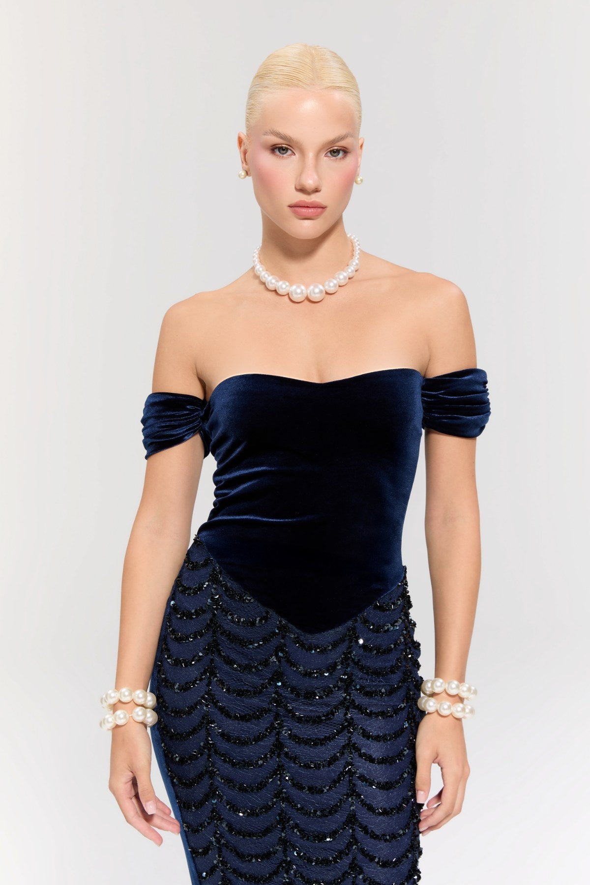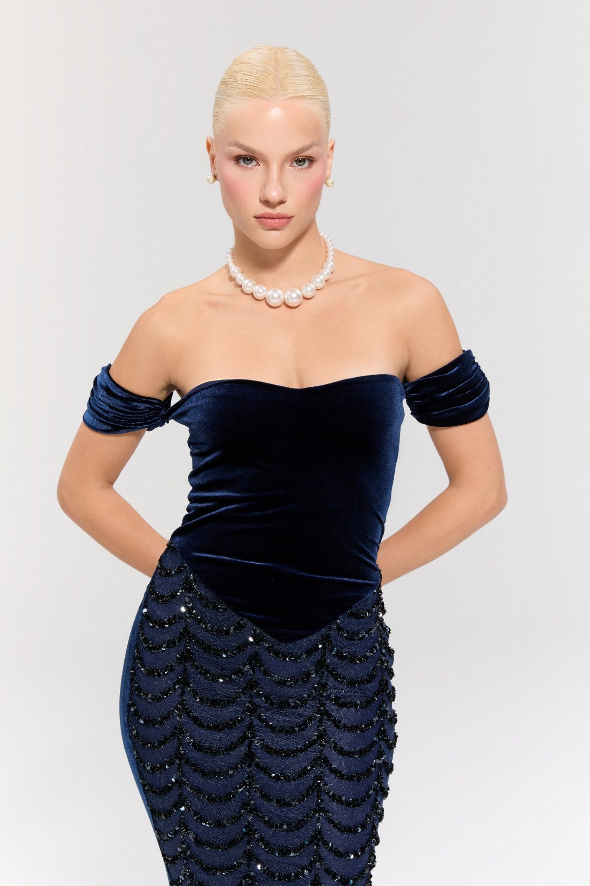 Elbisenin üst kısmı lacivert kadife dokusuyla asil bir şıklık sunarken, alt kısmındaki pullu uzun etek vücudu saran formuyla göz alıcı bir etki yaratır.