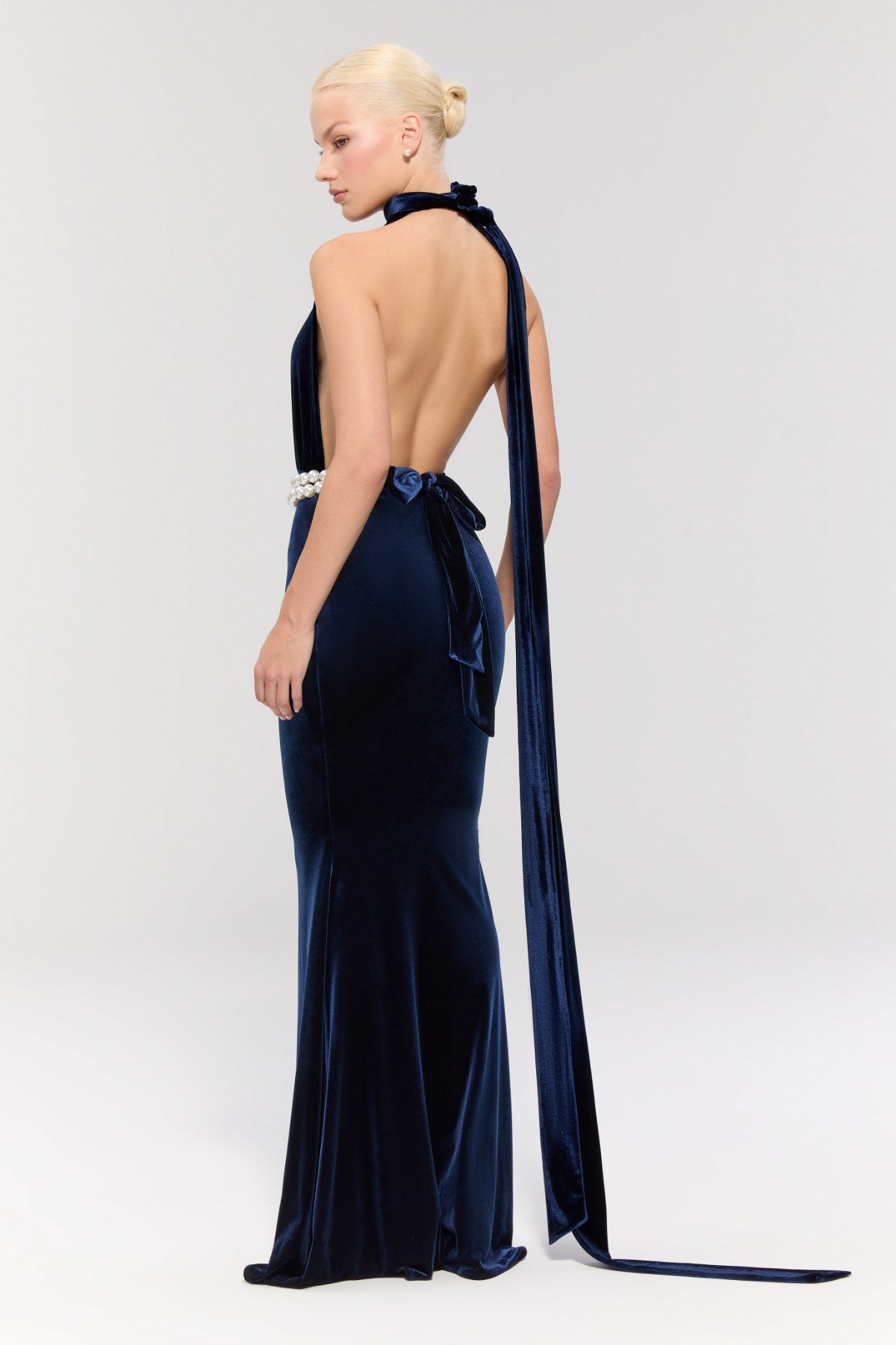 Boyundan bağlamalı derin V yakası feminen bir silüet oluştururken, beldeki inci kemer tasarıma zarif bir ışıltı katar.
