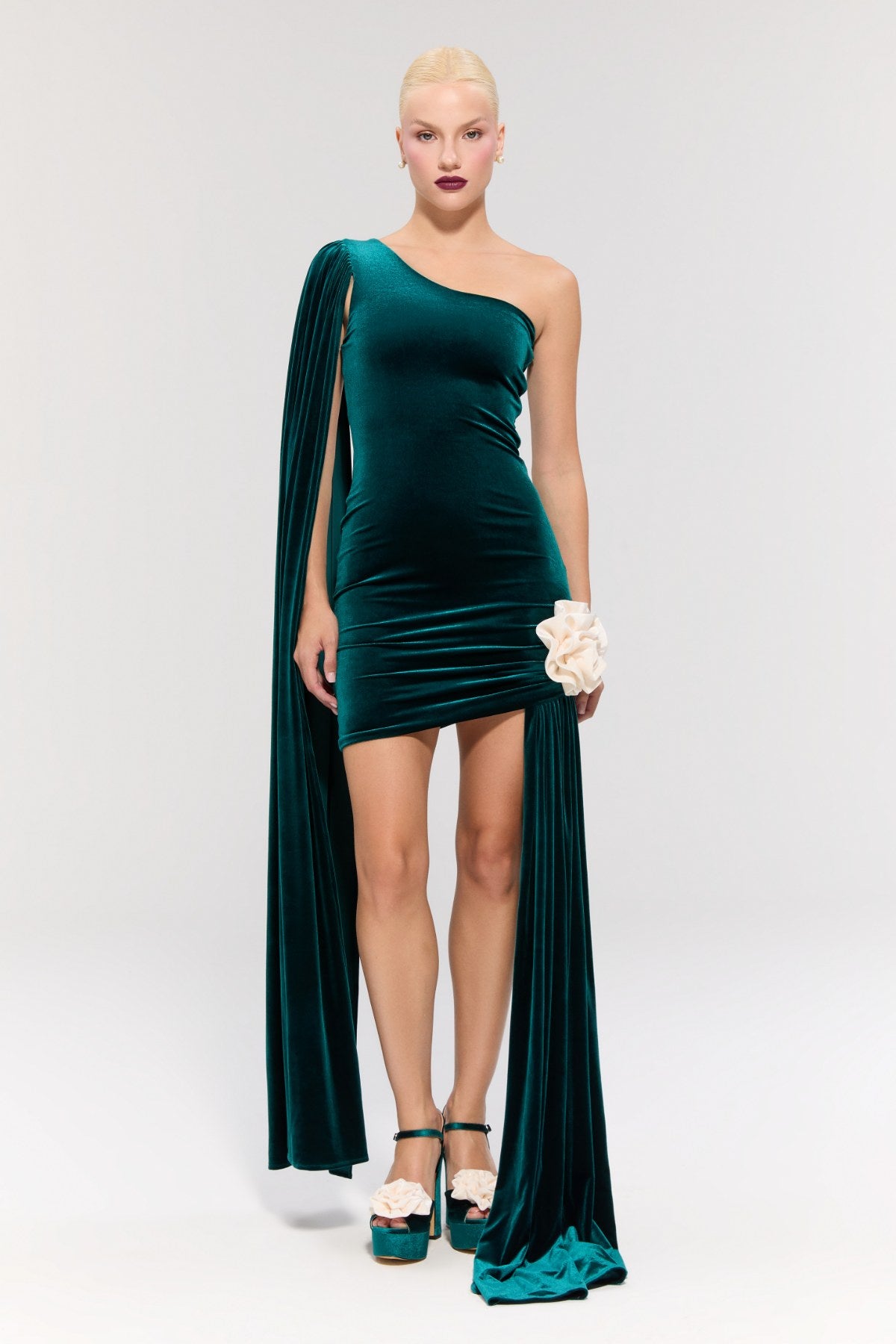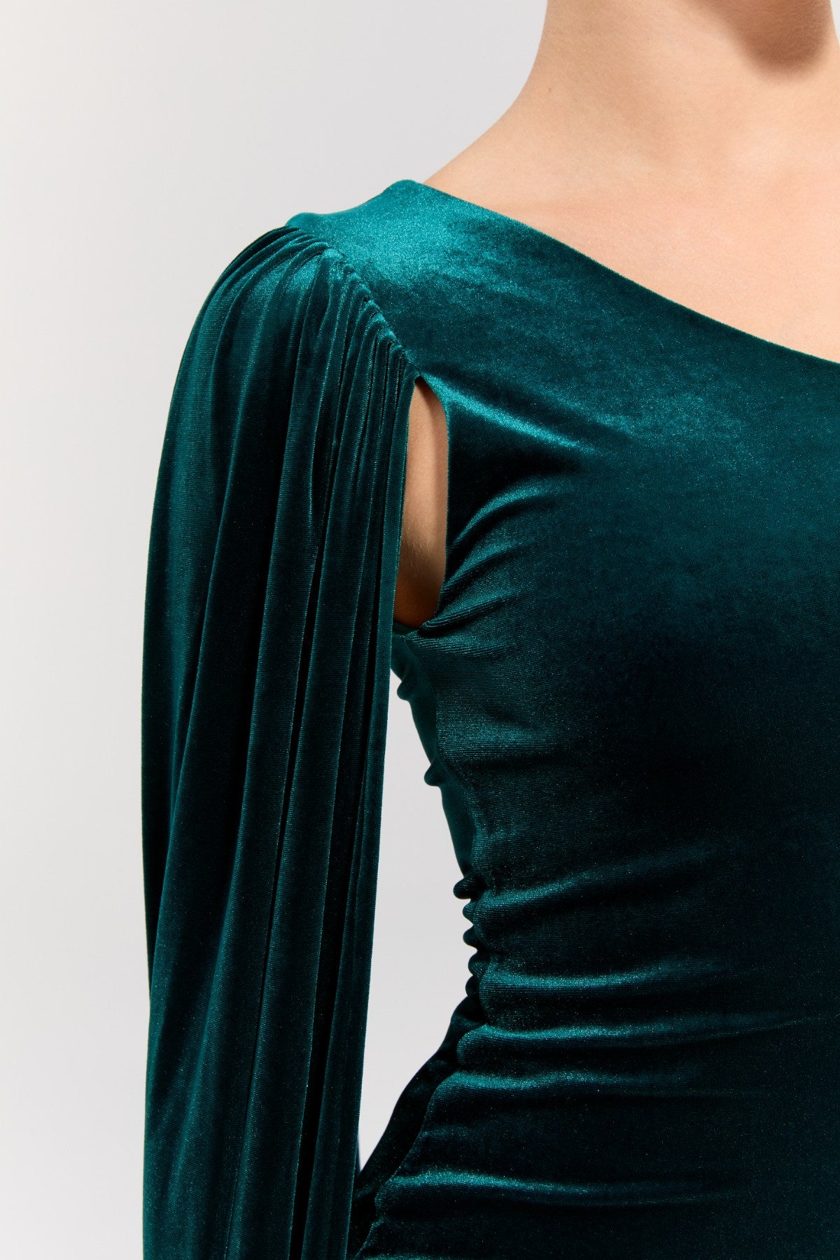 Sol omuzda asimetrik kesimi ve vücuda oturan formuyla sofistike bir görünüm sunar.