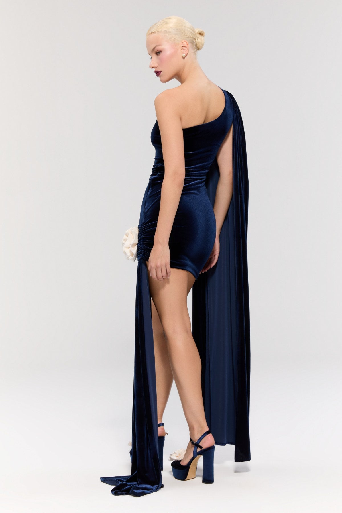 Sol omuzda asimetrik kesimi ve vücuda oturan formuyla sofistike bir görünüm sunar.