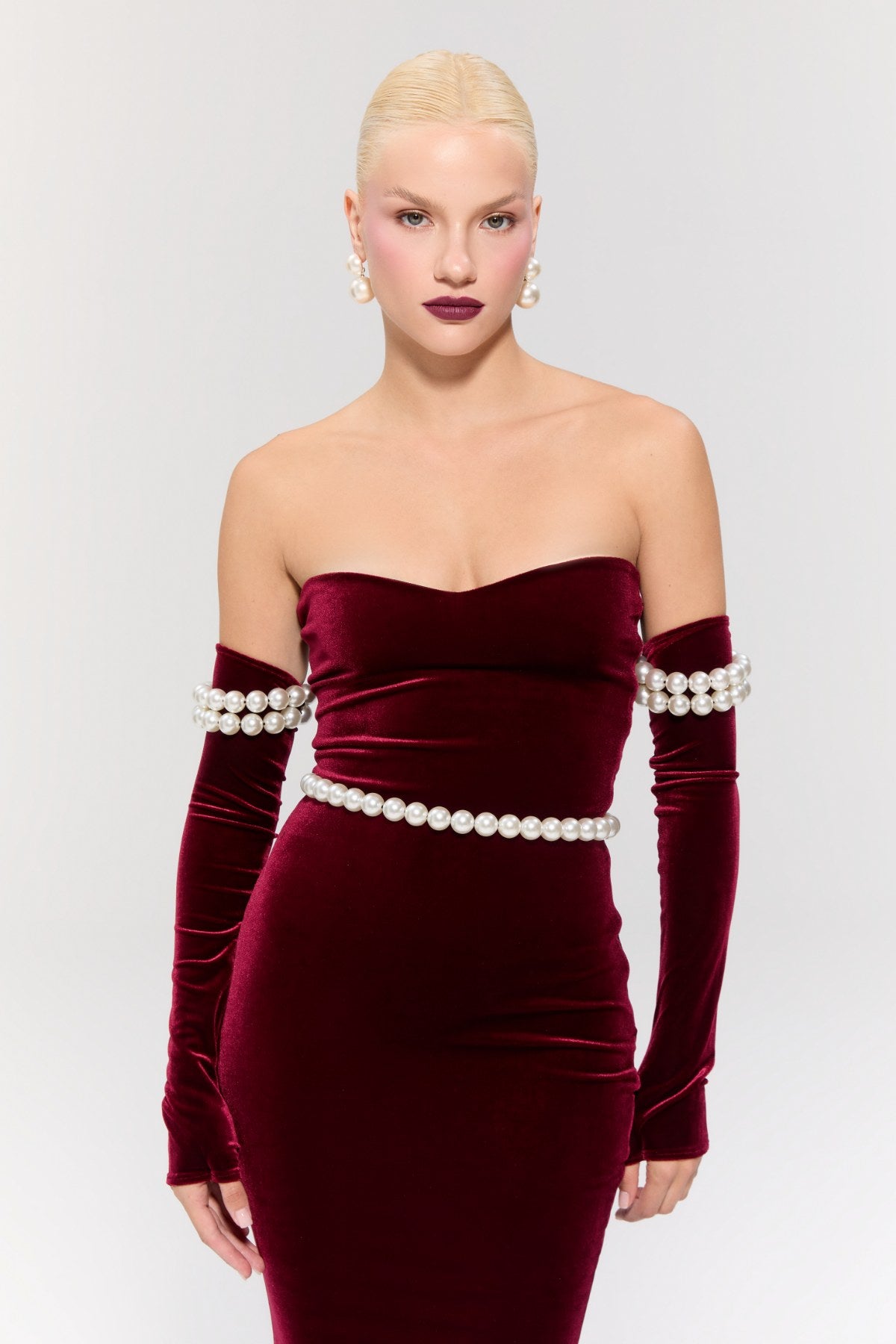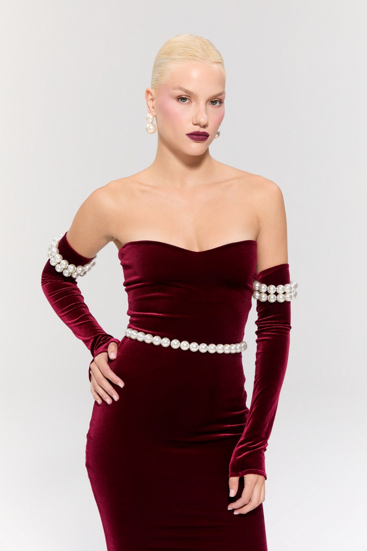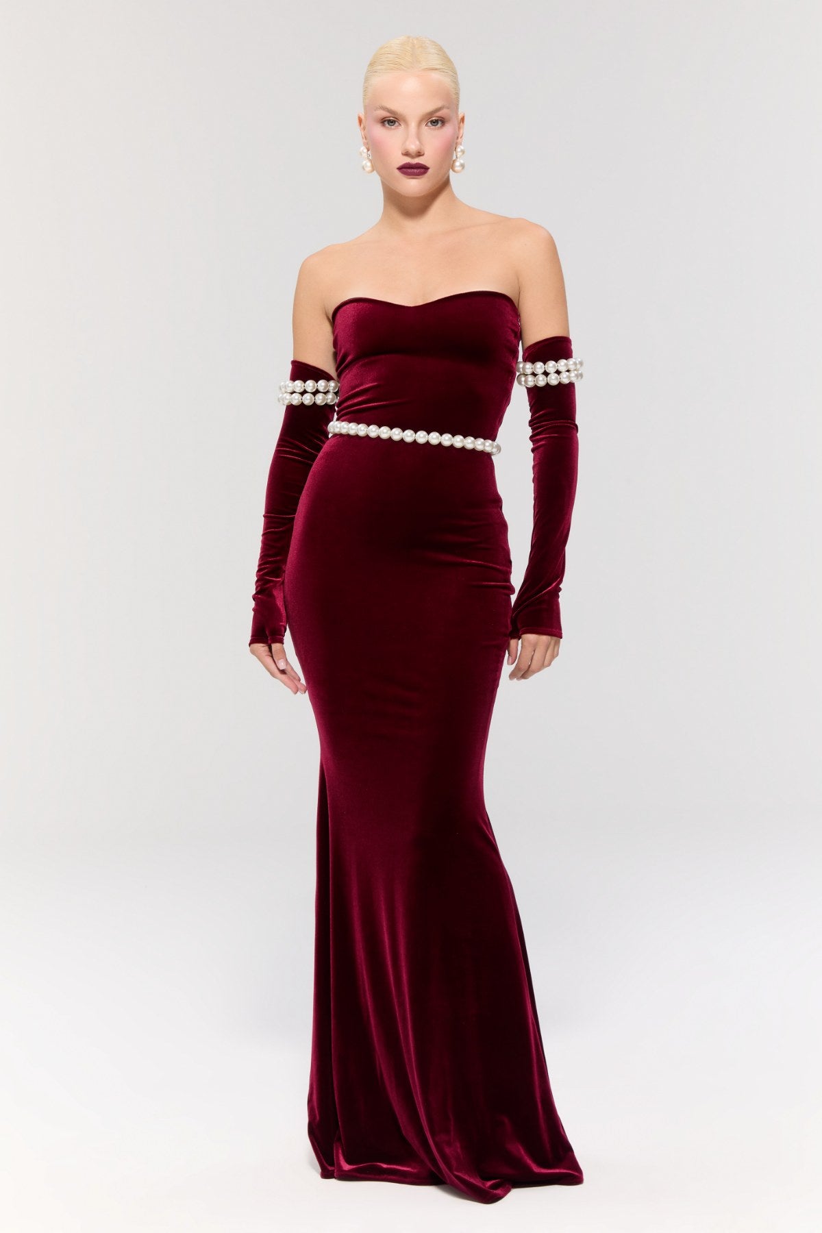 Elbise, uzun bordo kadife modeli ile zarif ve sofistike bir silüet sunar.