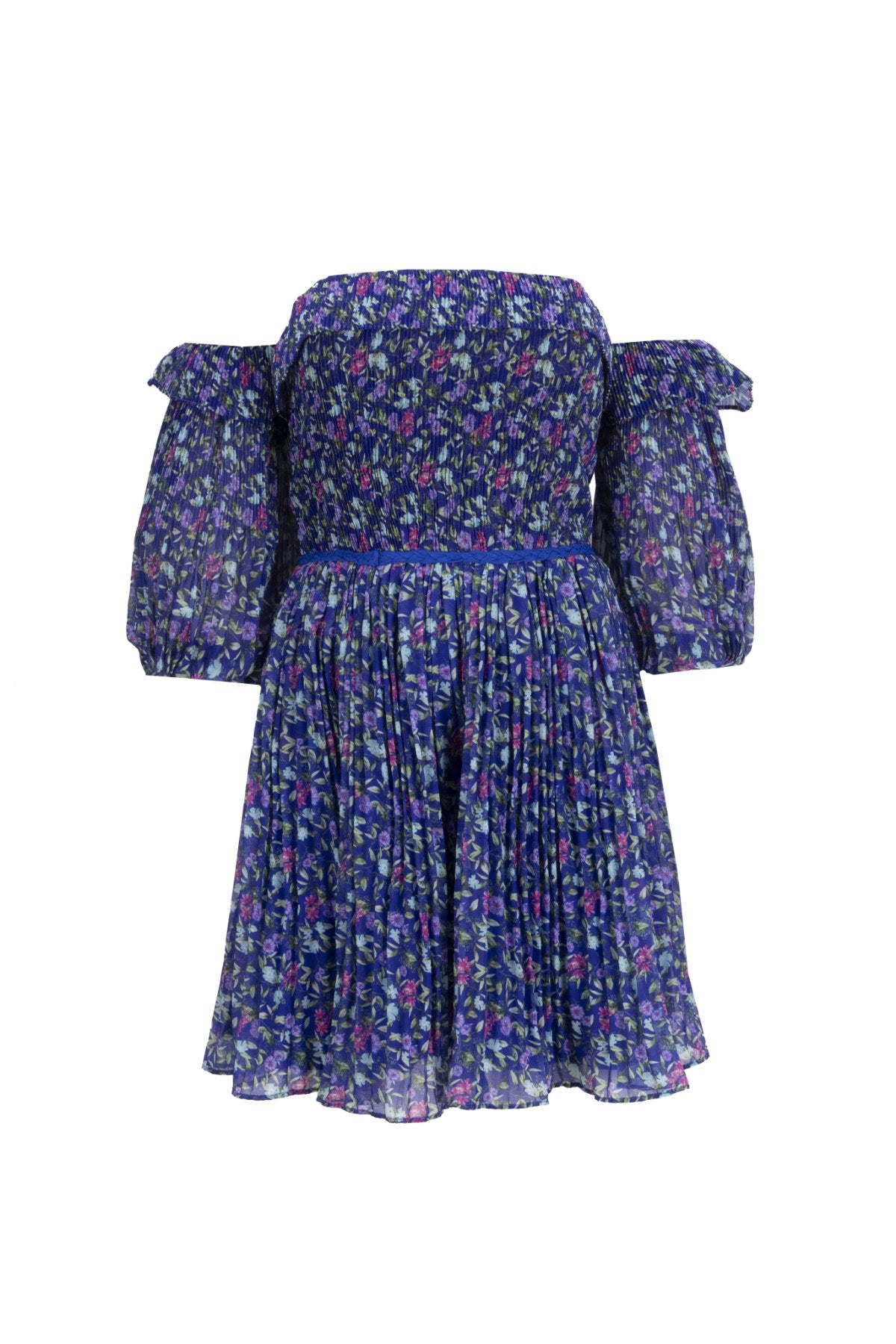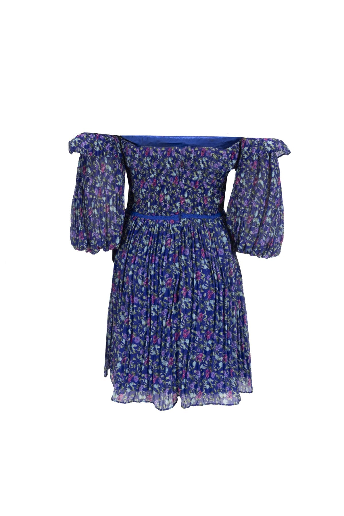 Mavi tonlarında, çiçeksi bir izlenim bırakan, büzgülü üst ve katlı etek detayına sahip, hafif hacimli kısa bir elbisedir. Üretim yeri: Türkiye.