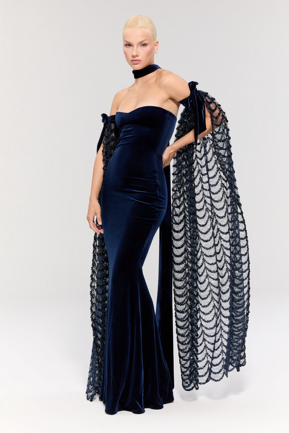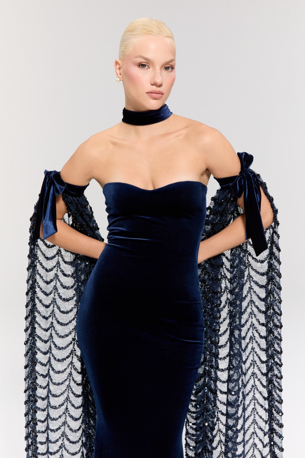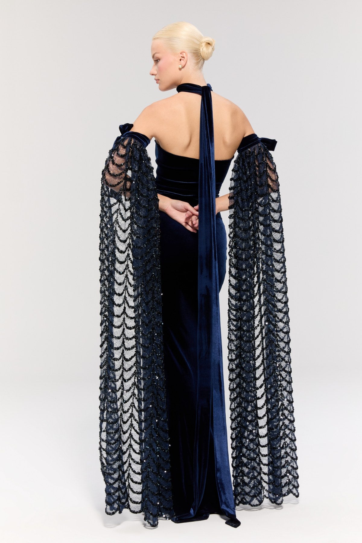Uzun eldivenler tasarımı tamamlayarak sofistike bir görünüm yaratır.