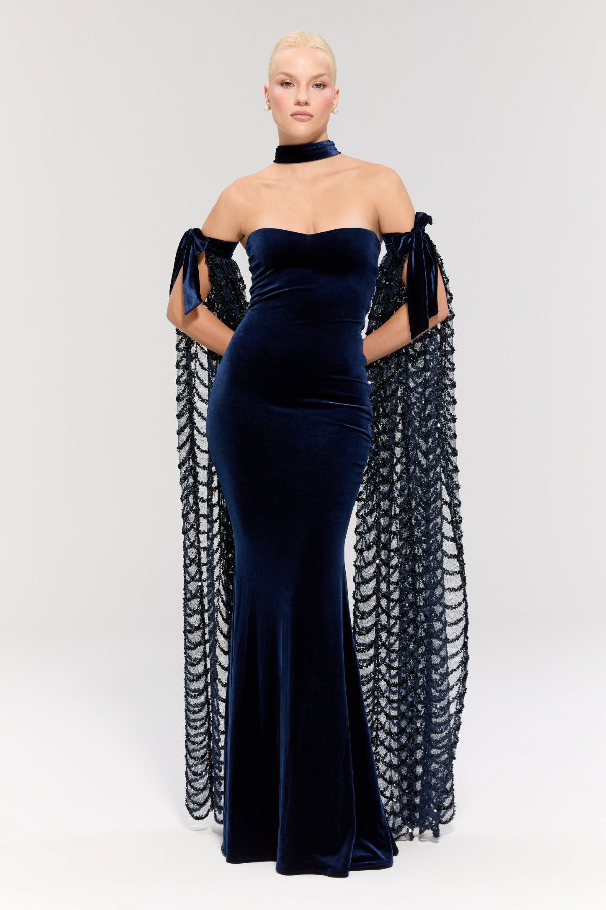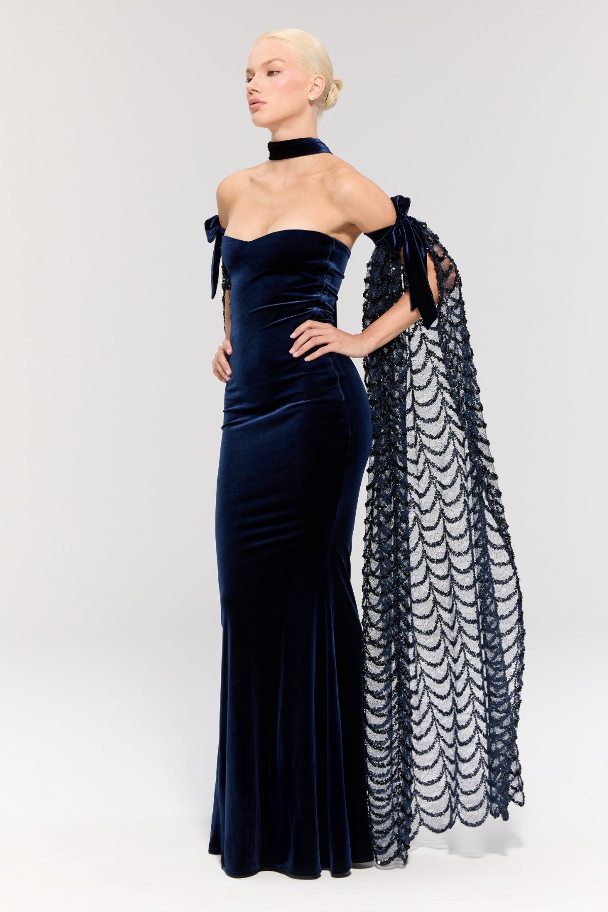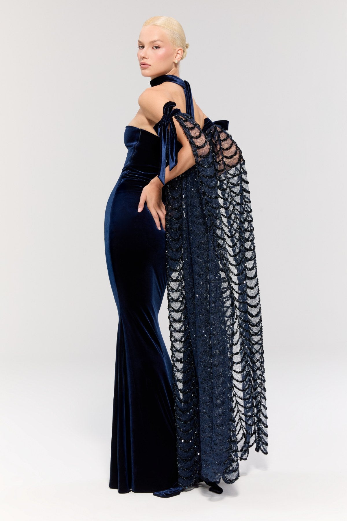 Uzun eldivenler tasarımı tamamlayarak sofistike bir görünüm yaratır.