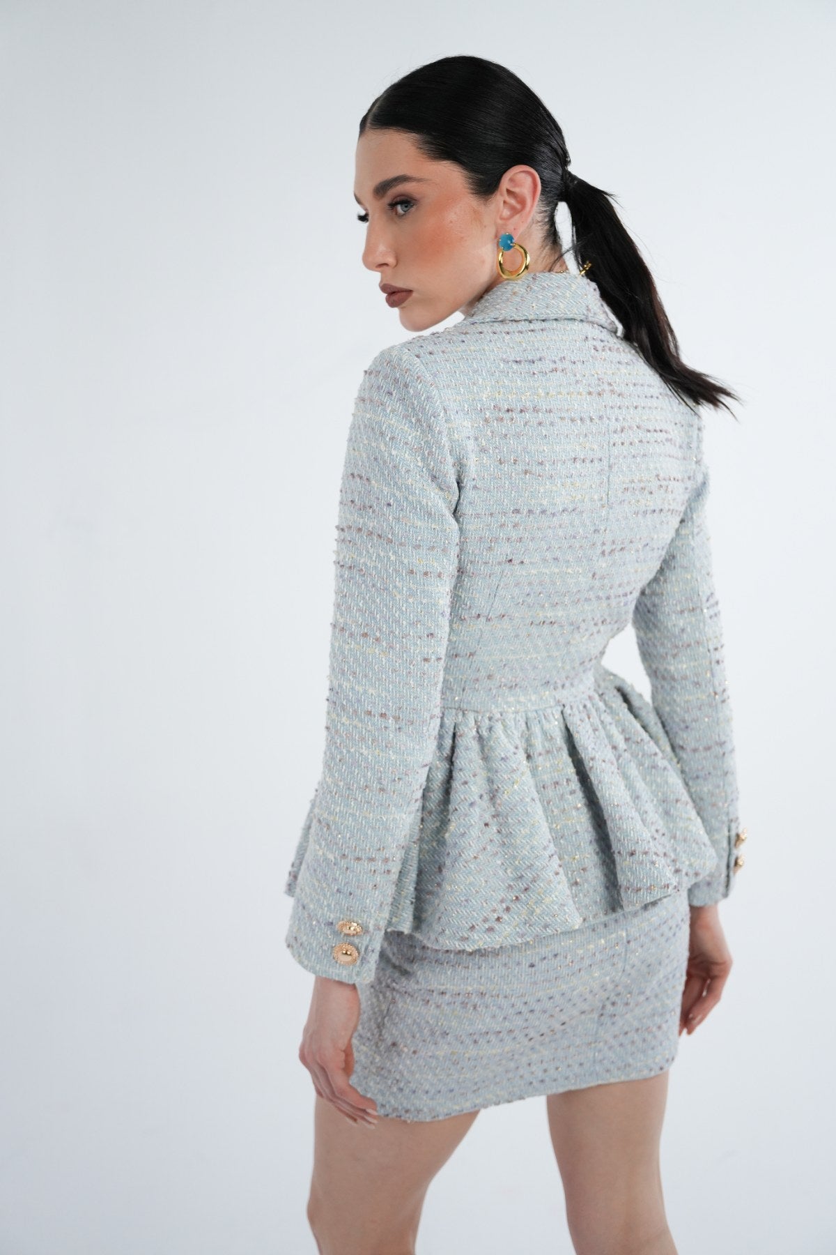 Mavi, dore detaylı tüvit kumaştan, gold düğmeli etek