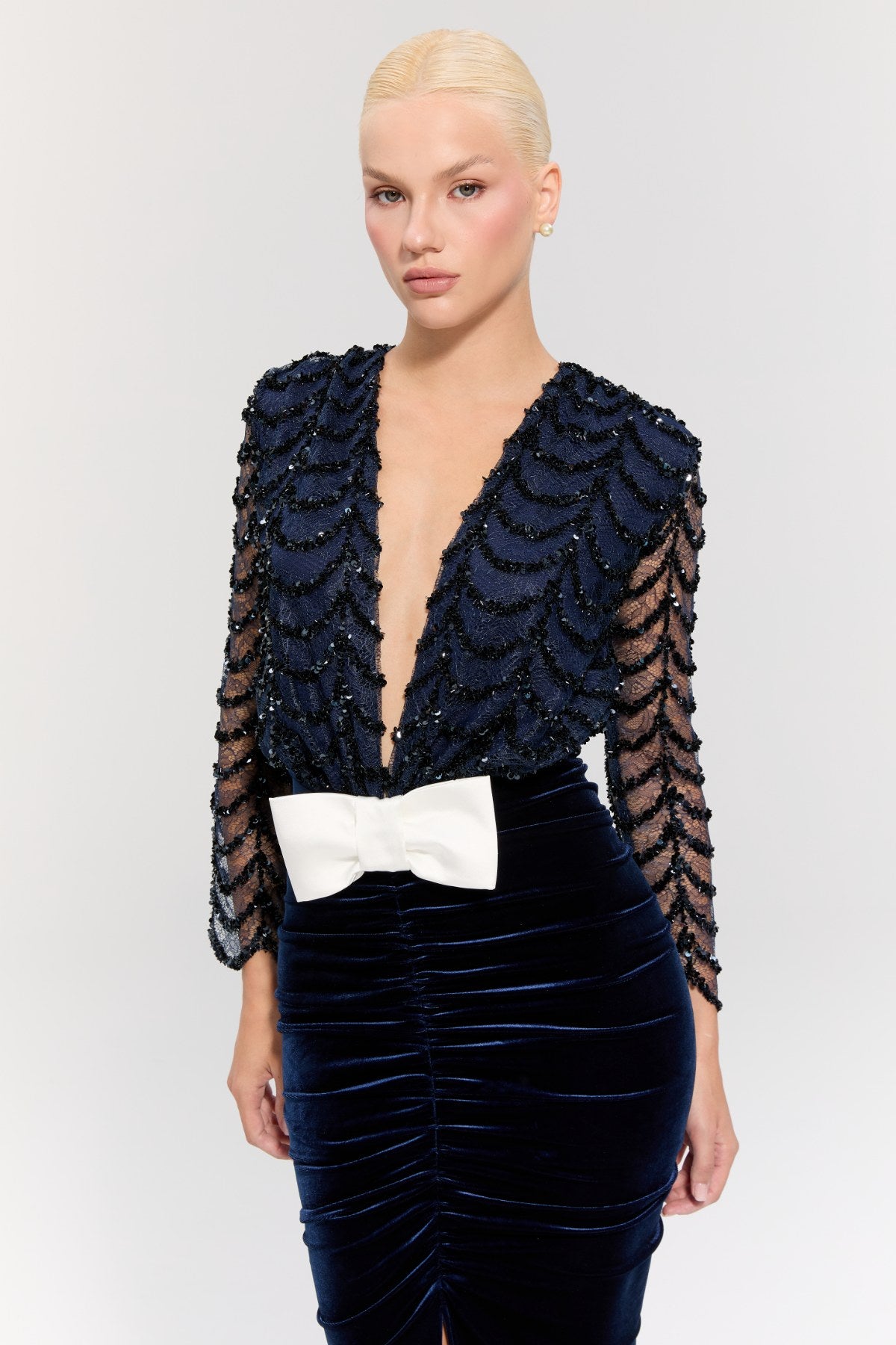 Elbise, üst kısmındaki lacivert pullu kumaşıyla ışıltılı ve göz alıcı bir duruş sergilerken, alt kısmındaki lacivert kadife dokusu sofistike bir şıklık sunar.