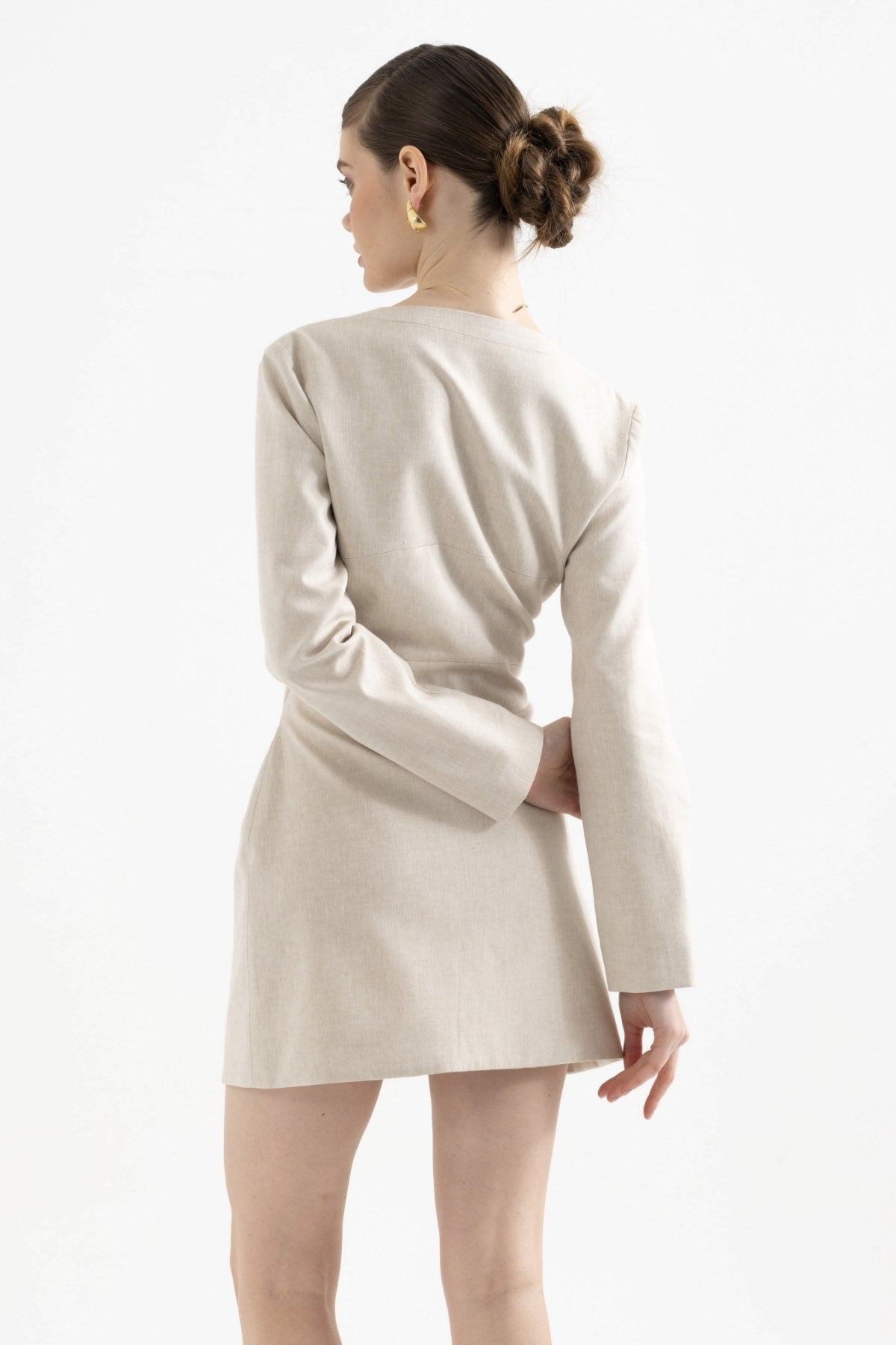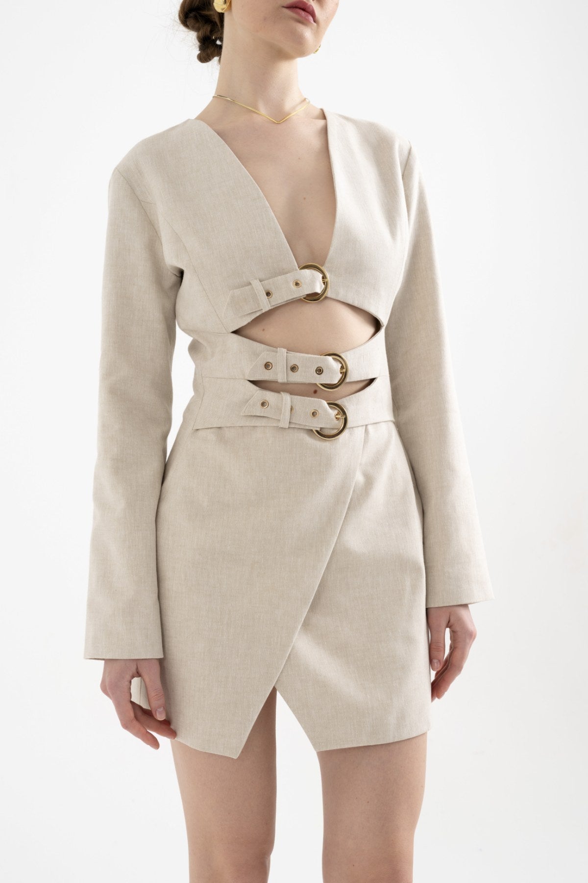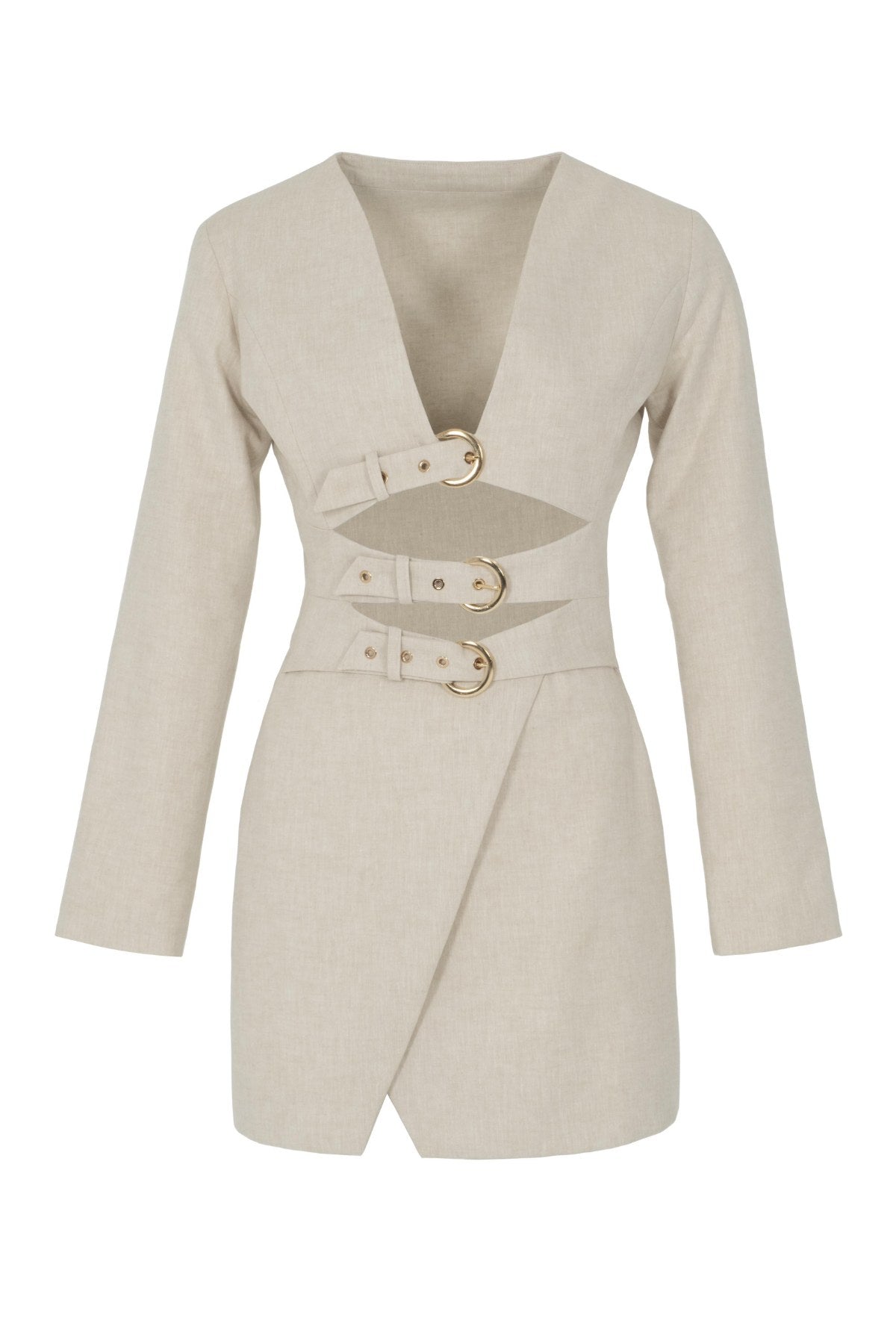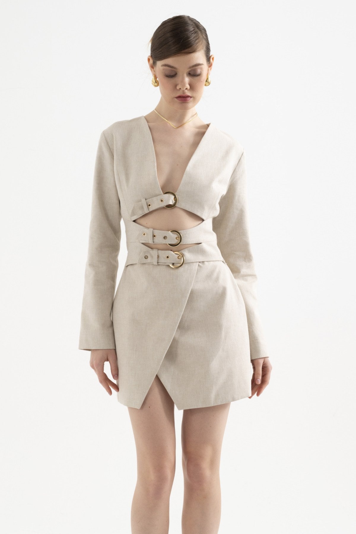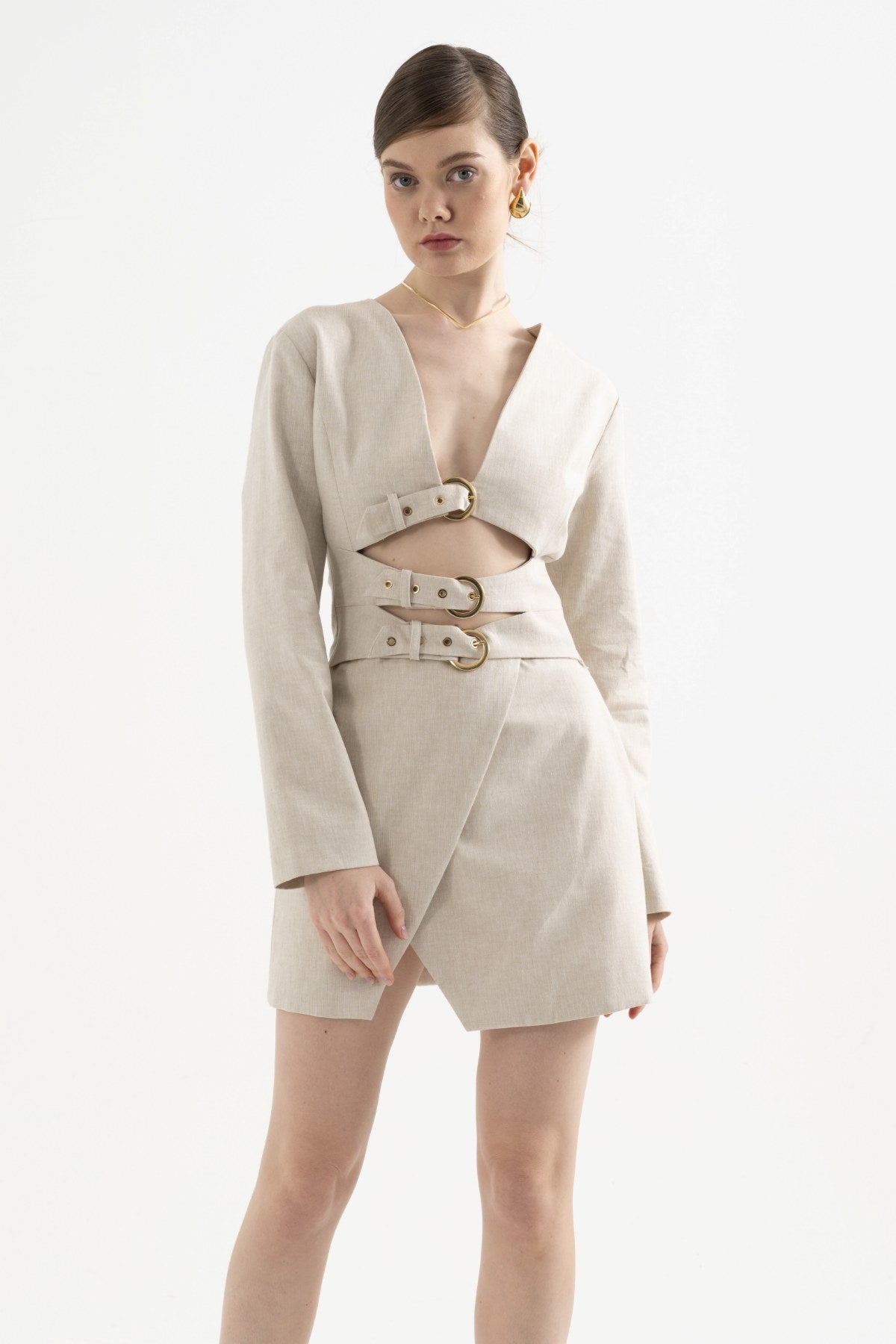3 kemer detaylı uzun kollu kruvaze etekli mini elbise