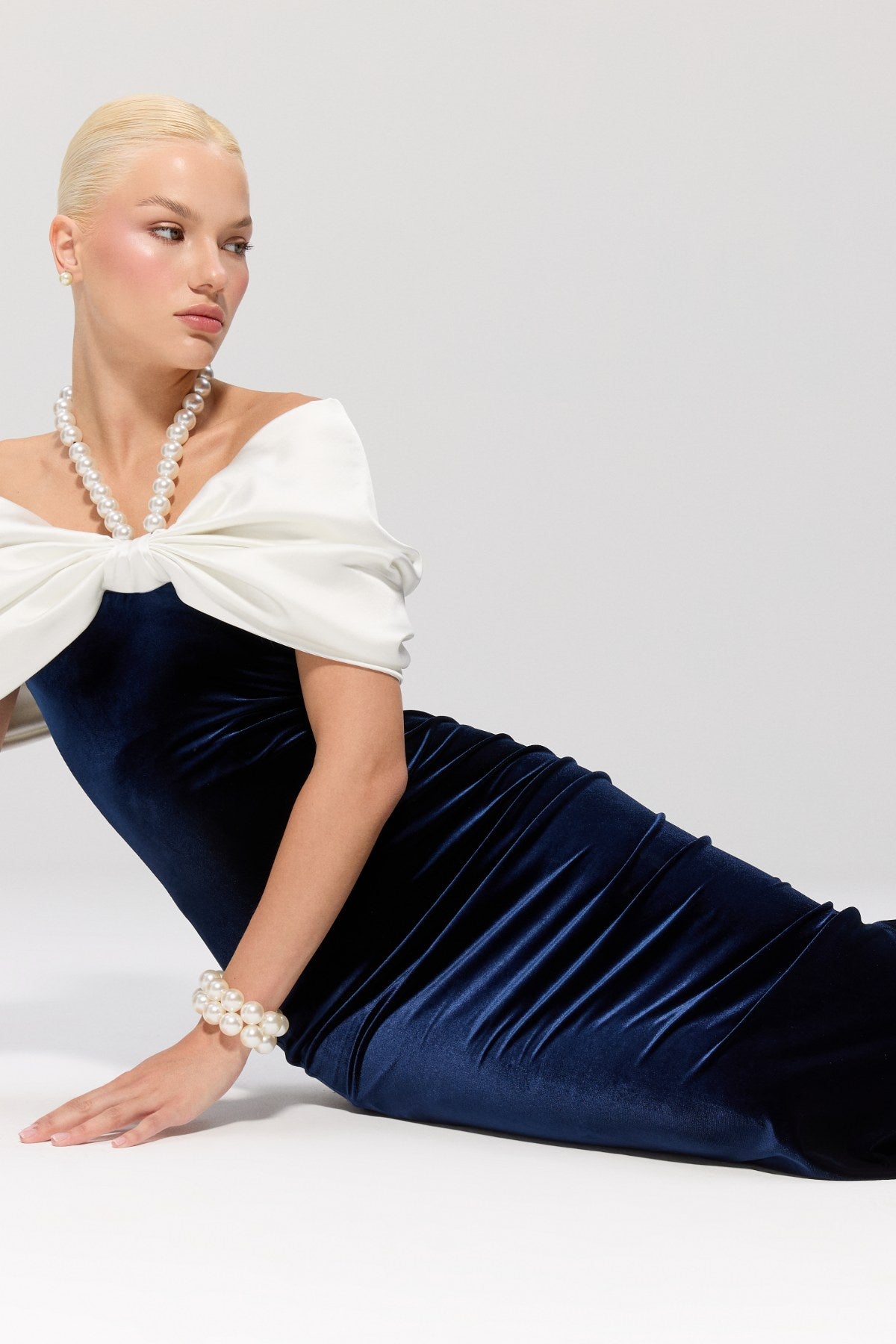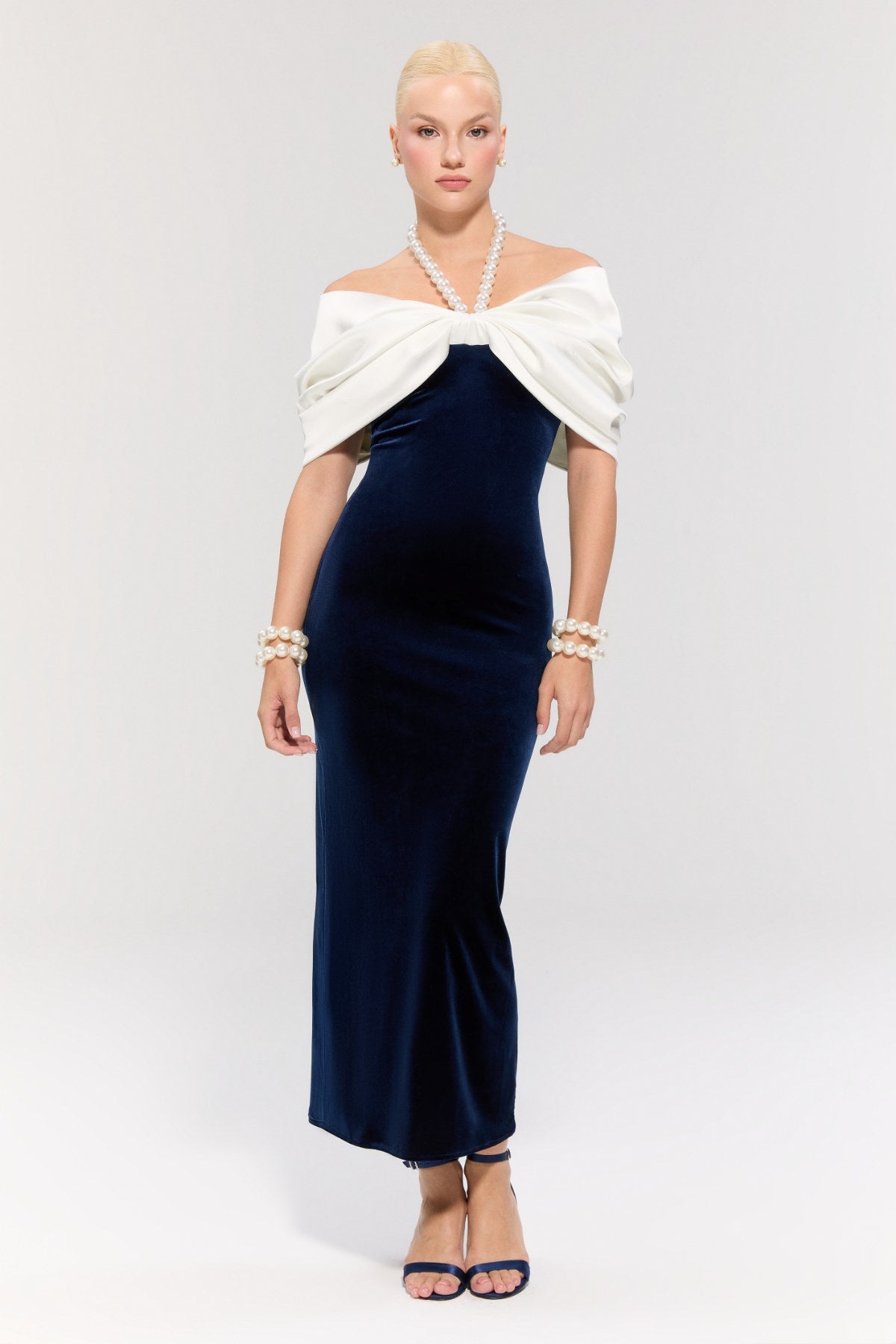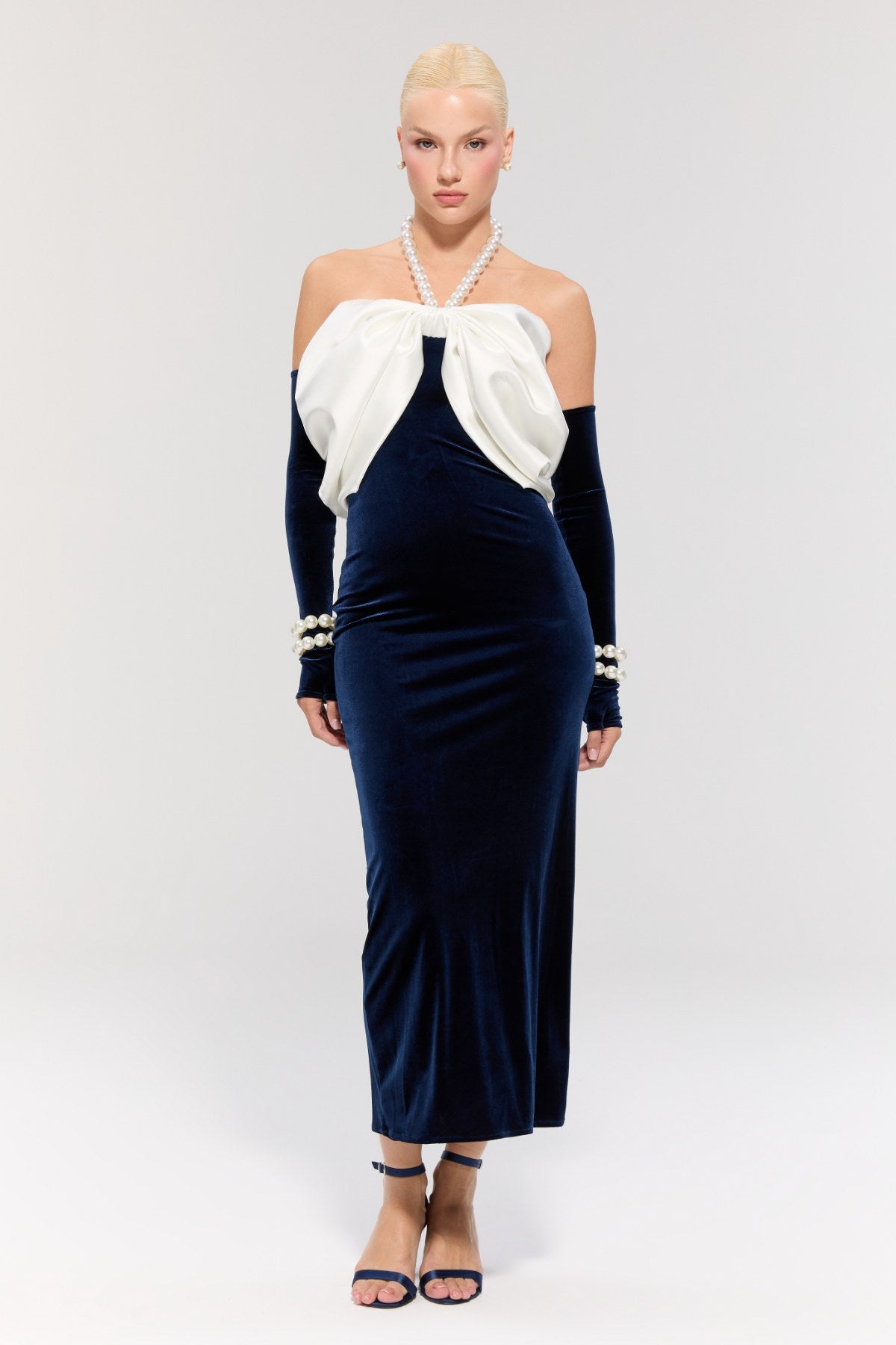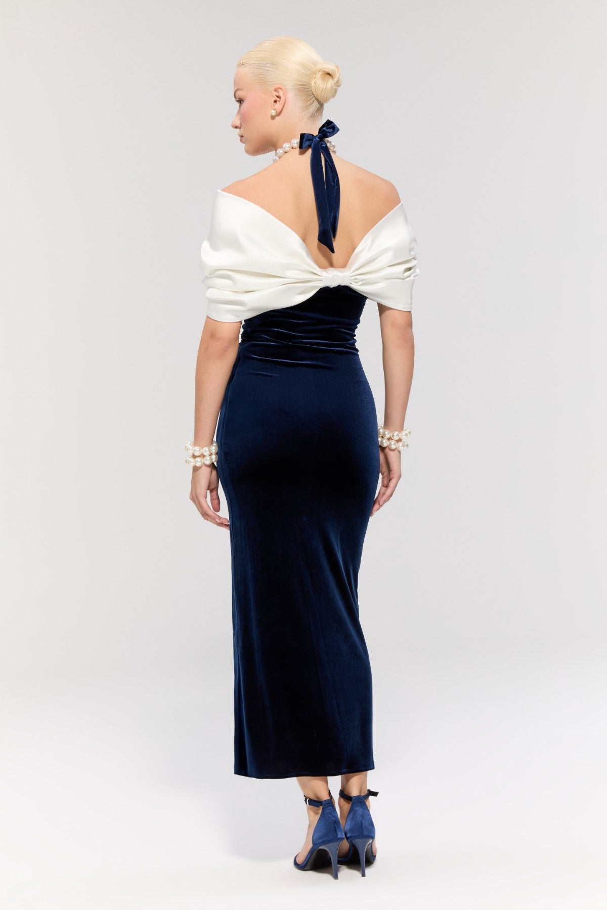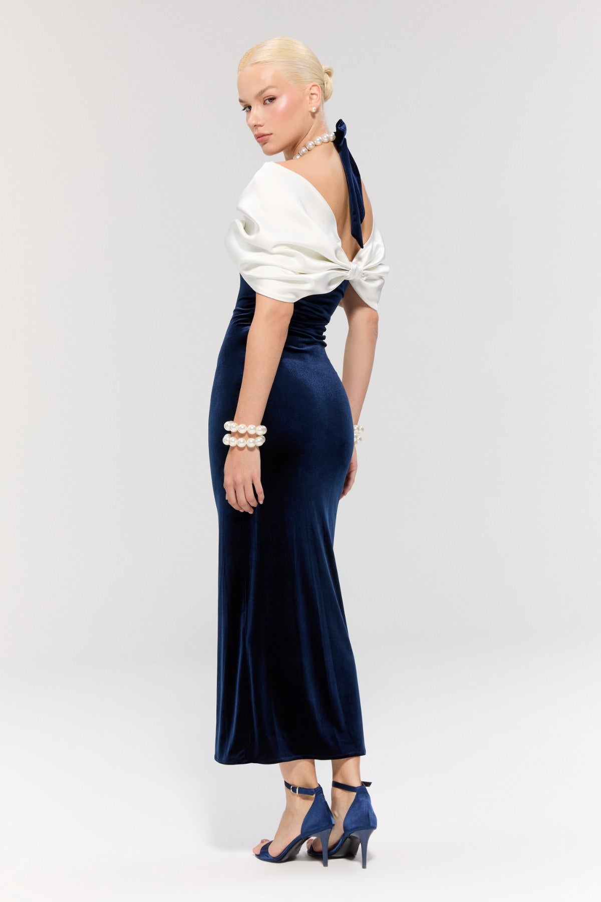 Lacivert kadife kumaşı, vücudu saran kesimi ile sofistike bir hava katarken, omuzdaki saten kumaş beyaz büyük fiyonk detayı tasarıma dinamik bir kontrast sağlar.