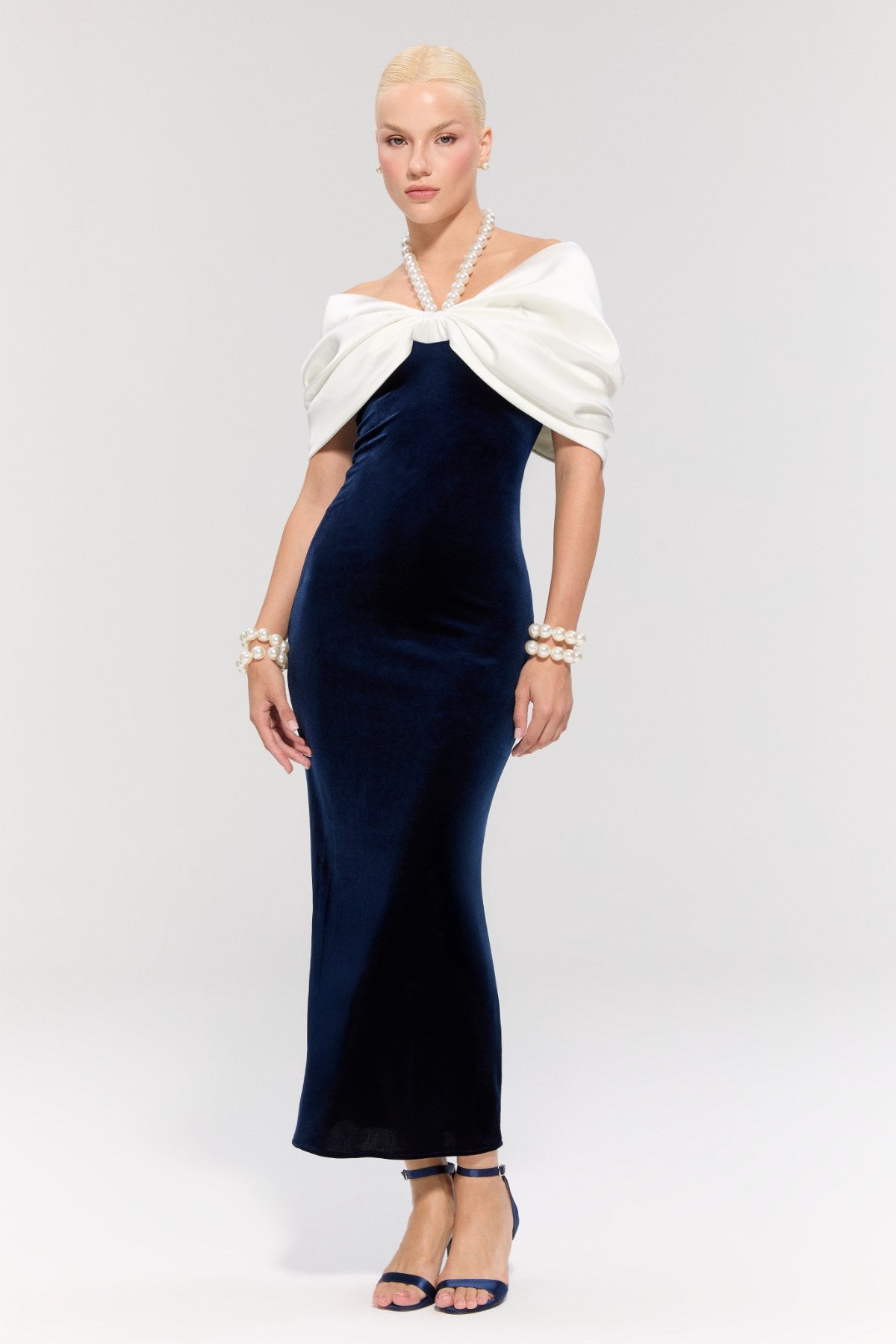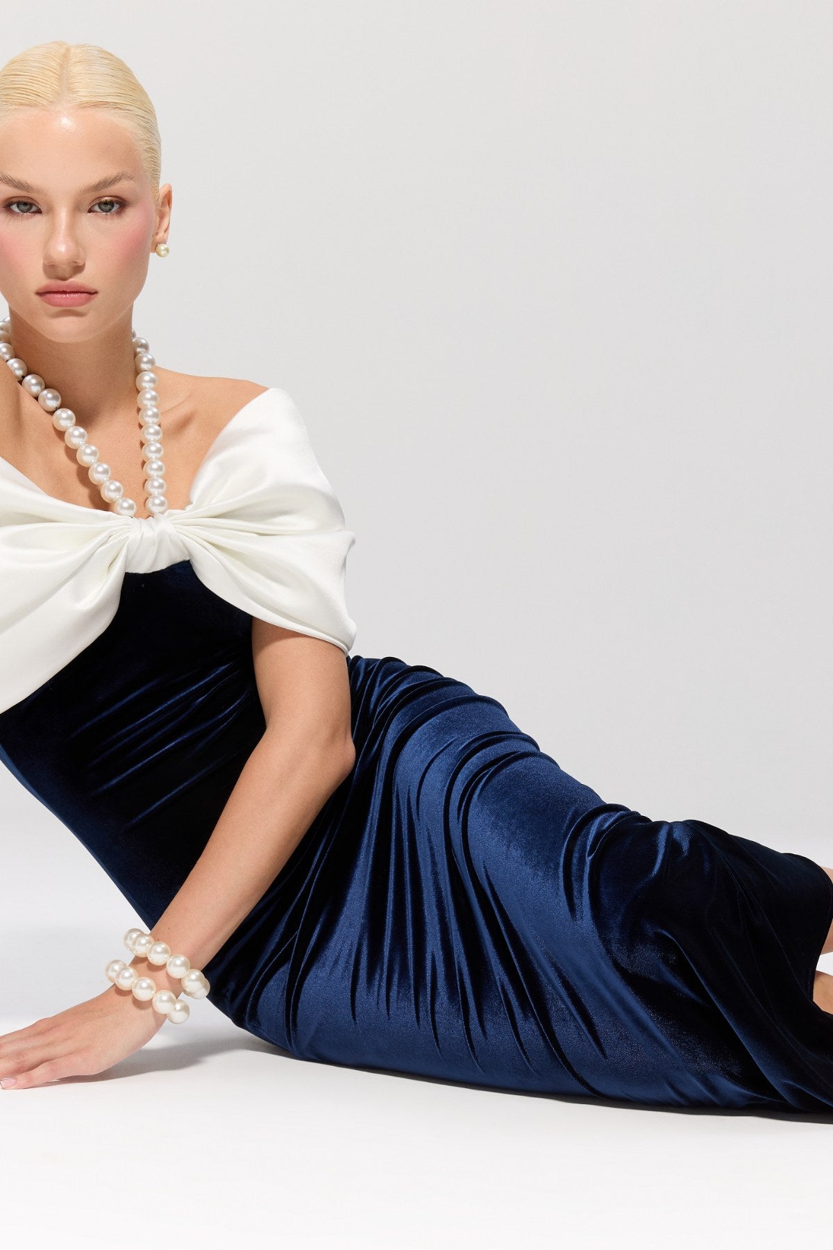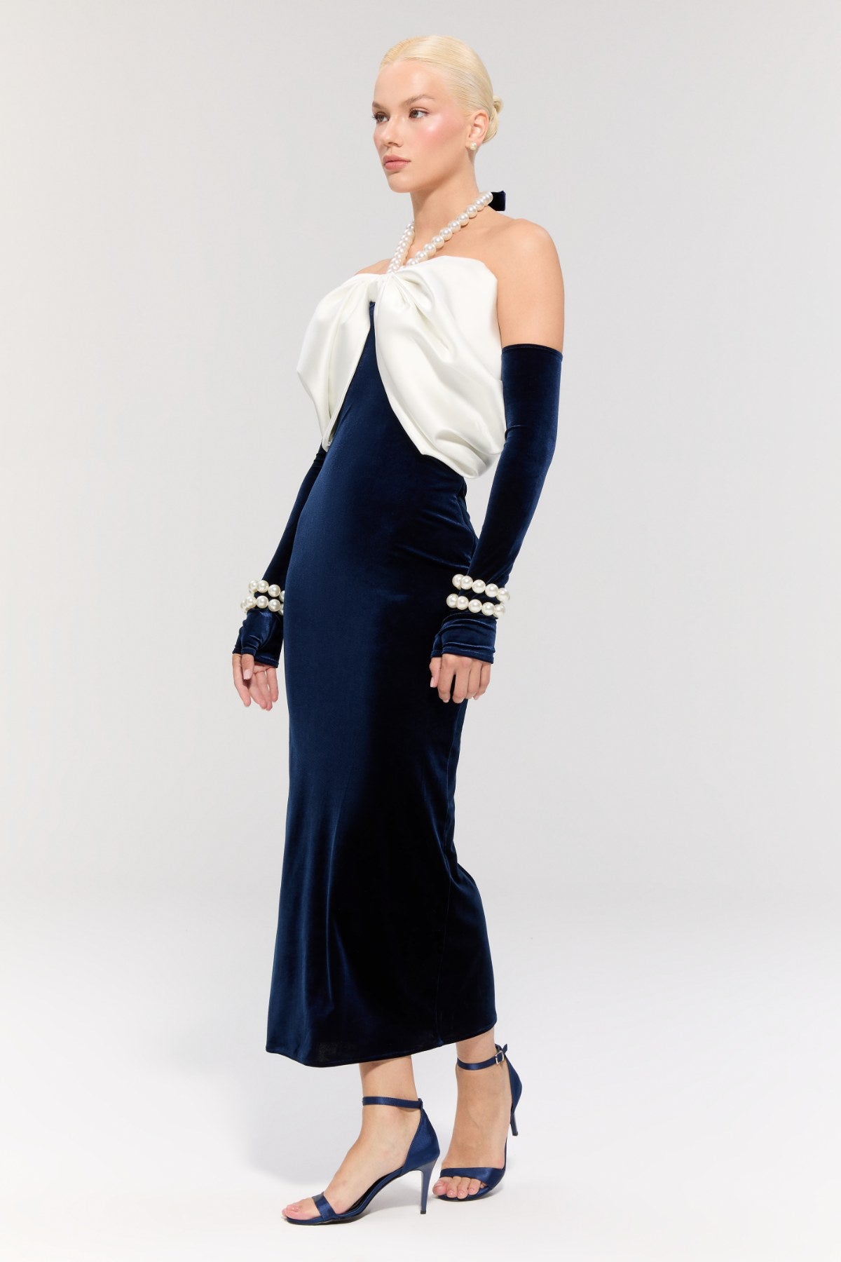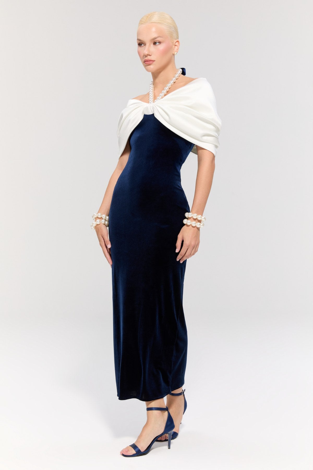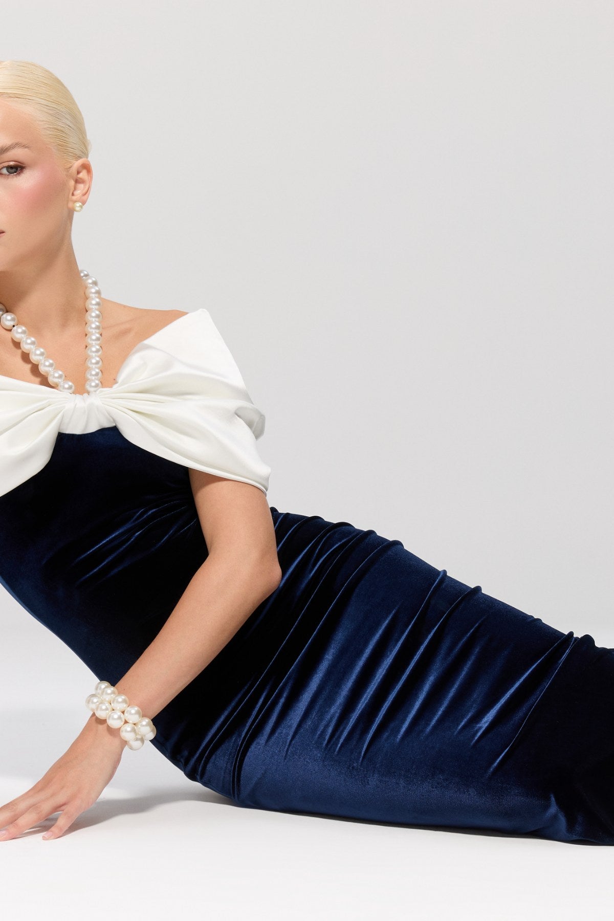 Lacivert kadife kumaşı, vücudu saran kesimi ile sofistike bir hava katarken, omuzdaki saten kumaş beyaz büyük fiyonk detayı tasarıma dinamik bir kontrast sağlar.