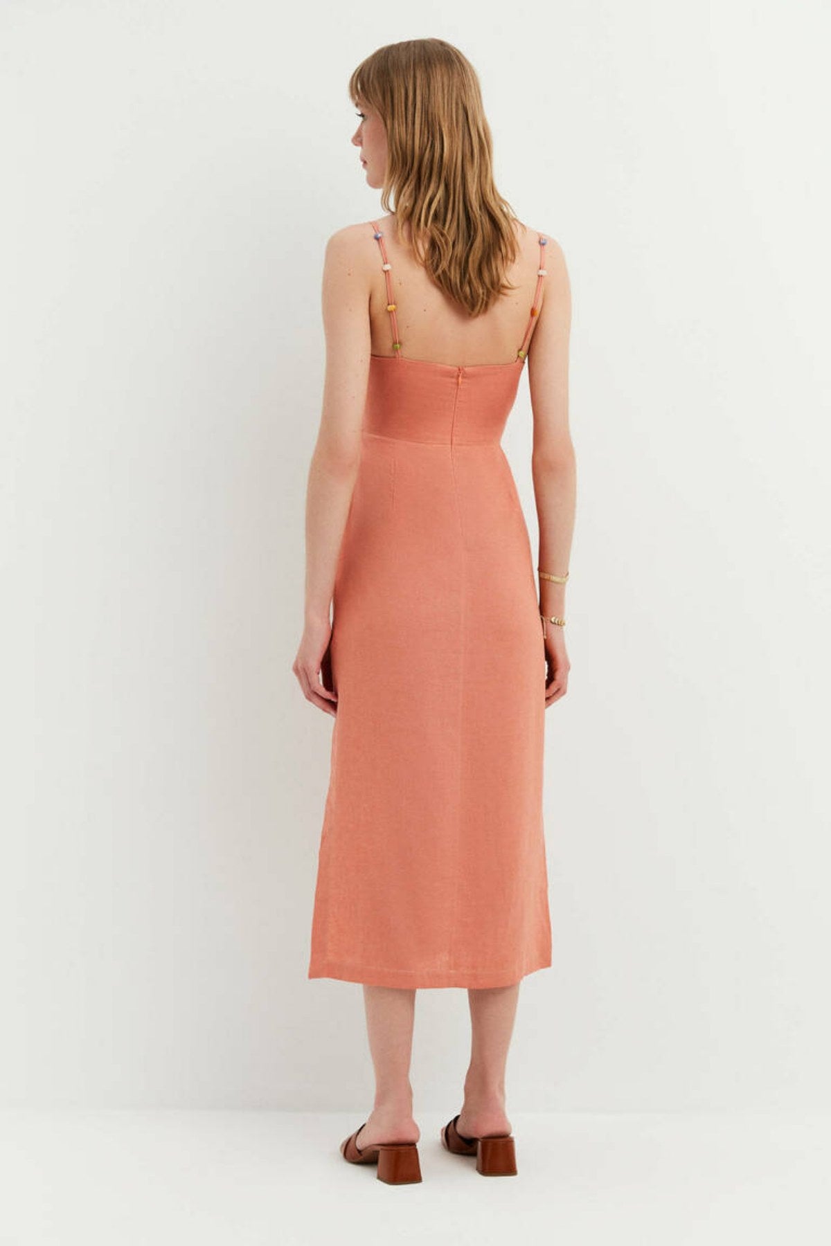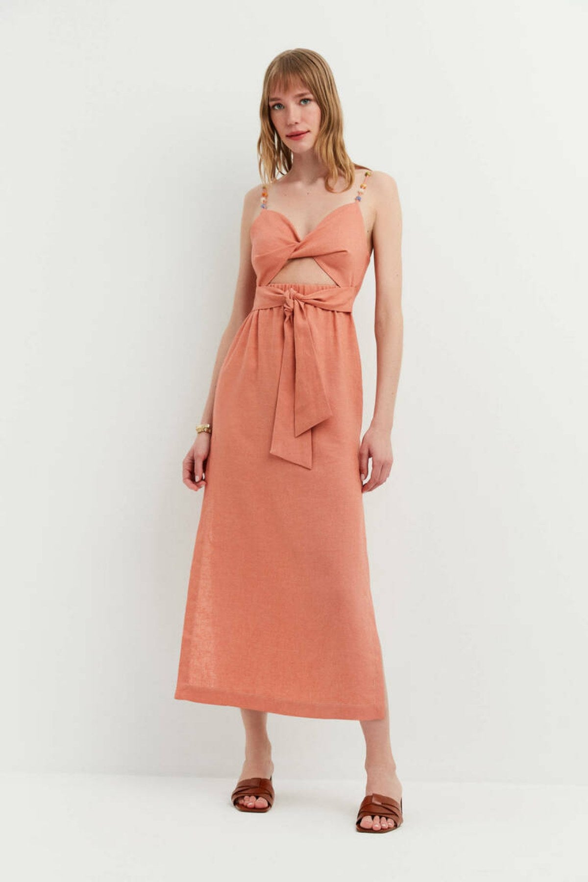 Çok renkli boncuklu ,straplez yaka pencere detaylı uzun elbise