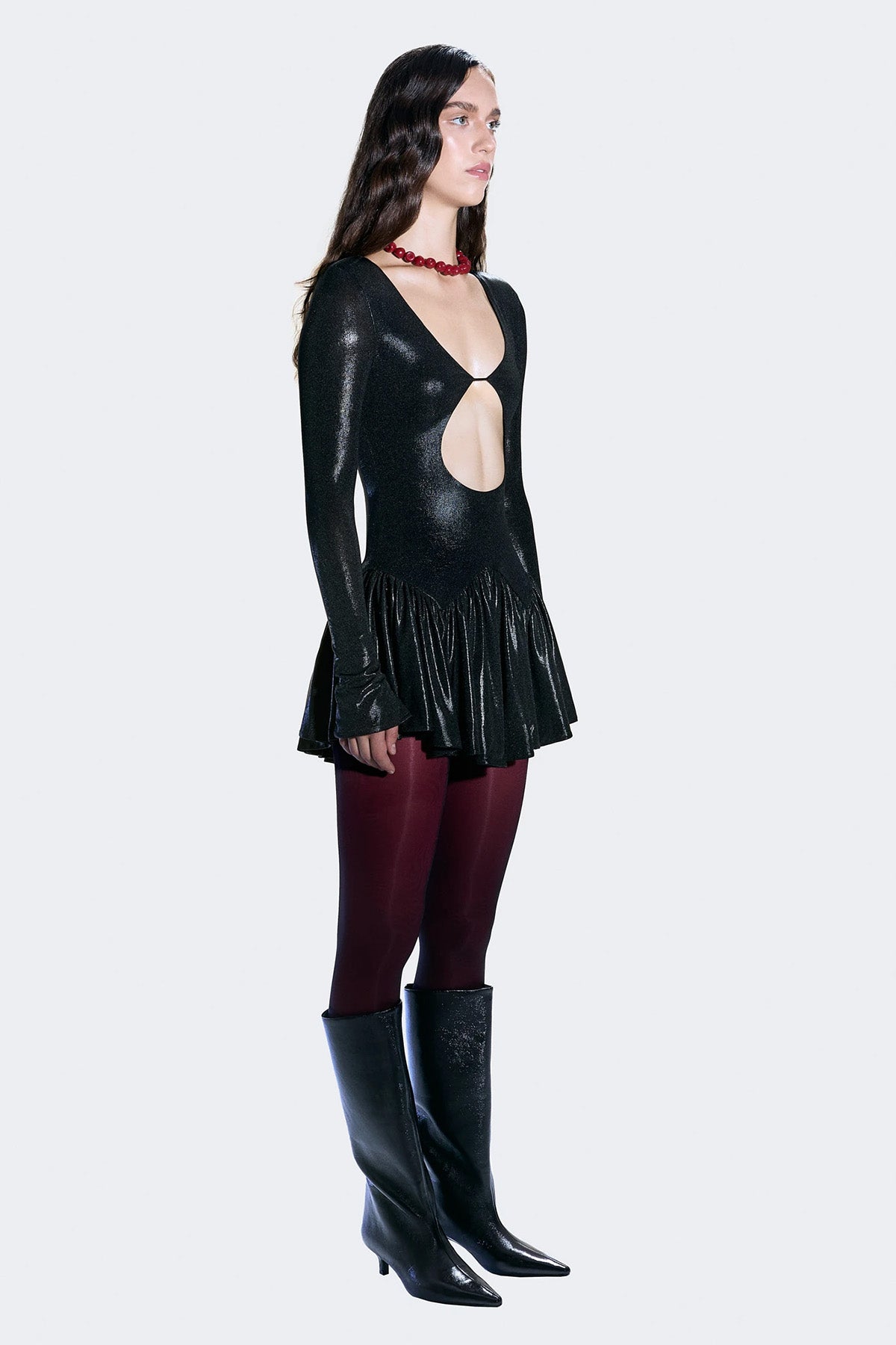 Dekolteli esnek kumaşlı kısa parlak siyah elbise. Eteği zikzak volanlıdır.