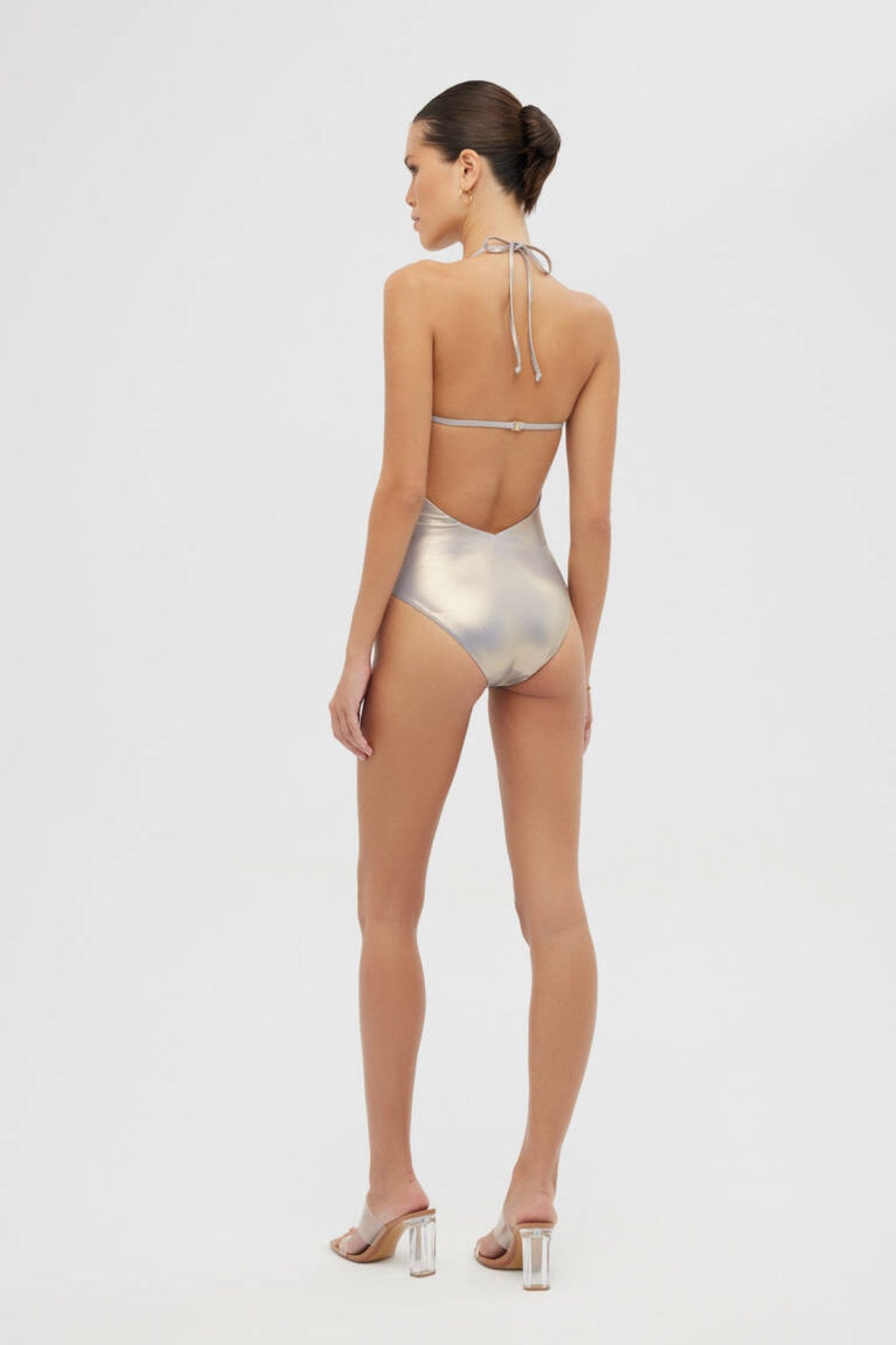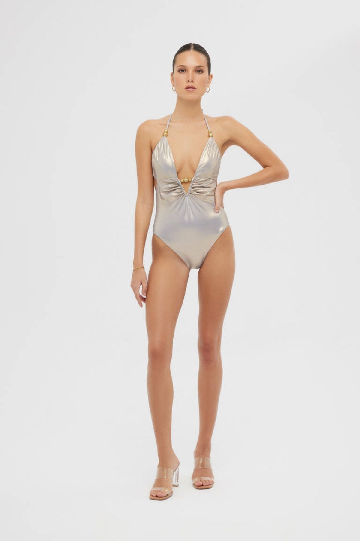 Derin v yaka, boncuk detaylı ve büzgülü üçgen mayo