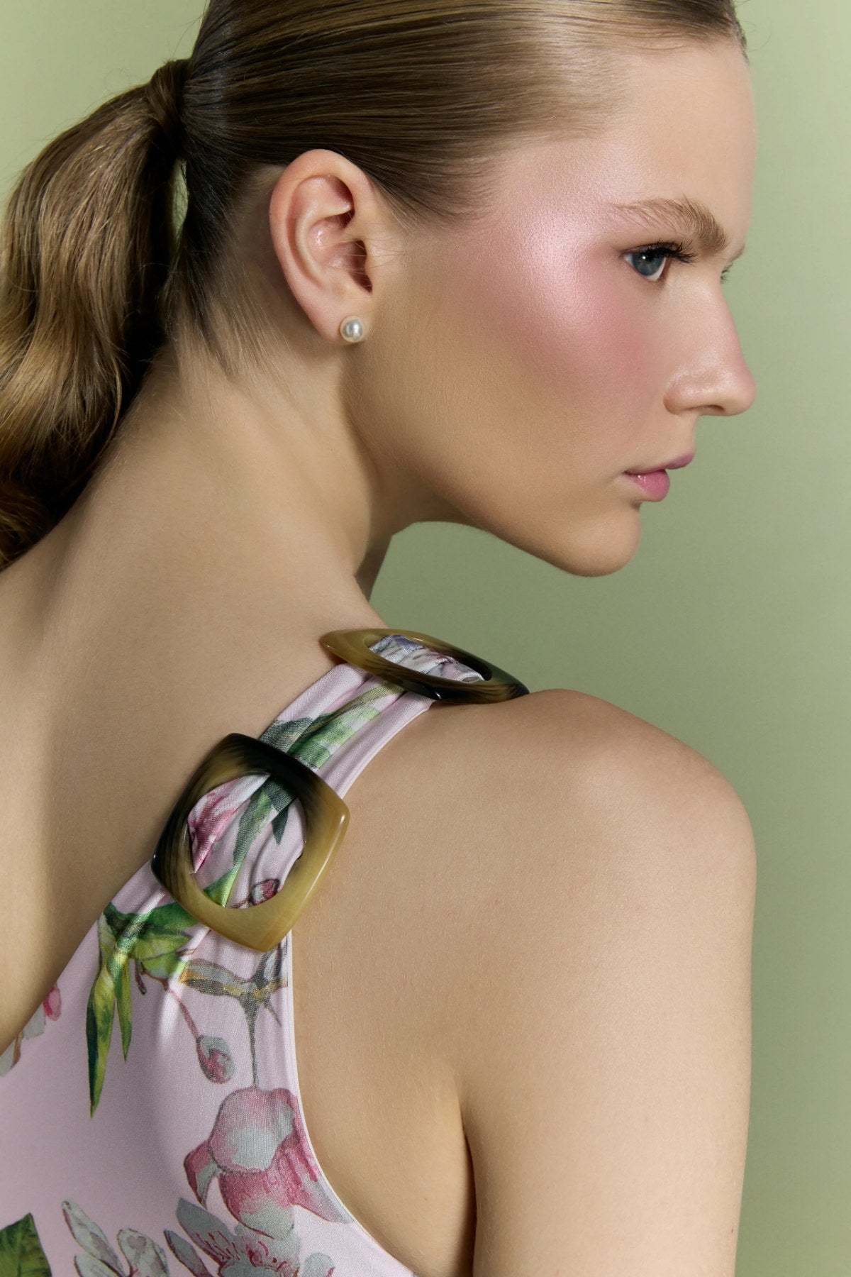 Pembe tonlarda çiçek desenli kumaşıyla zarif bir görünüm sunuyor.