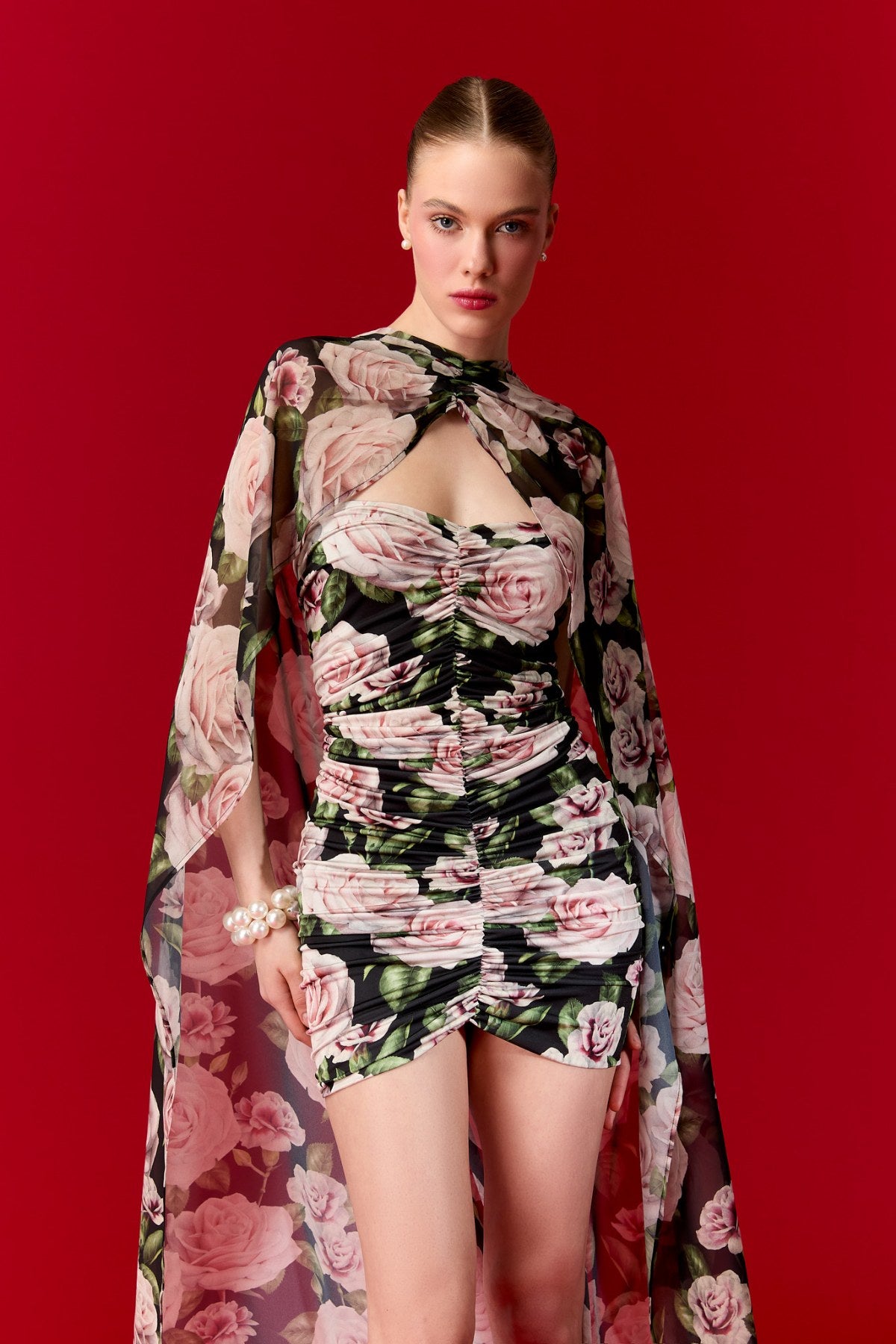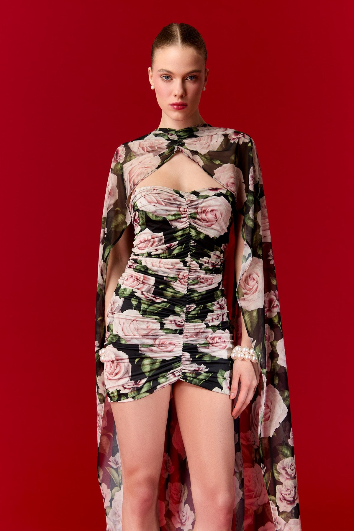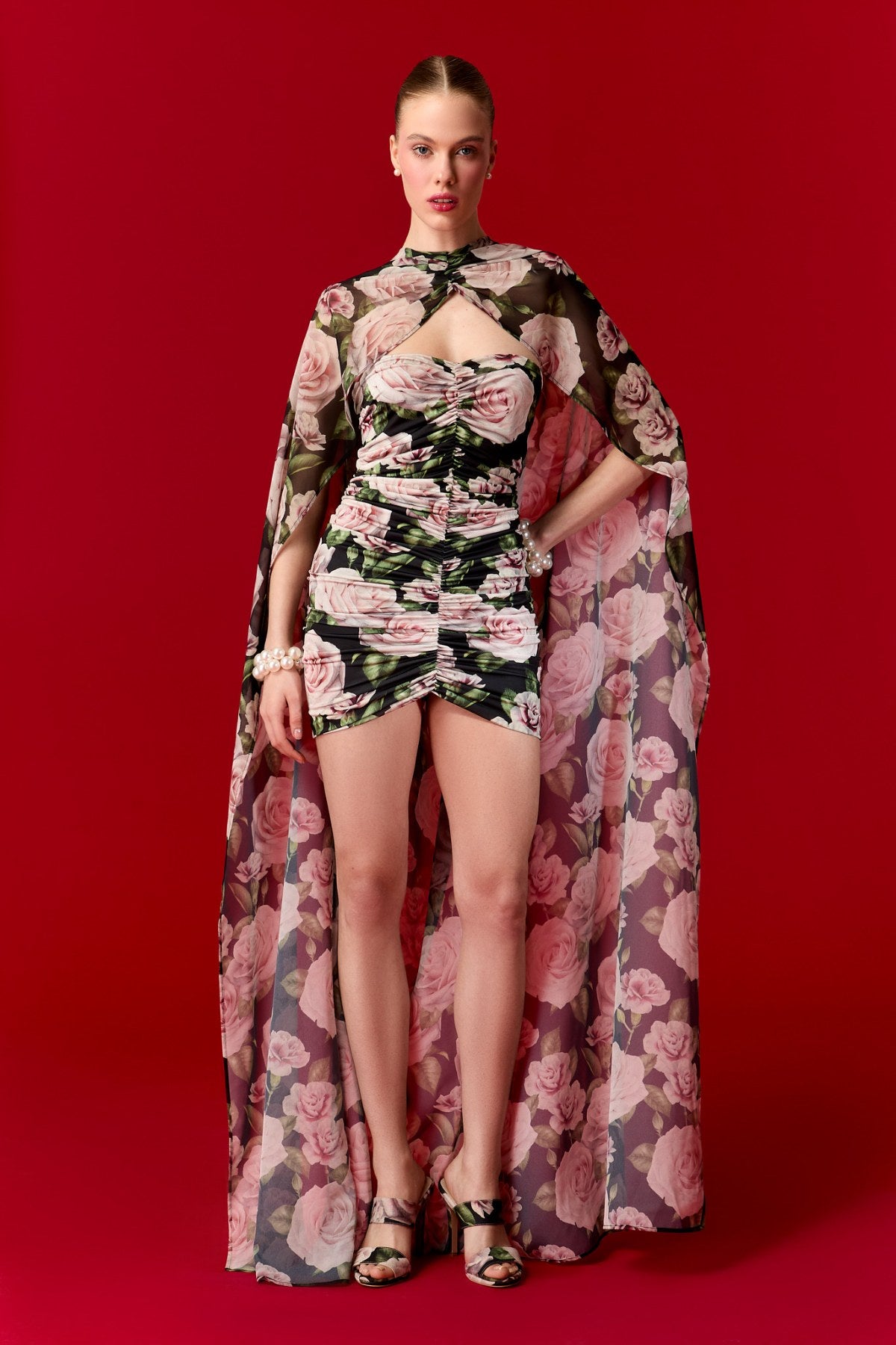 Straplez yaka kesimiyle vücudu saran drapeli mini elbise, feminen bir siluet oluştururken çıkarılabilir uzun şifon peleriniyle iki farklı tarz yaratmanıza olanak tanır.