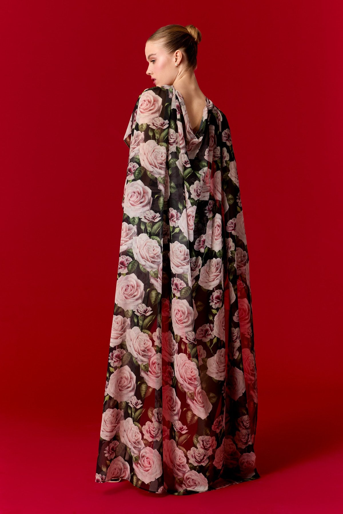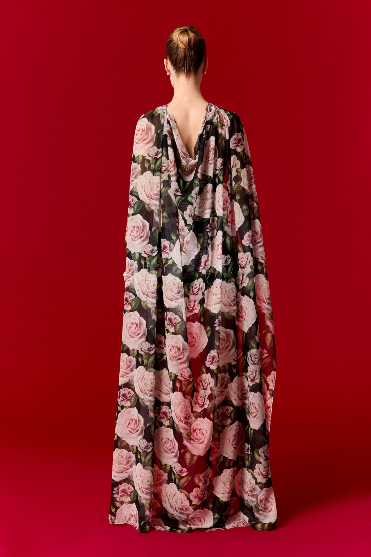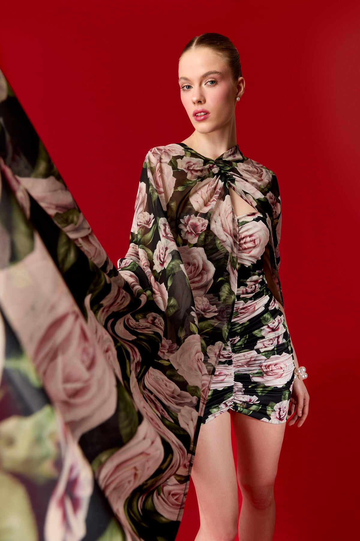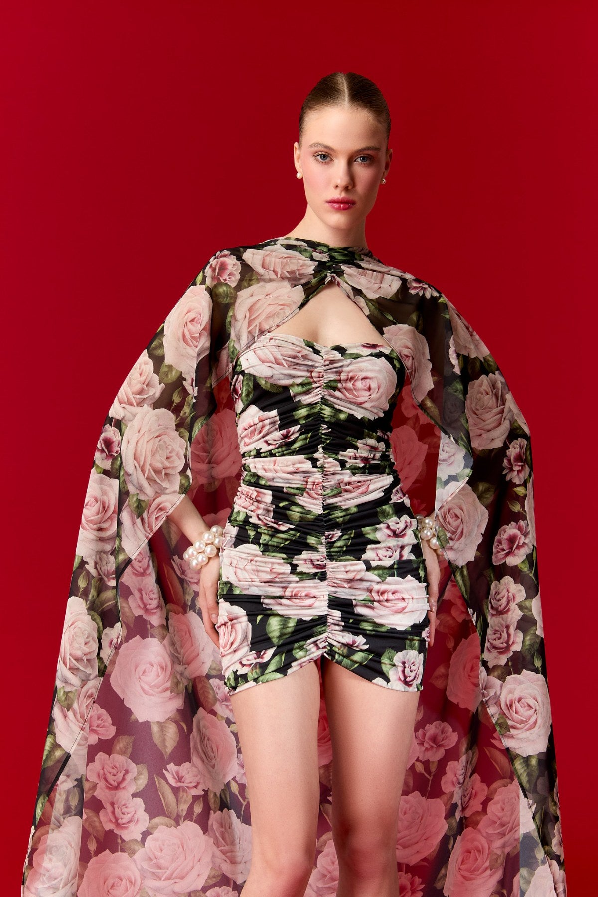 Straplez yaka kesimiyle vücudu saran drapeli mini elbise, feminen bir siluet oluştururken çıkarılabilir uzun şifon peleriniyle iki farklı tarz yaratmanıza olanak tanır.