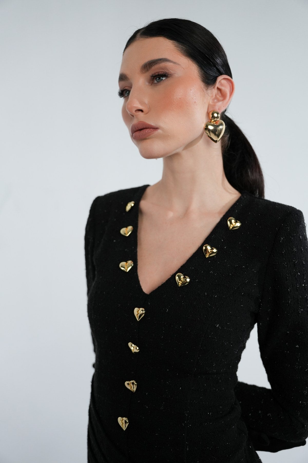 Siyah yumuşak tüvit kumaş üzerine, gold kalp aksesuar ve biye detaylı elbise