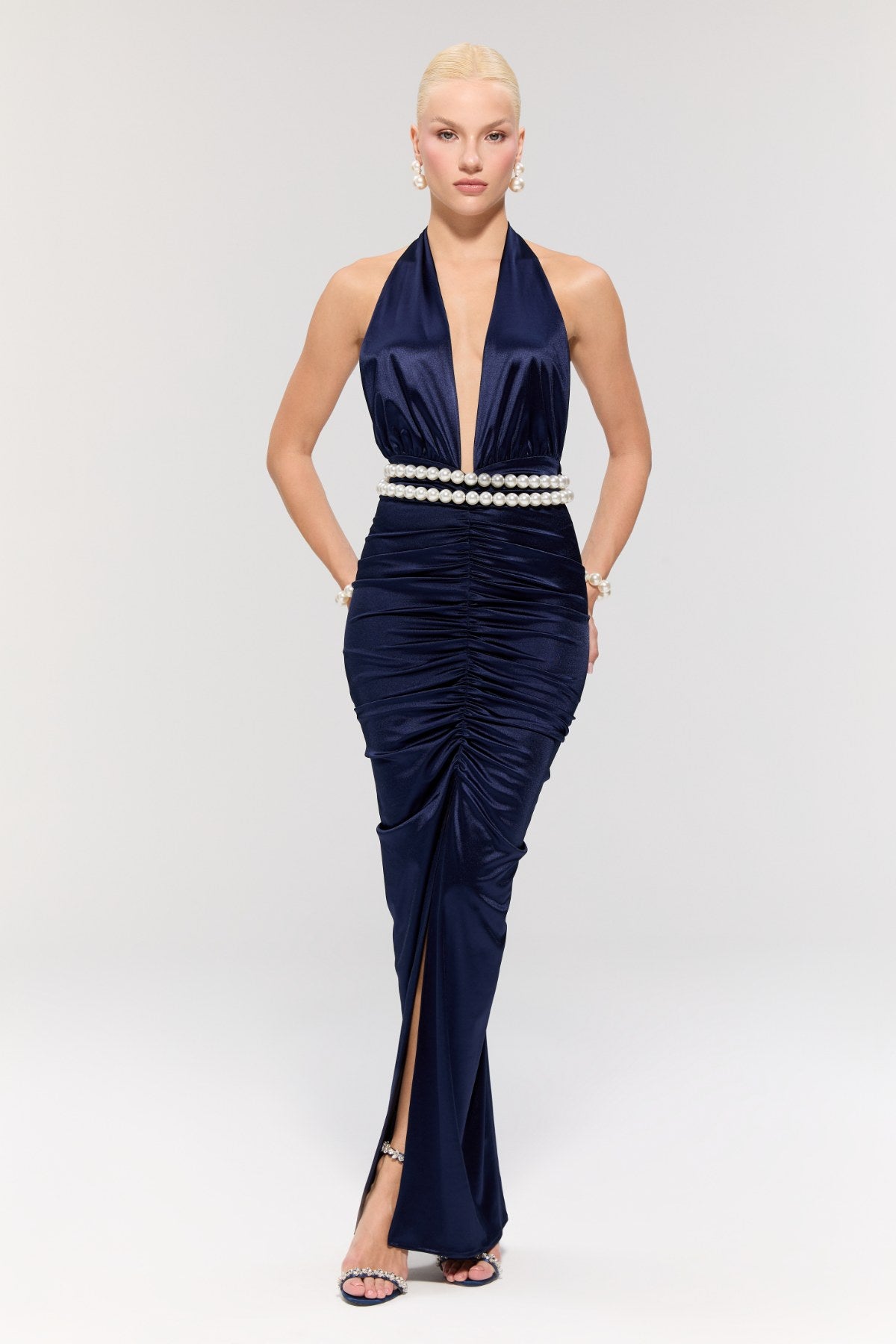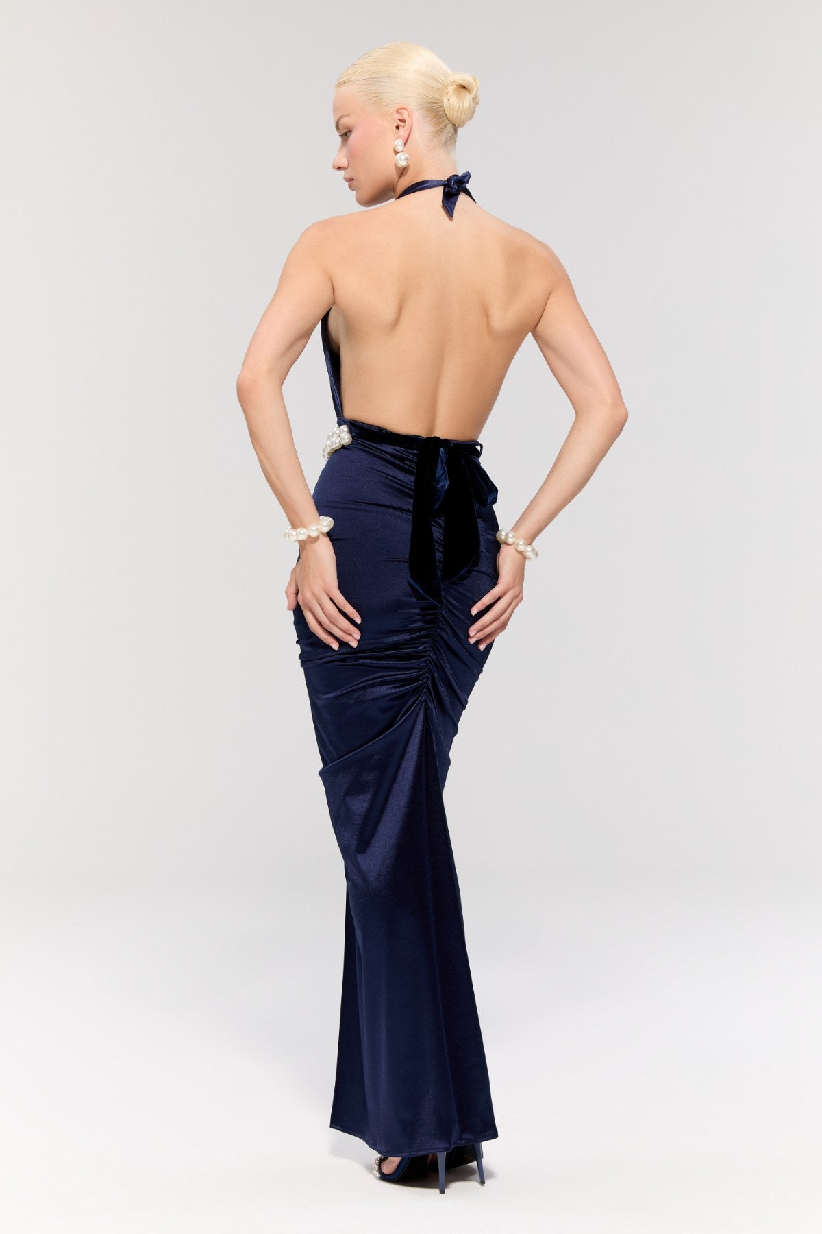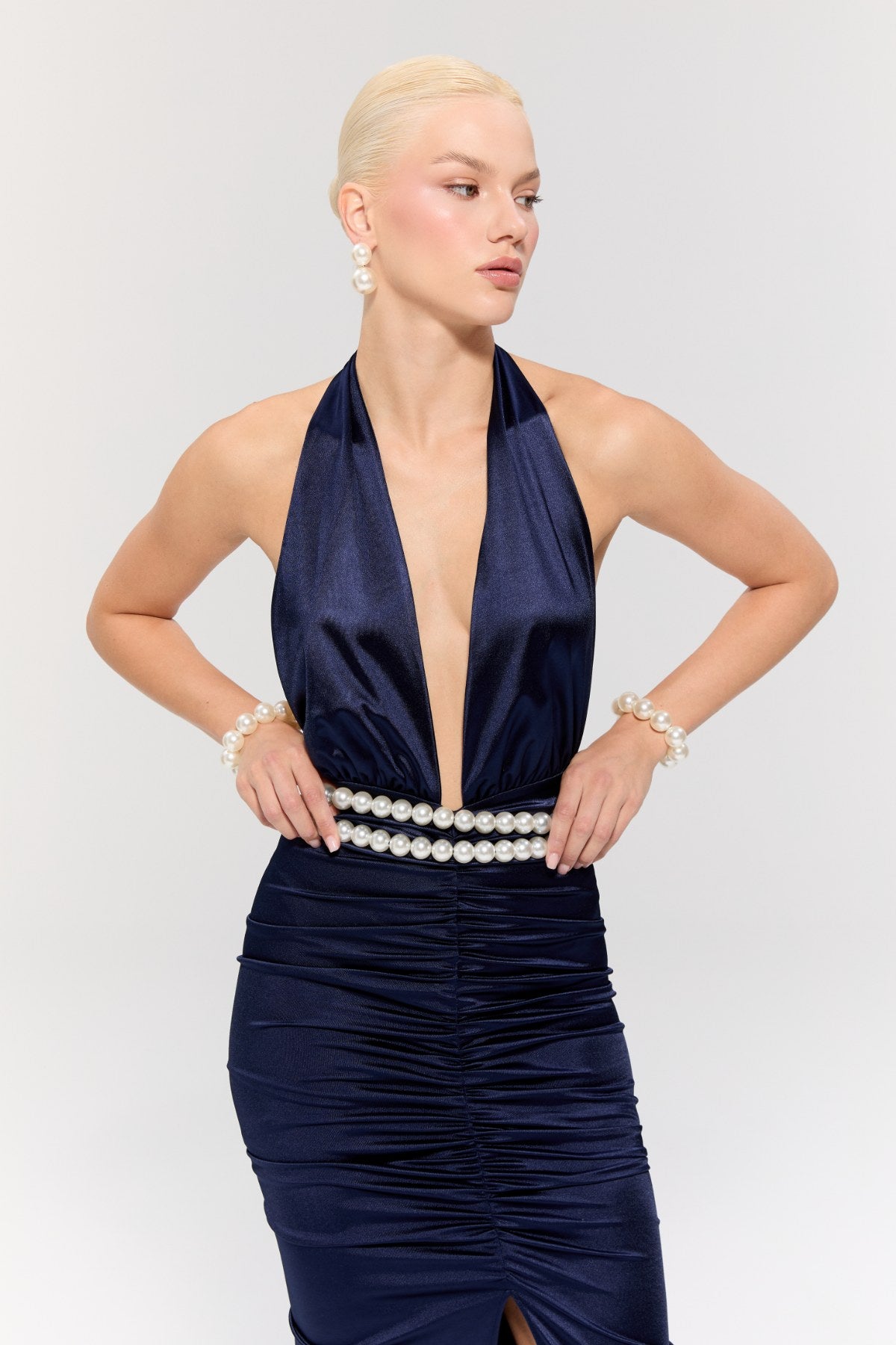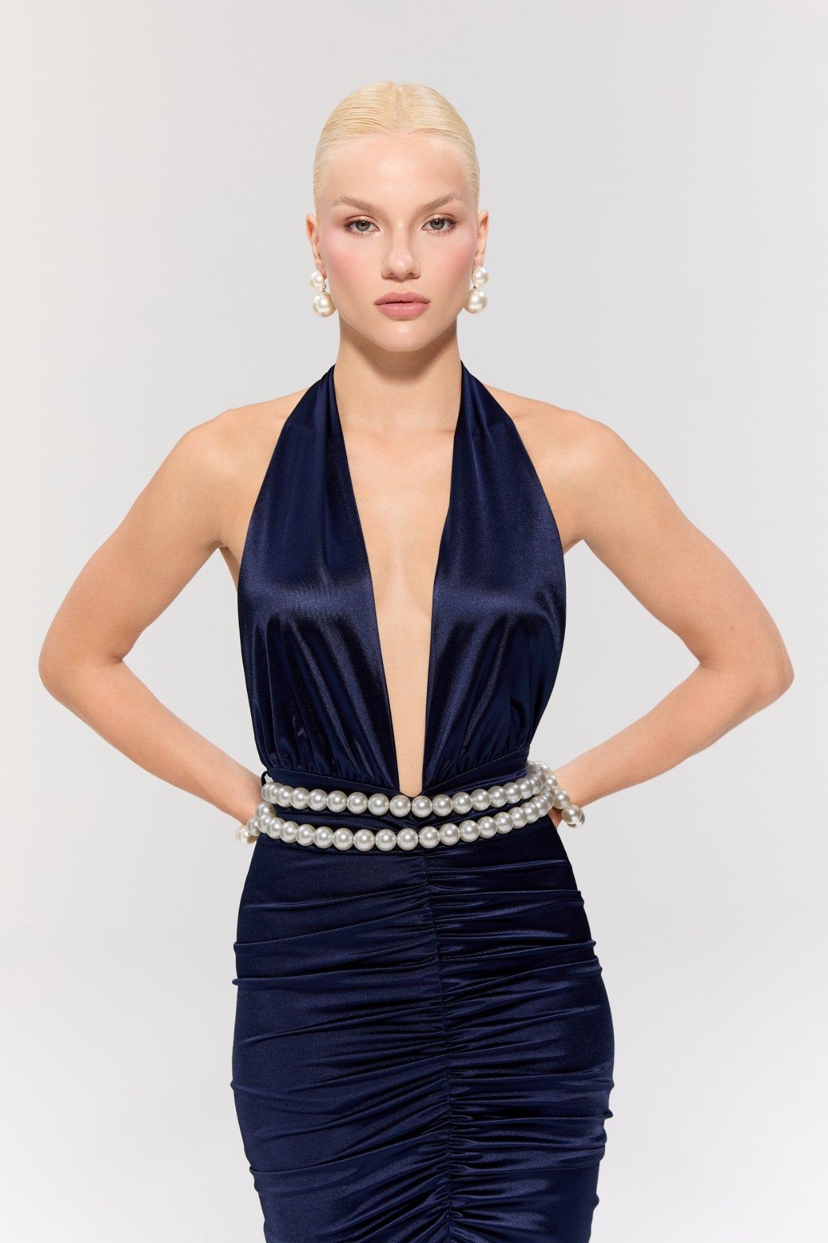 Elbise, boyundan bağlamalı derin V yakasıyla şık ve sofistike bir görünüm sunar.