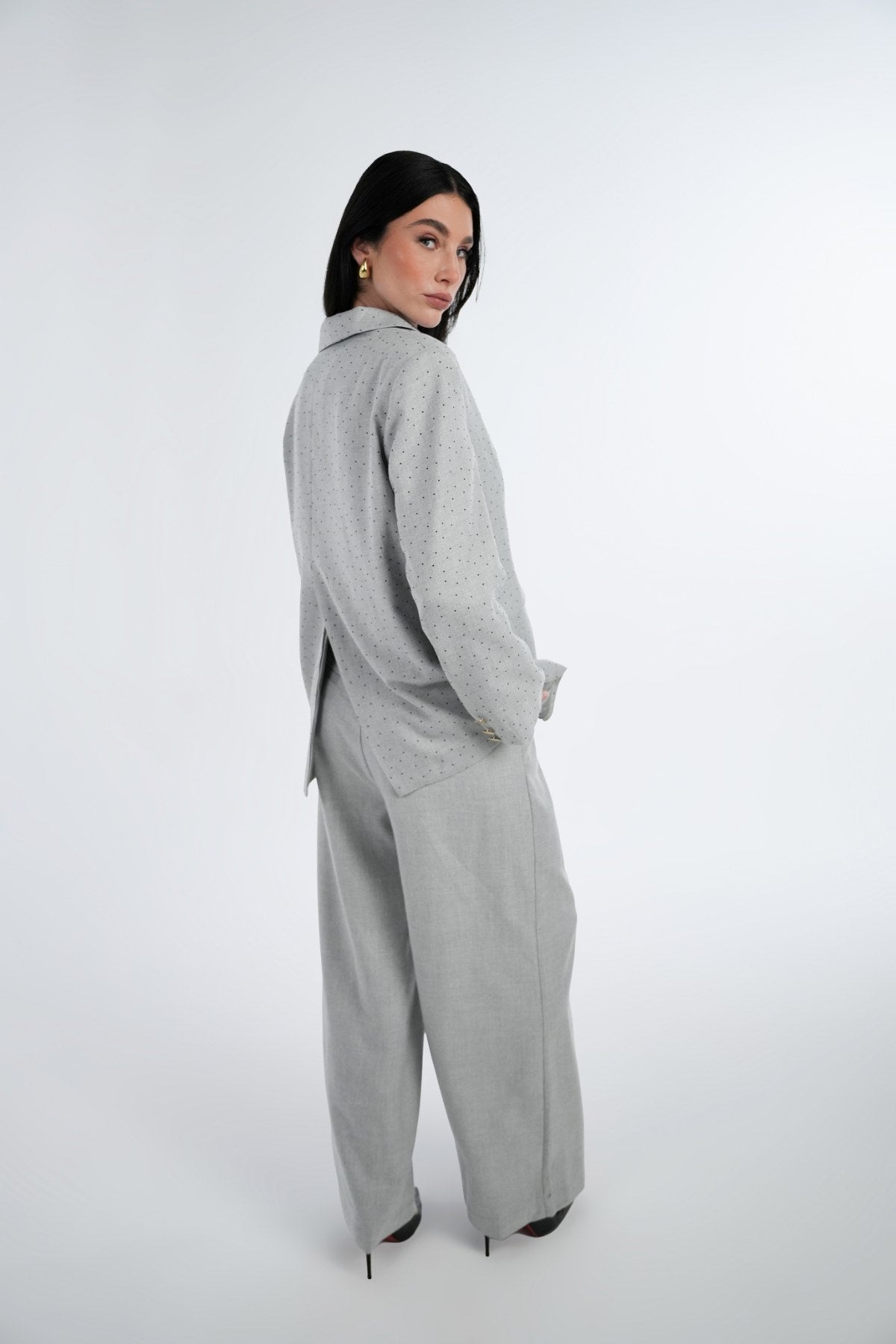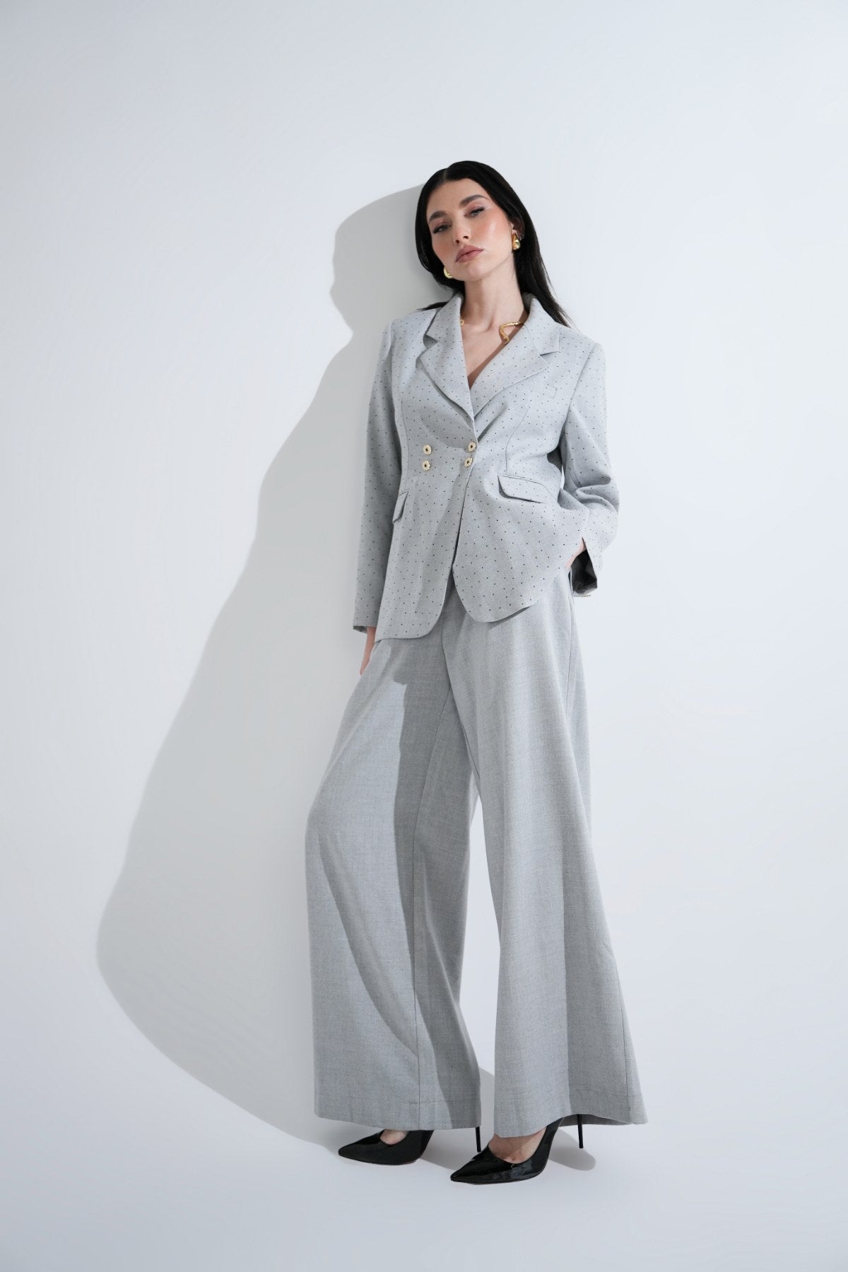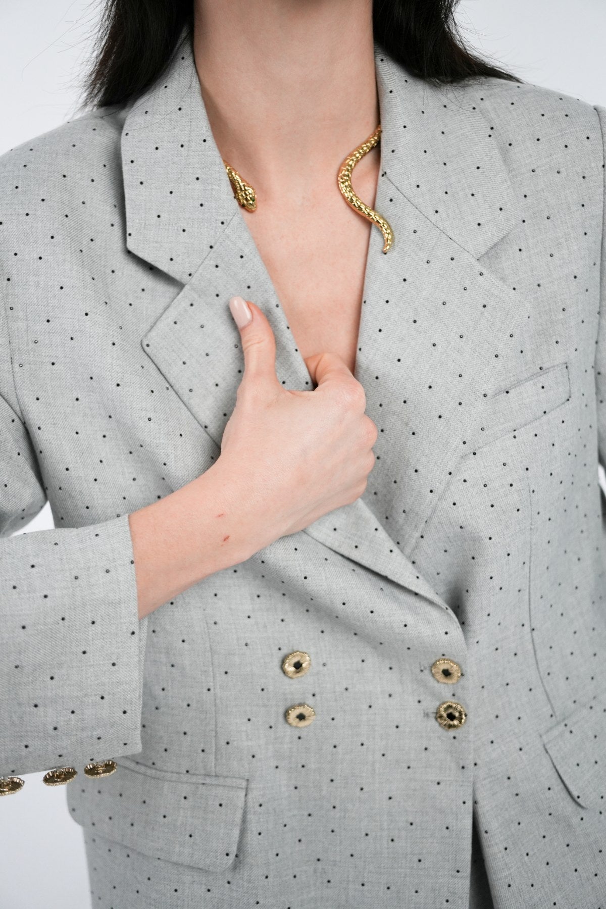 Siyah taş detaylı, gold düğmeli, gri oversize ceket