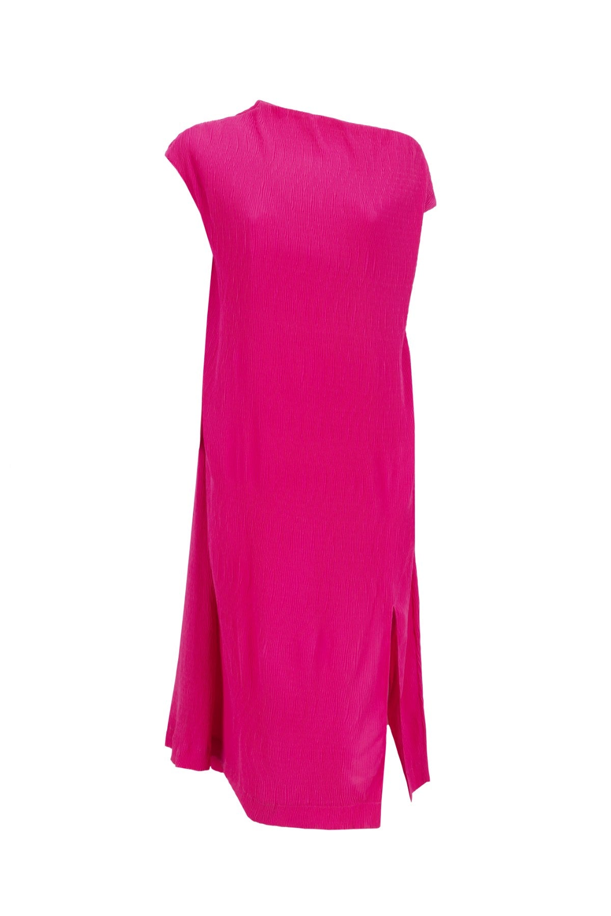 Fuşya renkte, kısa kollu, omuzdan büzgülü ve mini boy kesime sahip, yumuşak hatlara sahip bir elbisedir. Üretim yeri: Türkiye.