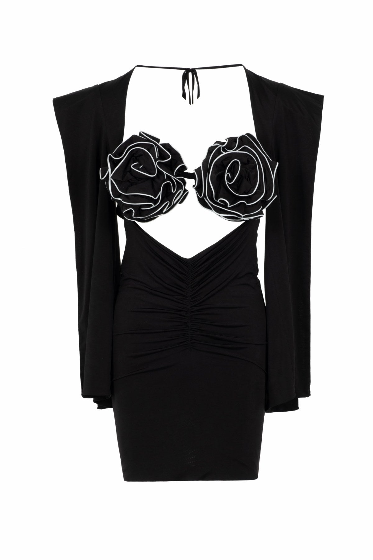 Göğüs Çiçek Detaylı uzun kollu sırt dekolteli mini elbise