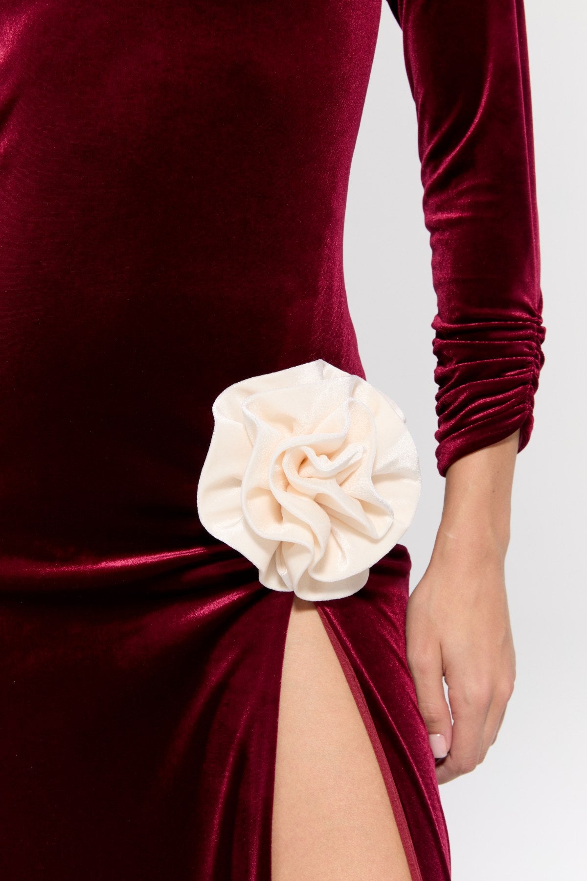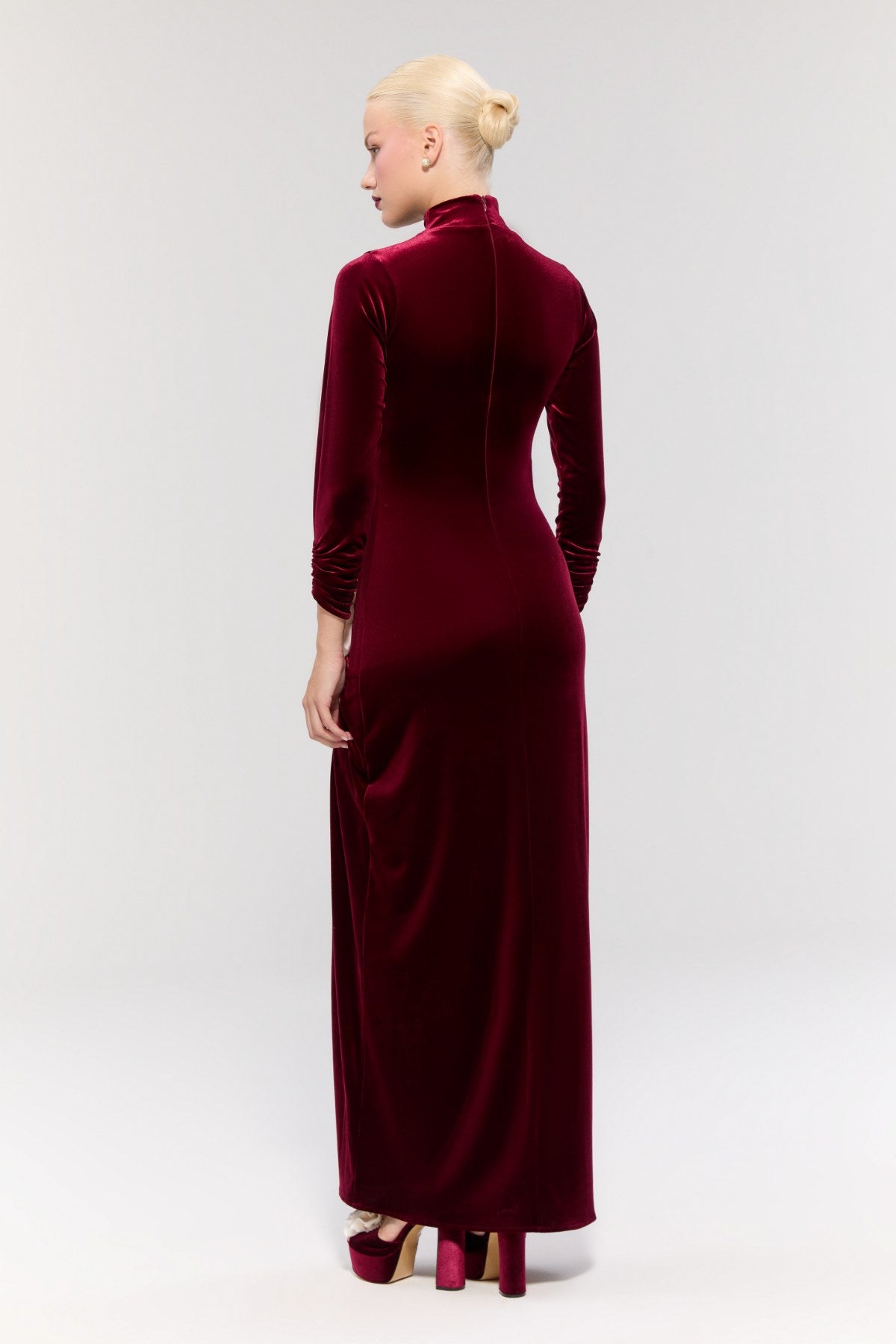 Elbise, uzun kollu bordo kadife kumaşıyla sofistike ve göz alıcı bir görünüm sunar.