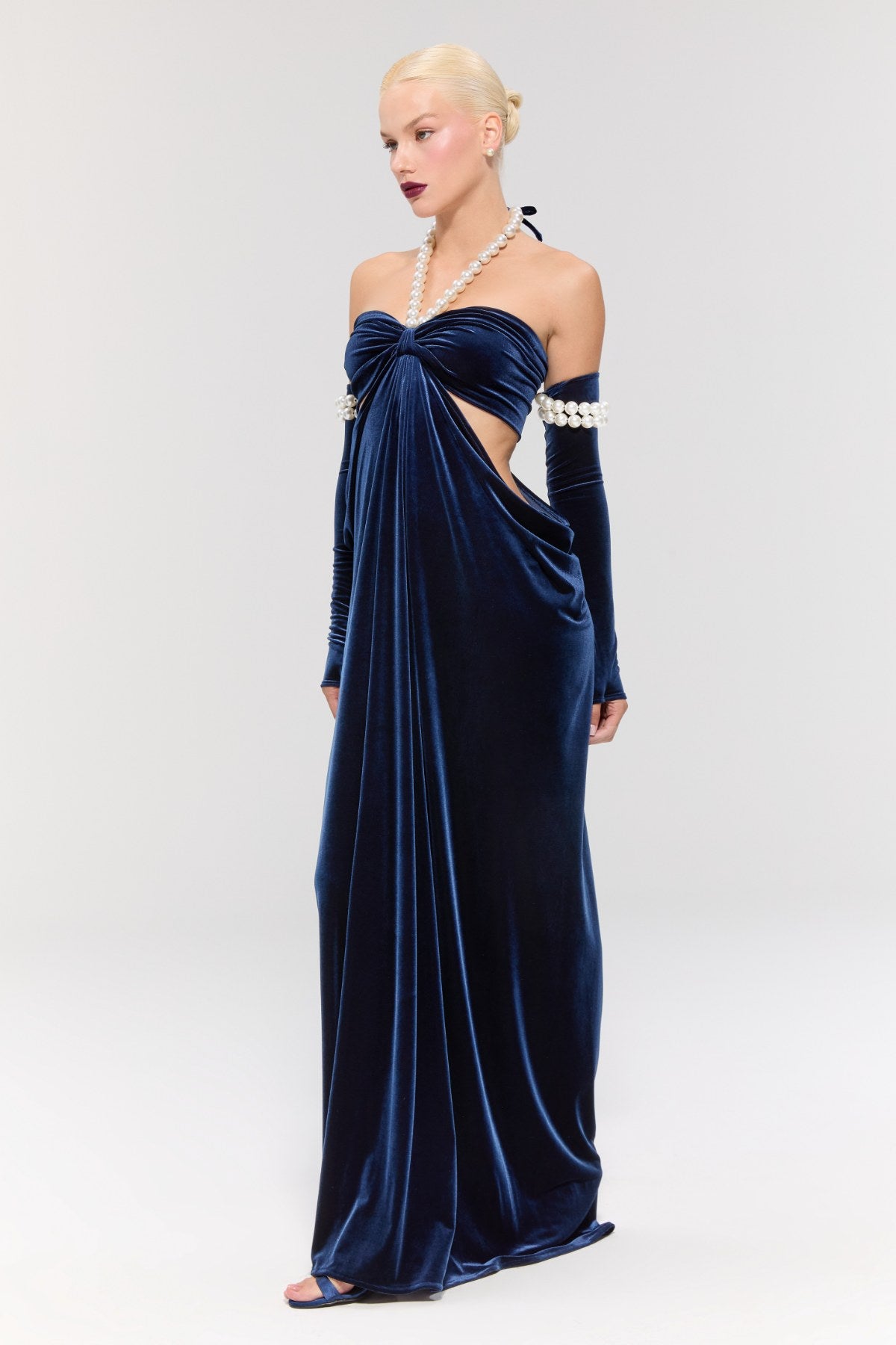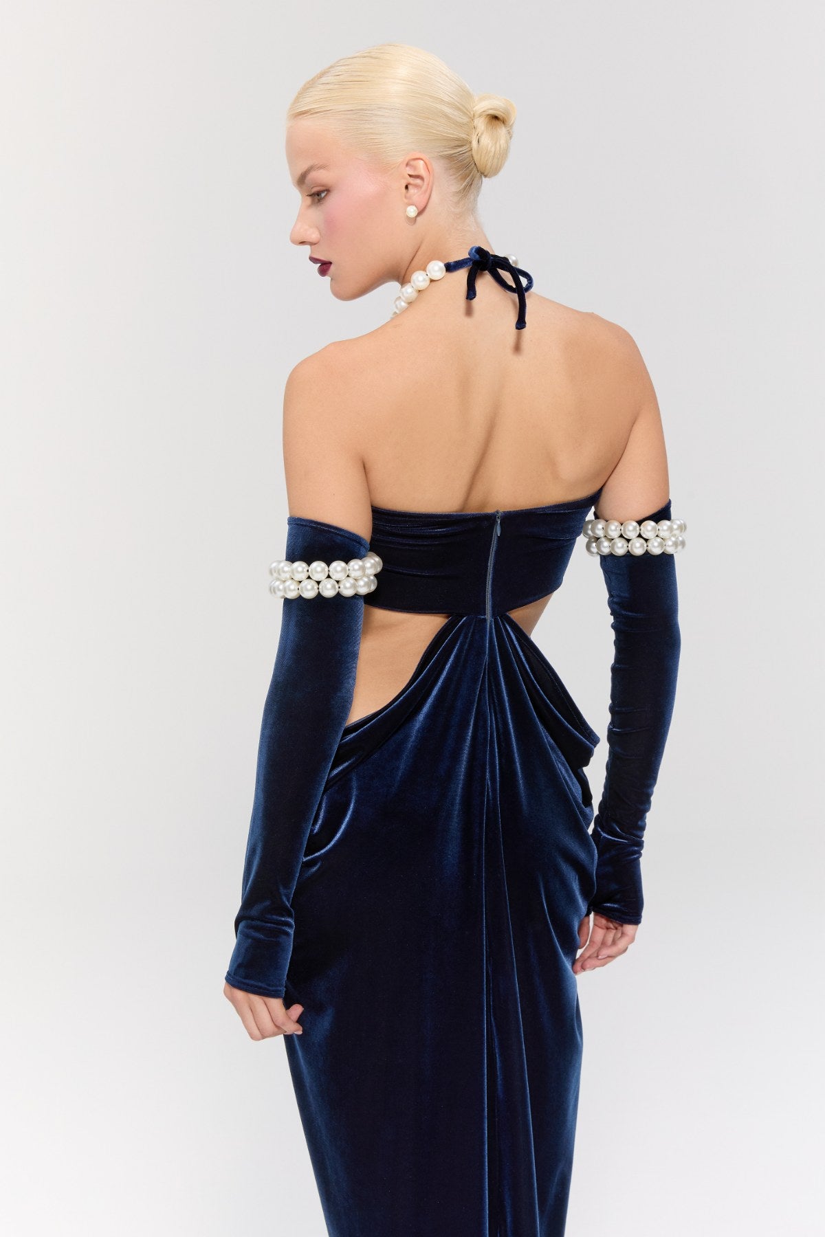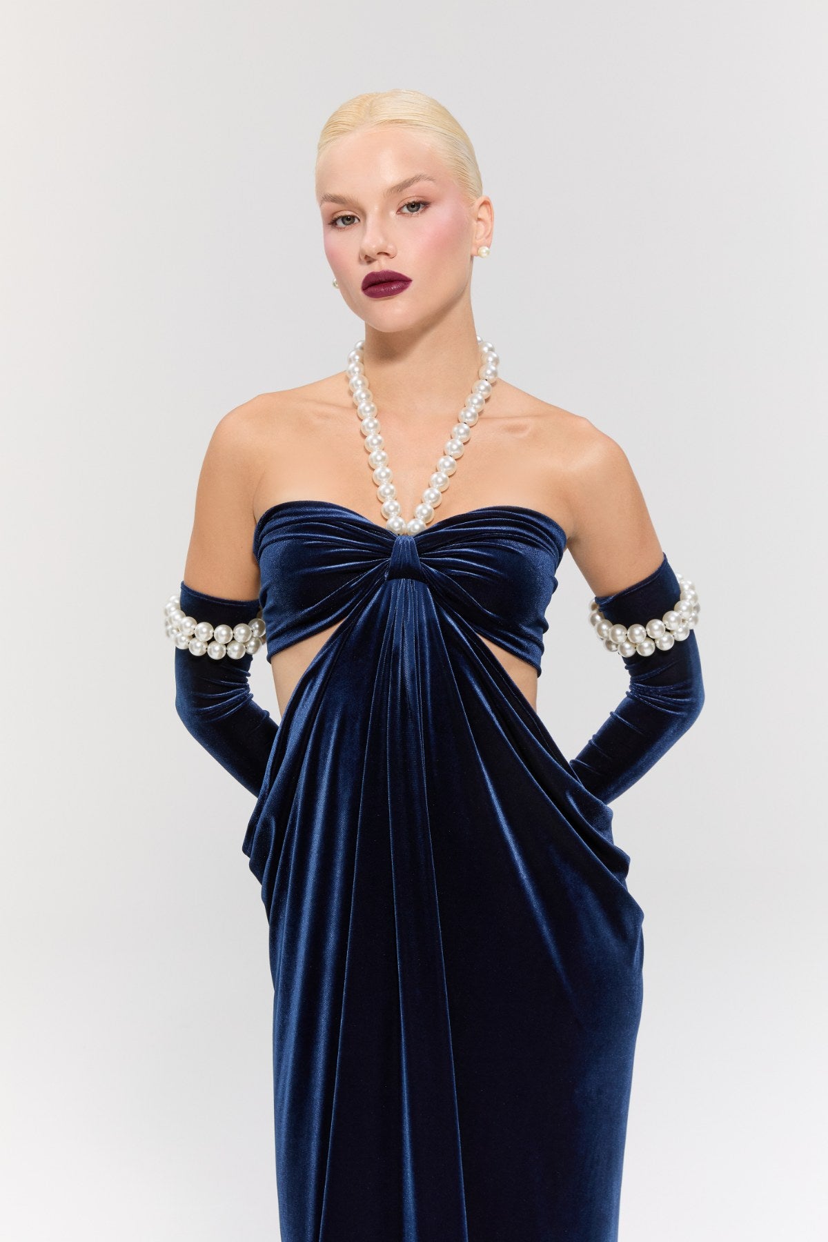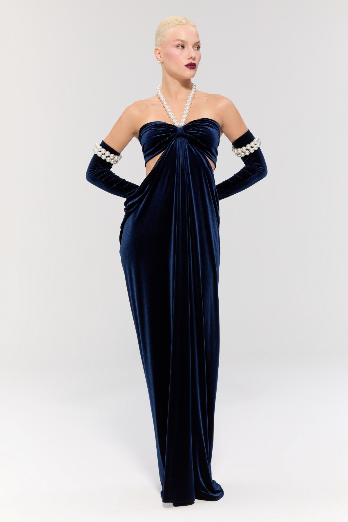 Elbise, lacivert kadife kumaşıyla sofistike bir şıklık sunar.