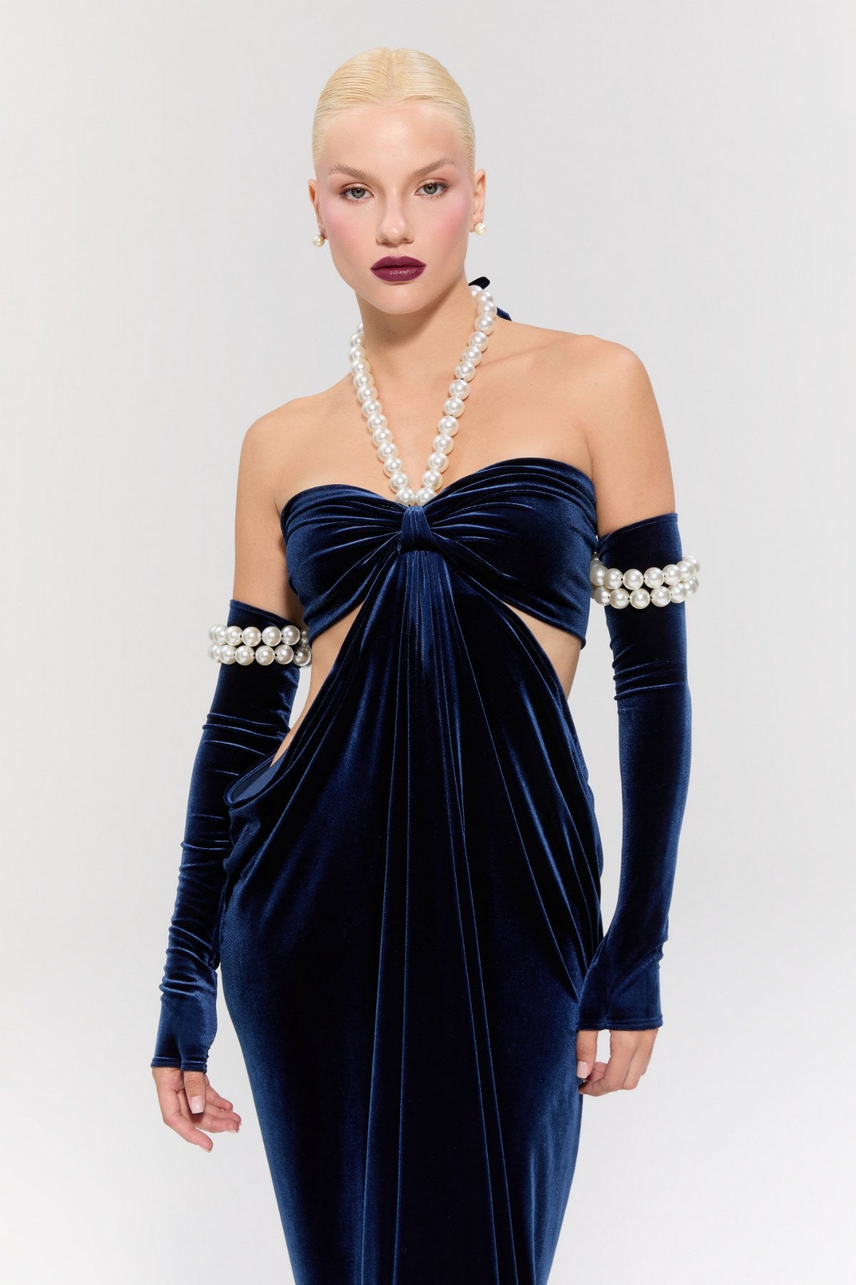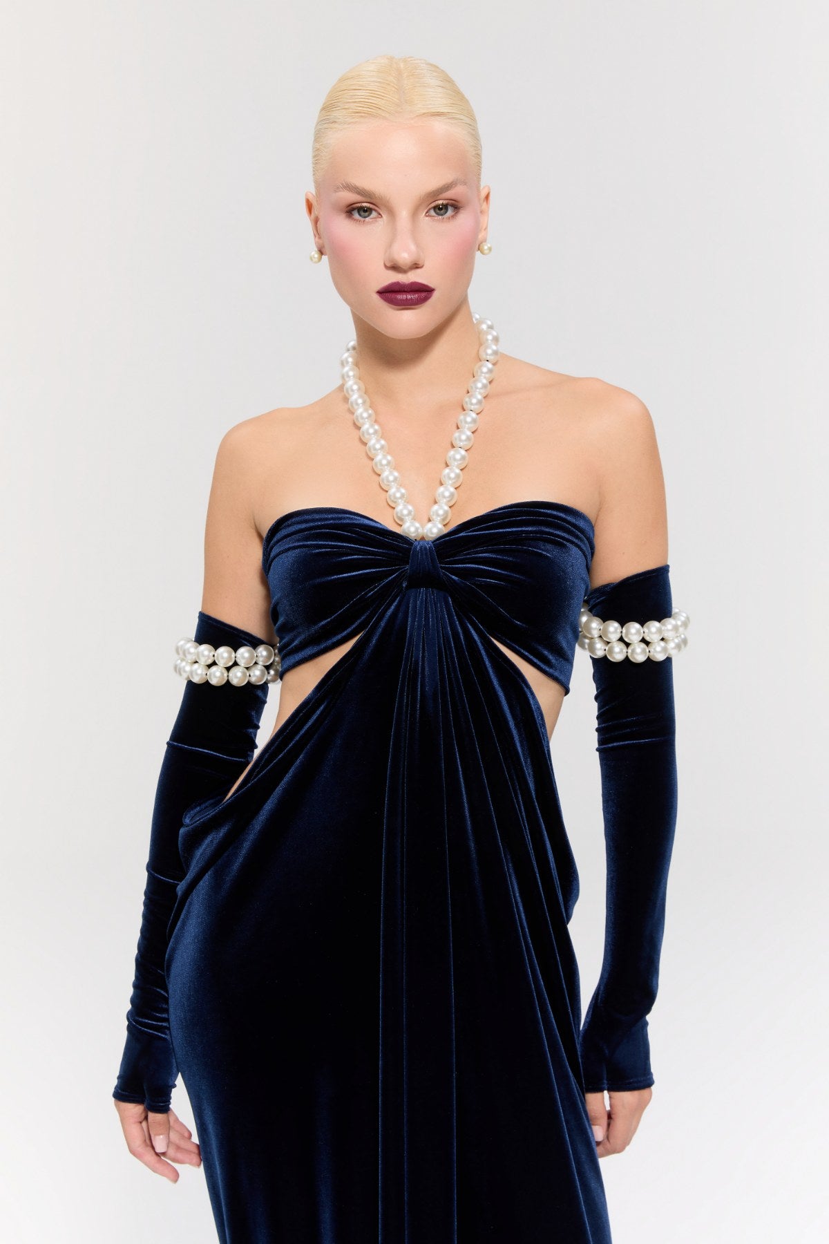 Elbiseye dahil incili eldivenler ise şıklığı tamamlayarak göz alıcı bir bütünlük oluşturur.