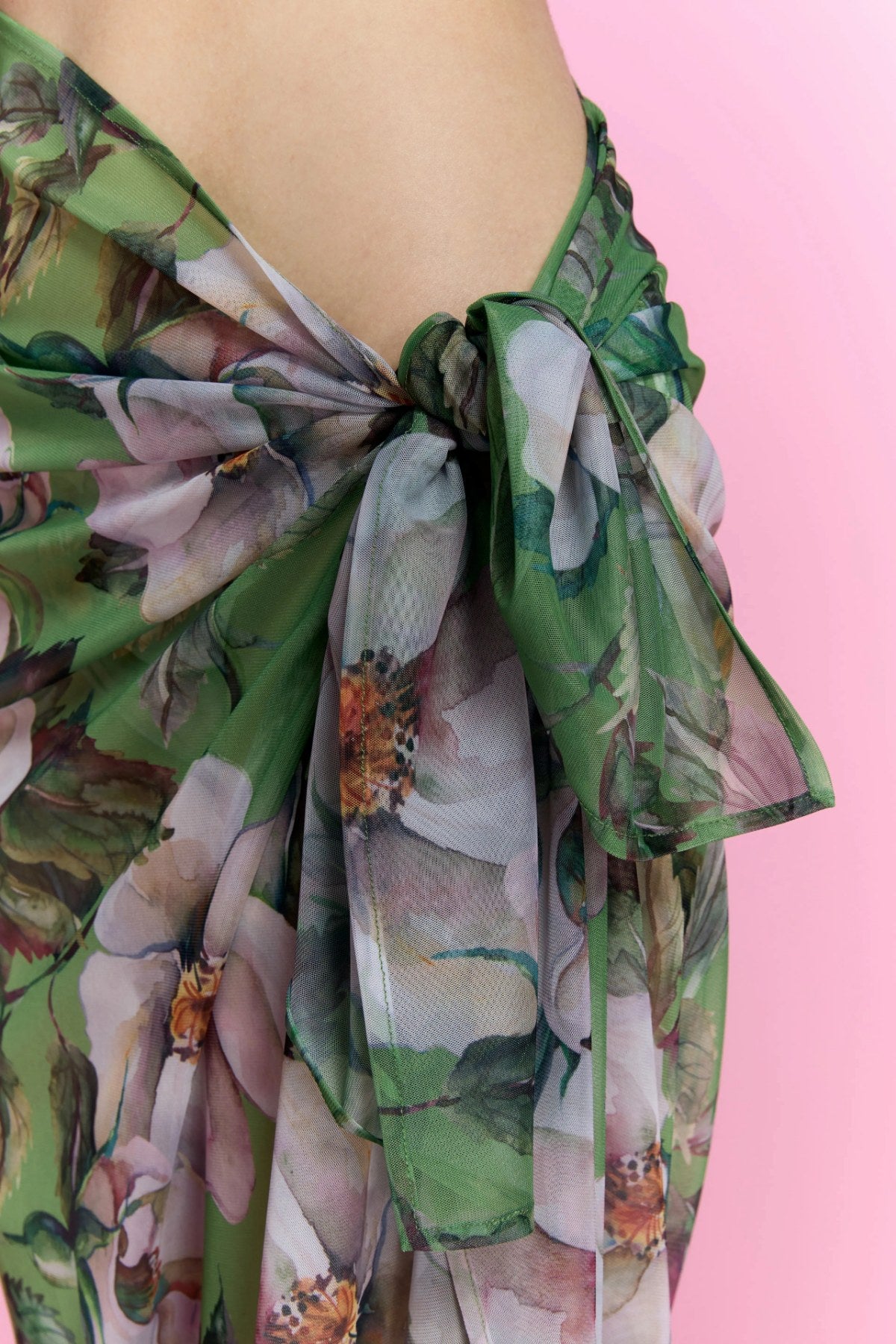 Yeşil zemin üzerine beyaz ve pembe çiçek desenleriyle feminen bir görünüm sunuyor.
