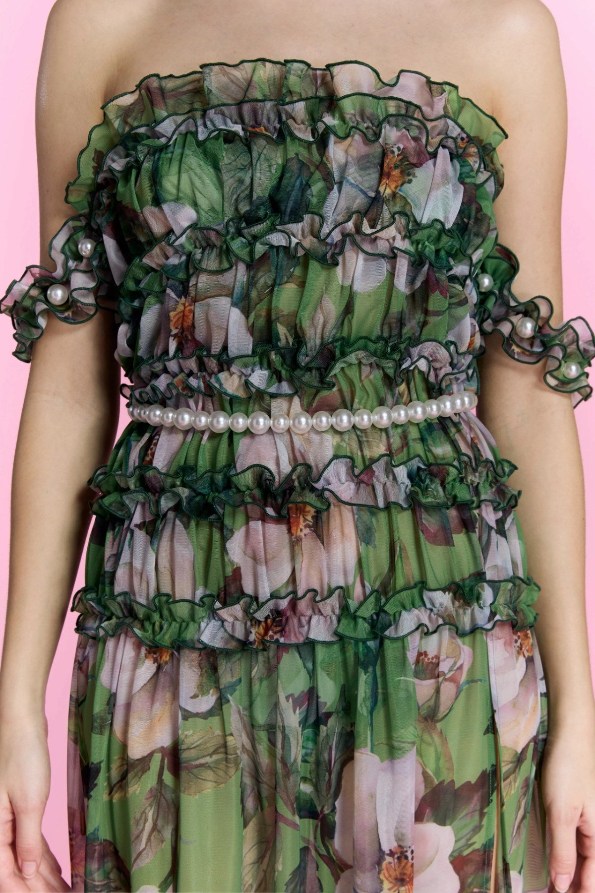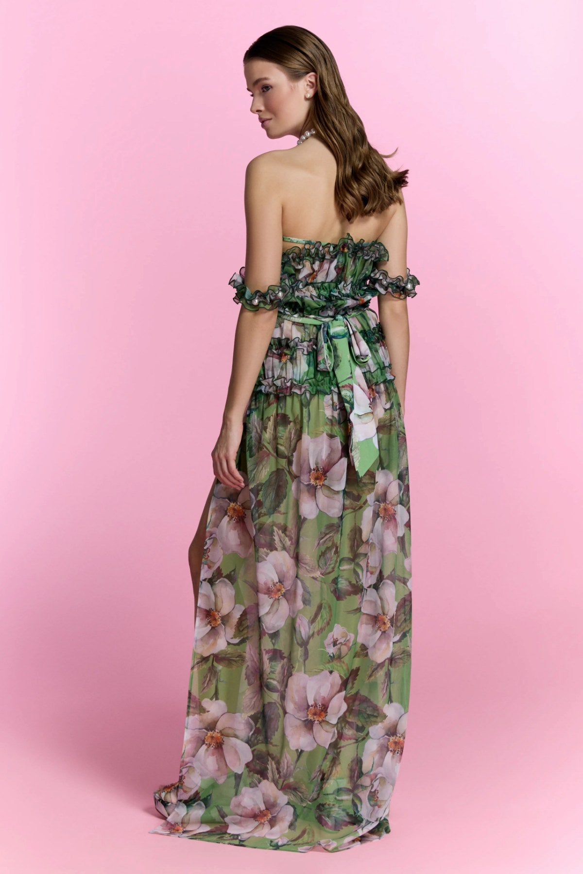 Yeşil zemin üzerine pembe ve beyaz çiçek desenleriyle feminen bir görünüm sunuyor.