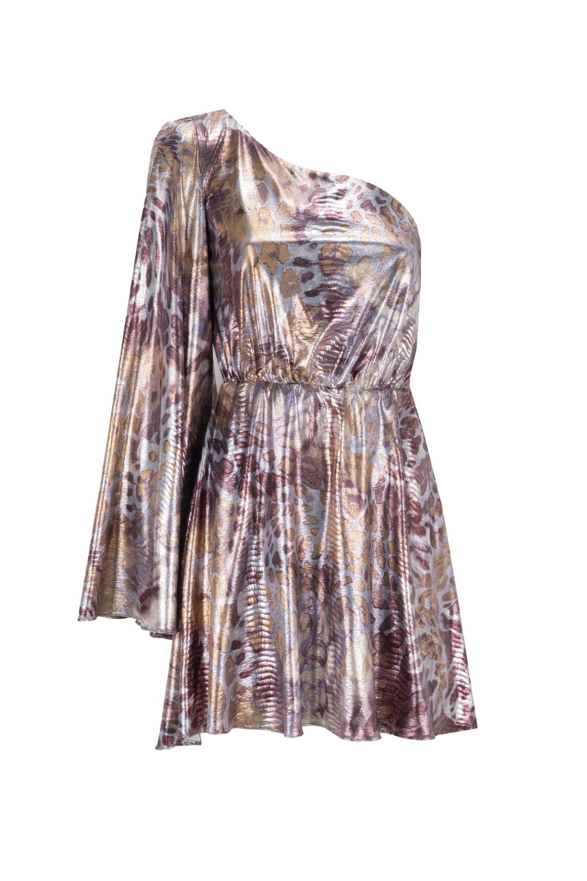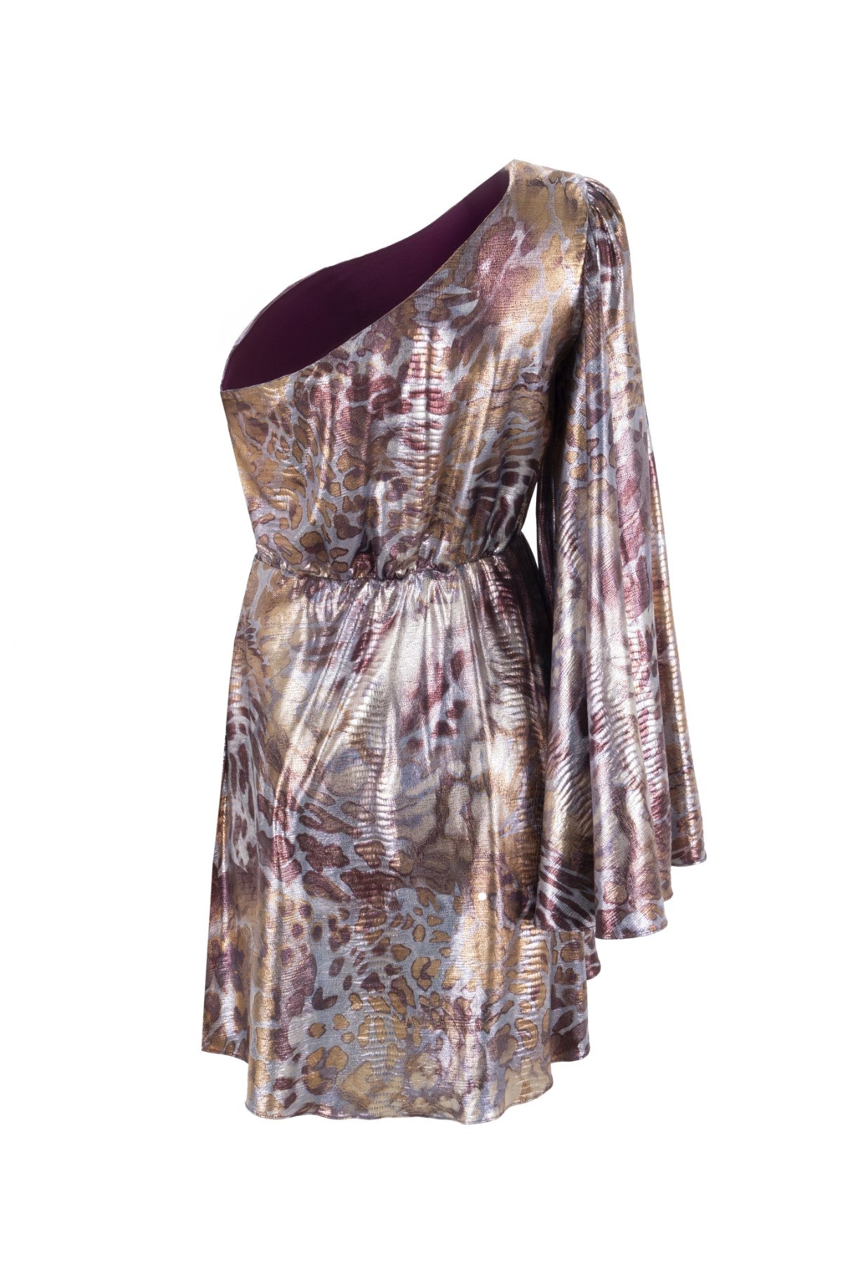 Gold tonlarında, büzgülü gövde detayları olan, parlak kumaştan yapılmış ve midi boy uzunluğunda, sade bir ışıltıya sahip elbisedir. Üretim yeri: Türkiye.