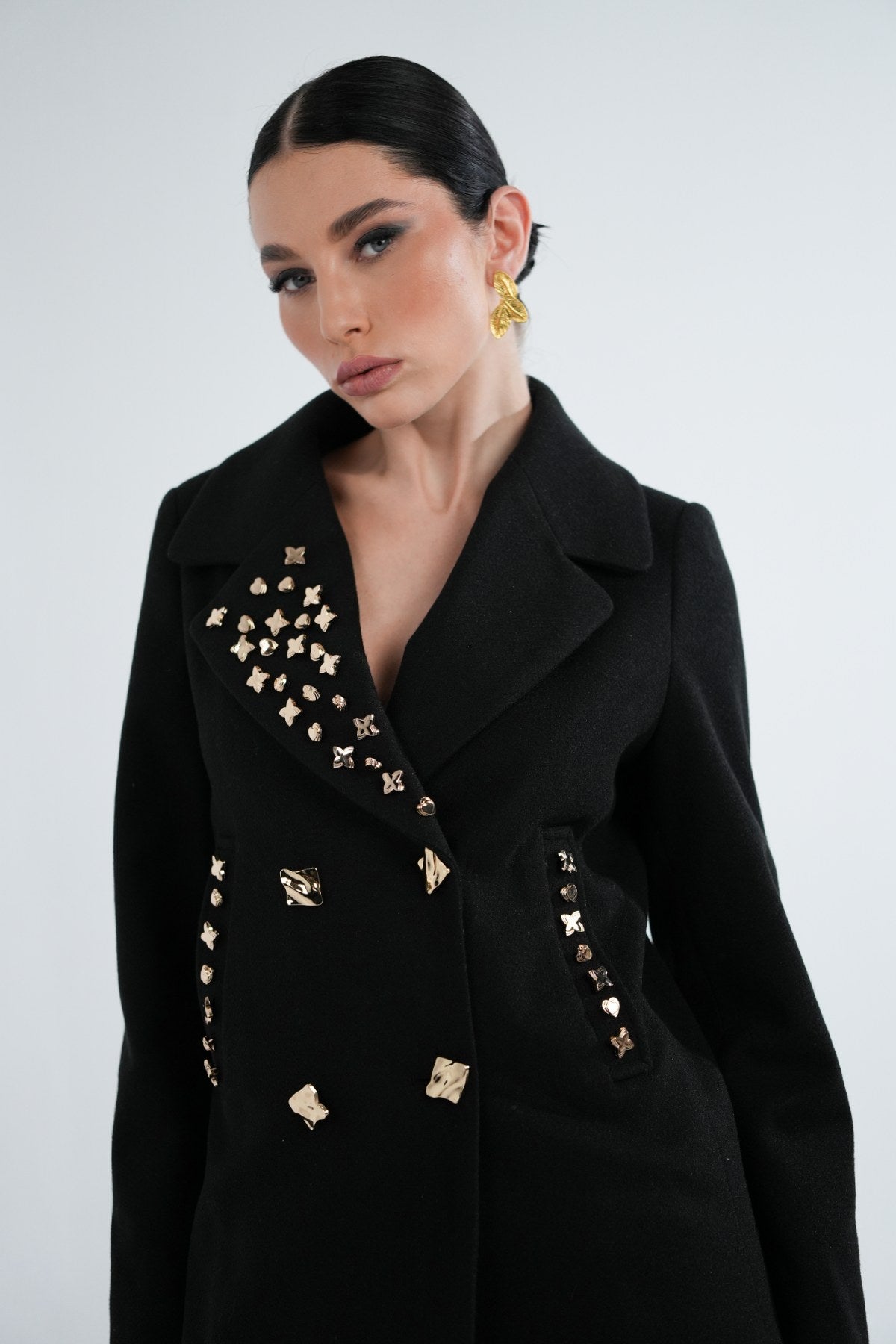 Yaka ve cep kenarları düğme detaylı siyah kaşe kaban.