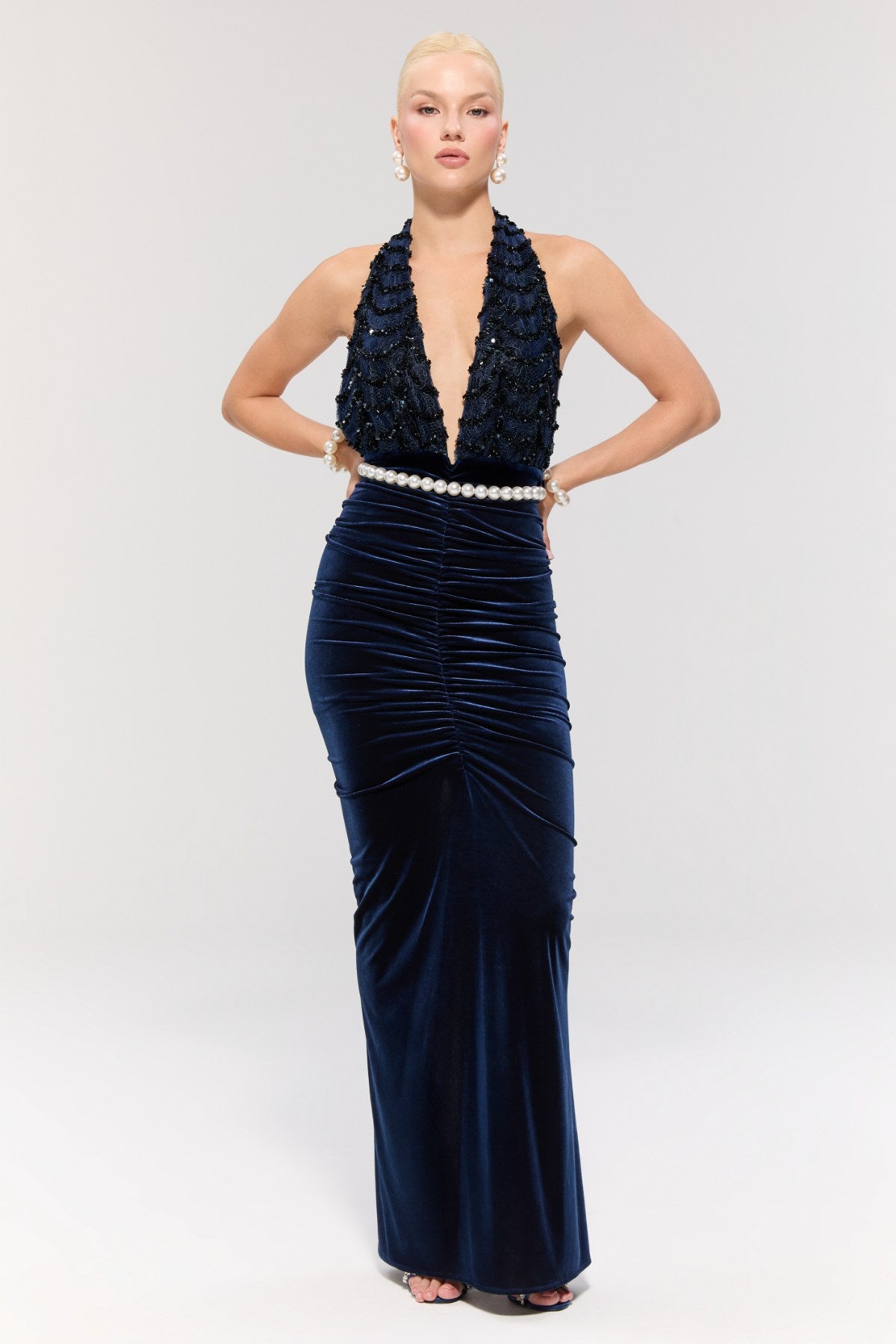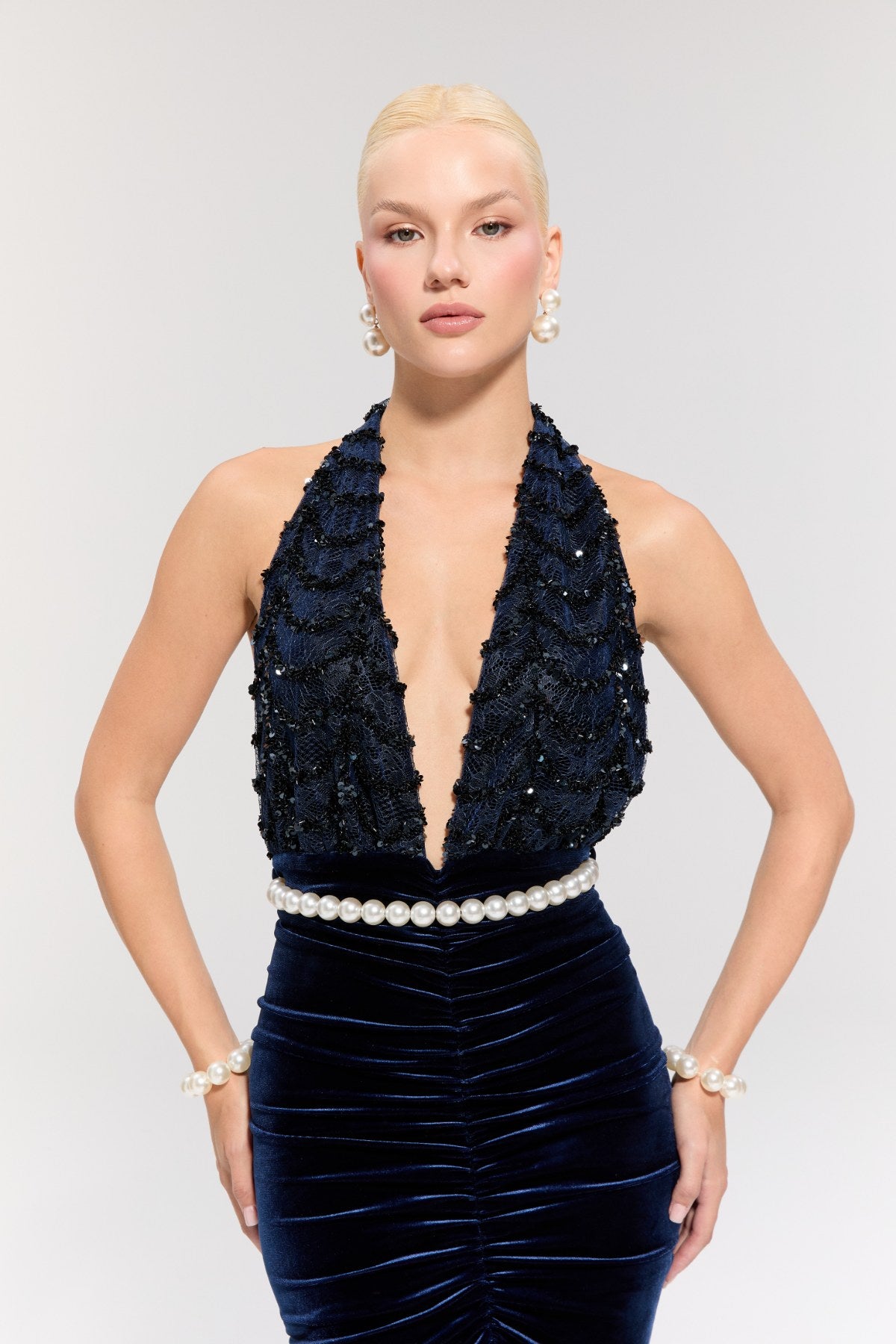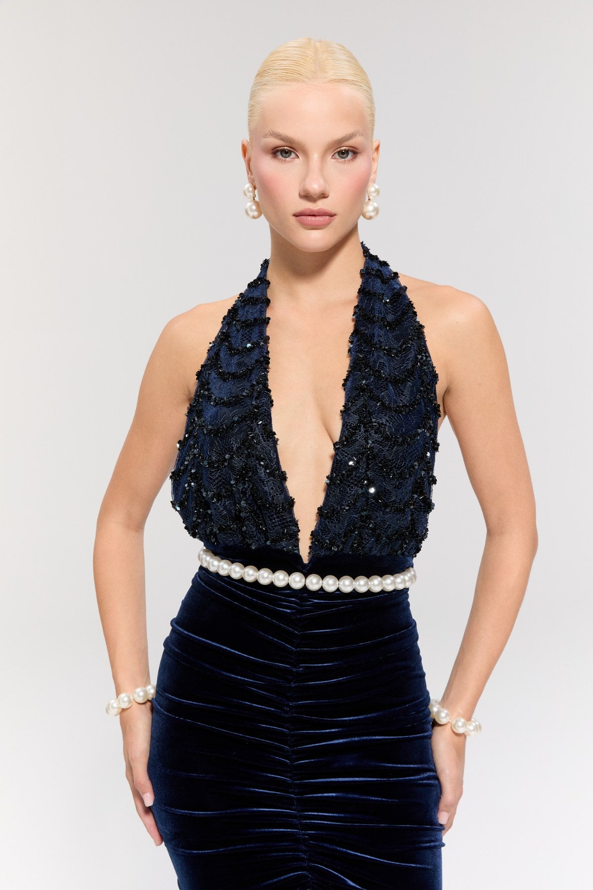 Lacivert kadife dokusu asil bir şıklık sunarken, belindeki inci kemer zarif bir ışıltı katar.