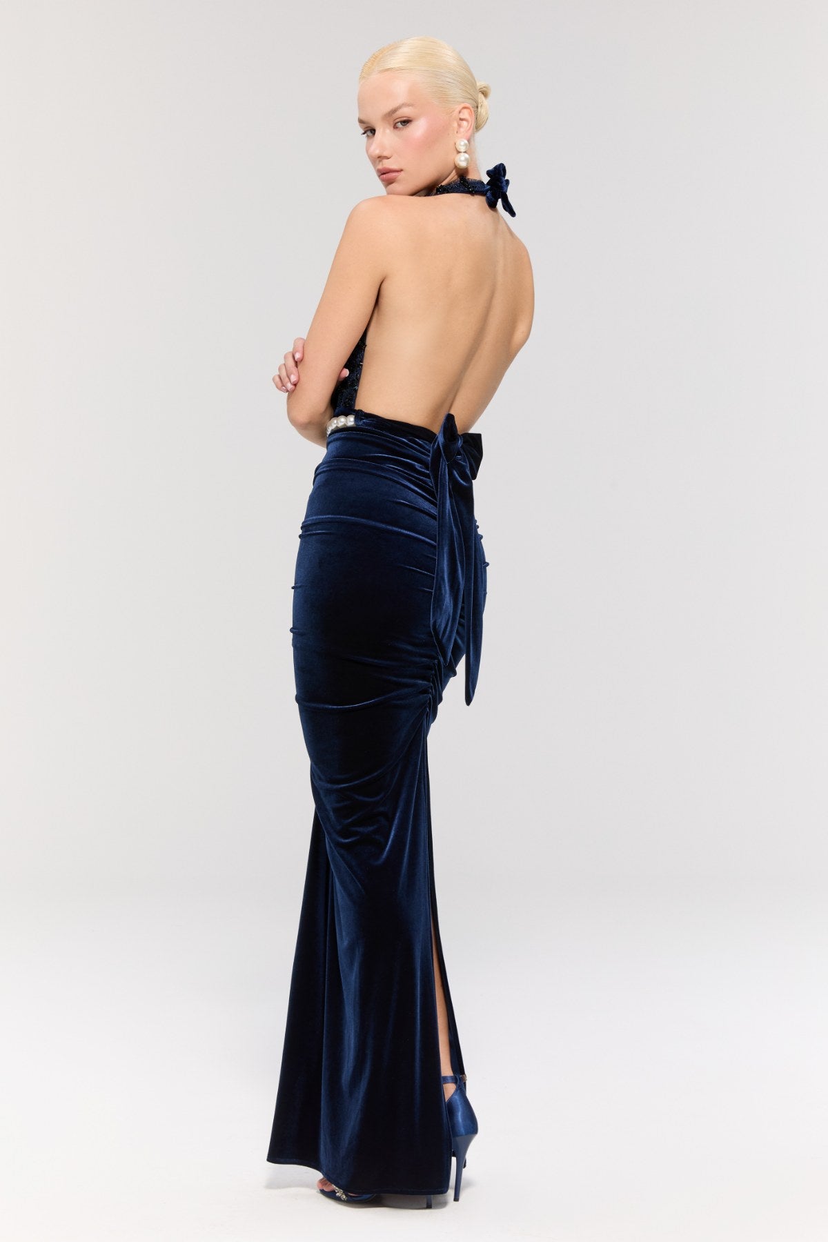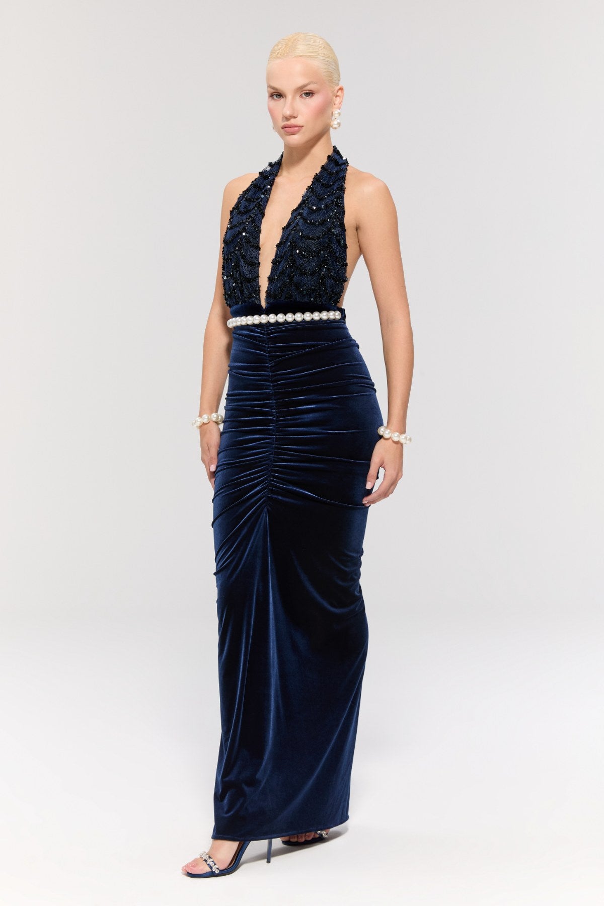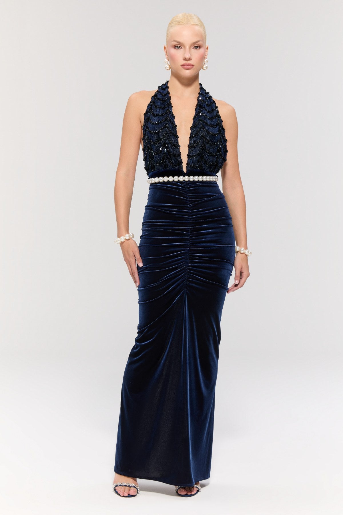 Lacivert kadife dokusu asil bir şıklık sunarken, belindeki inci kemer zarif bir ışıltı katar.