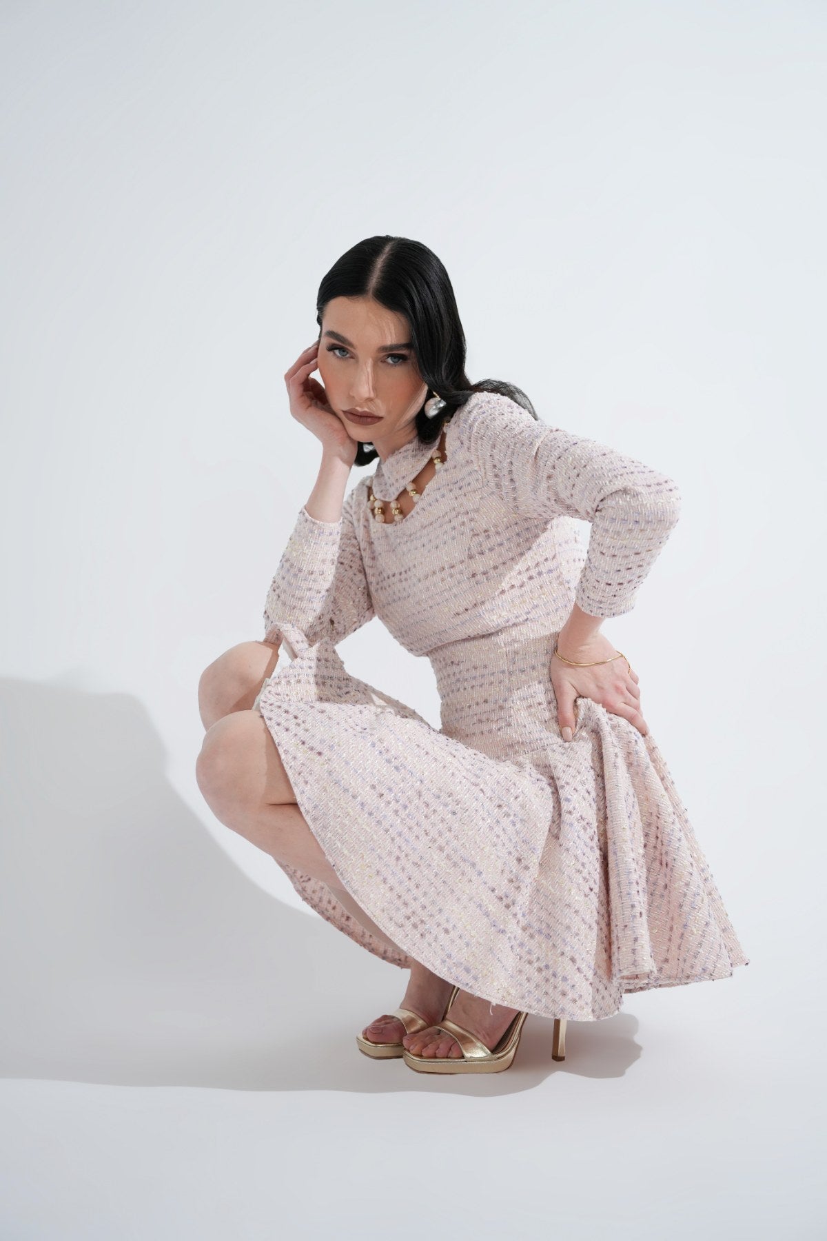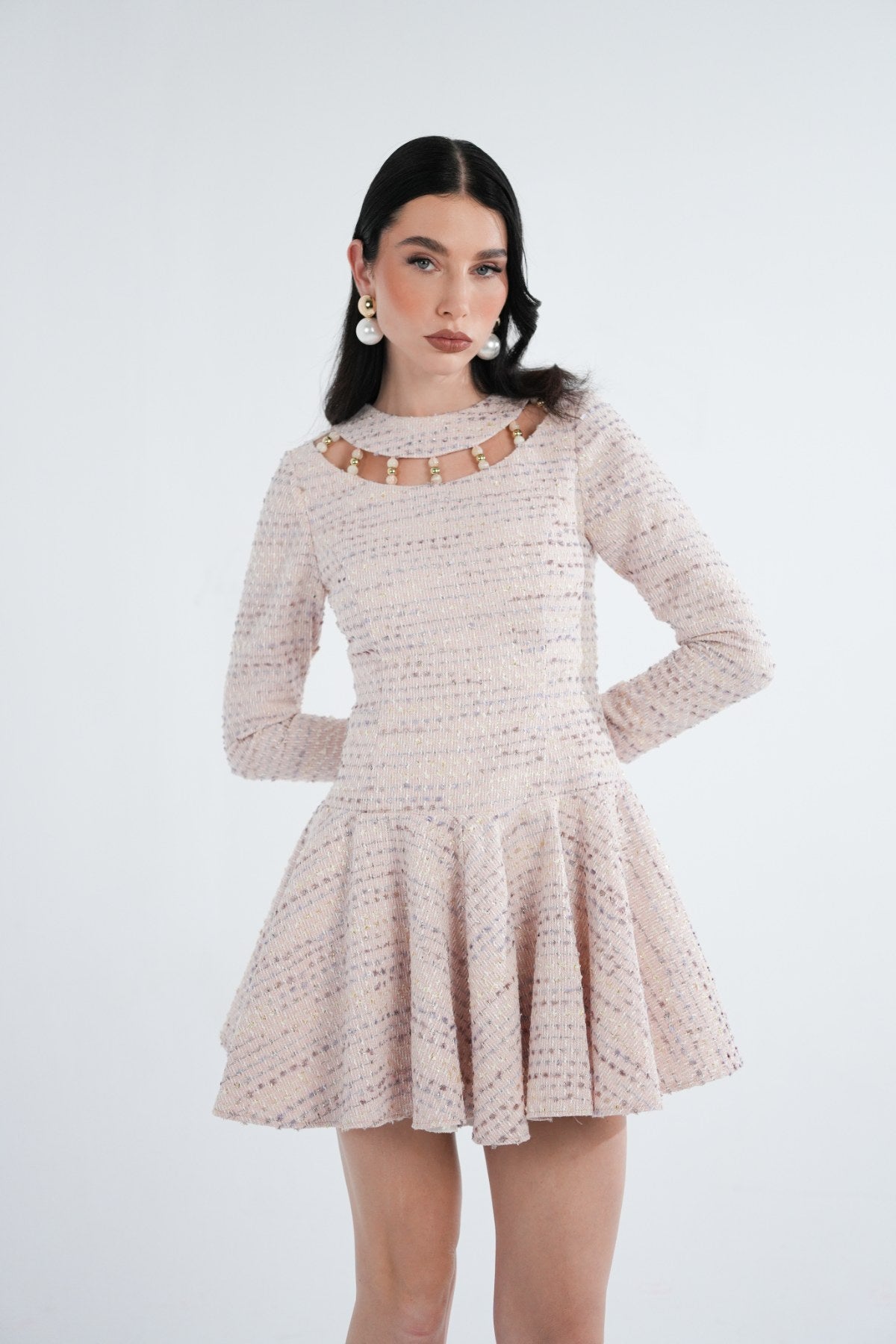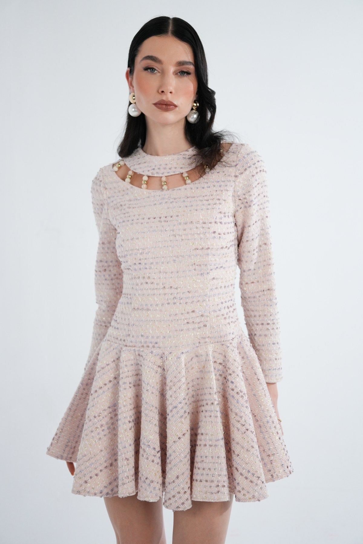 Pembe yumuşak tüvit kumaş, pencereli, boncuk ve şerit detaylı elbise.